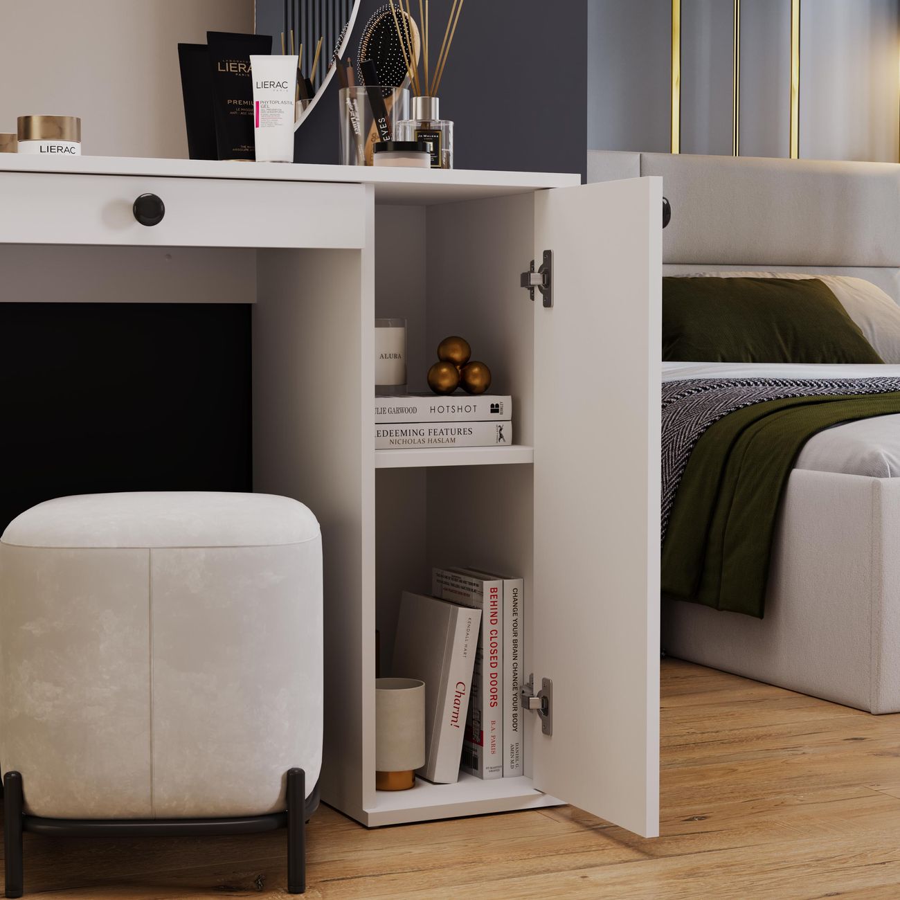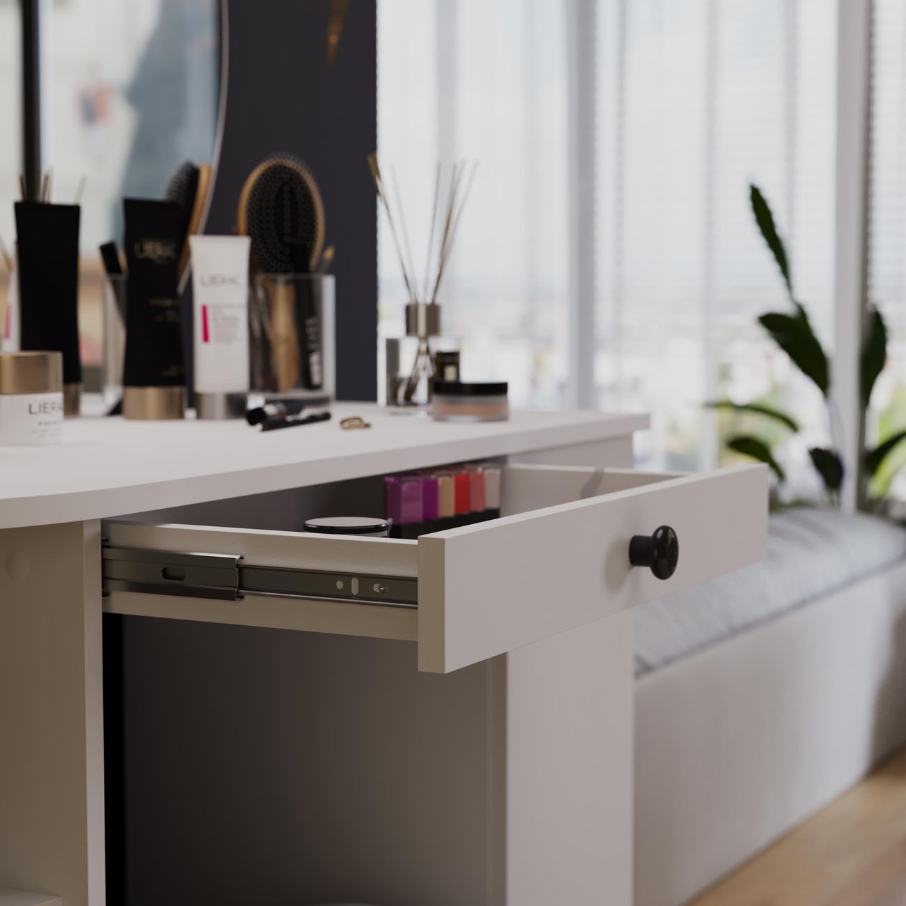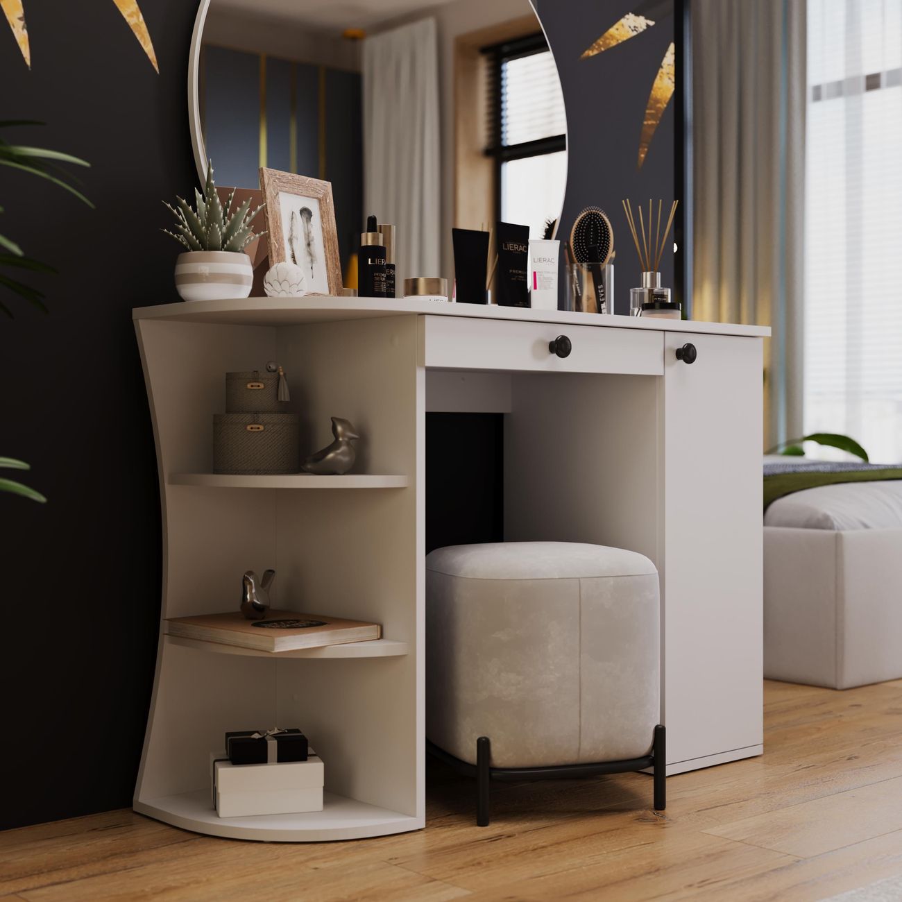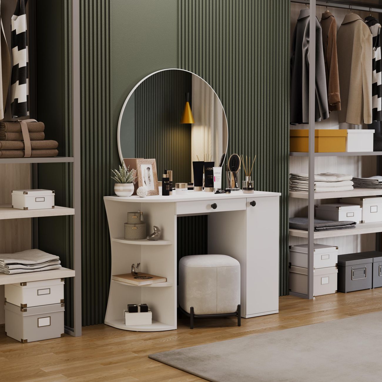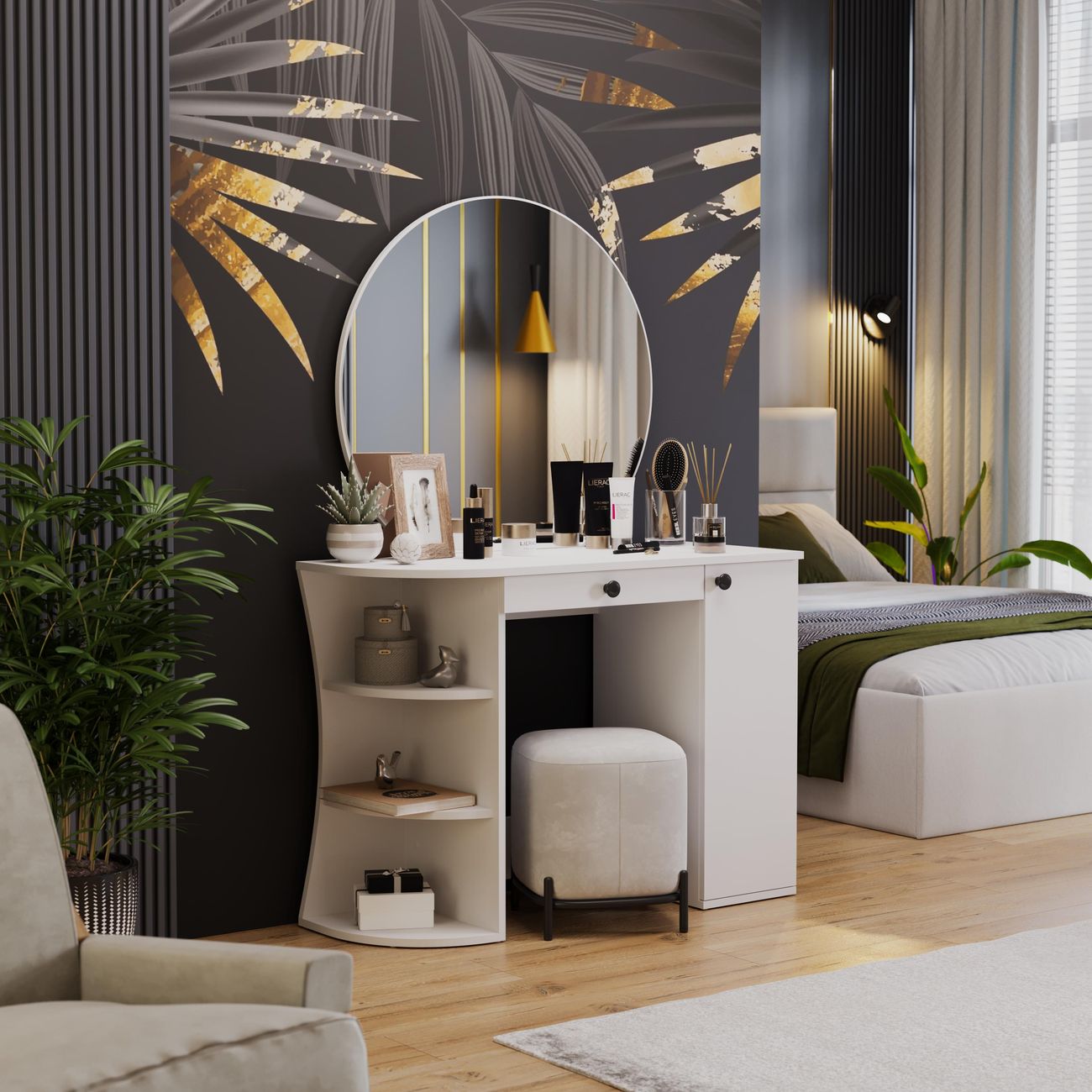 Белый туалетный стол Соло - идеальное место для проведения ежедневных процедур, нанесения макияжа, которое впишется в любой современный интерьер. Классический и минималистичный дизайн, сбалансированная конструкция, доступная цена. Дамский столик предназначен для размещения на нем косметики, парфюмерии, украшения и привести себя в порядок перед зеркалом. Материалы Модель оборудована удобной столешницей, выдвижным ящиком для защиты ваших косметических средств от пыли и прямых солнечных лучей, дополнительных полочек и ящик, круглым зеркалом, которое придает изюминку в дизайне столика. Выдвижной ящик оснащен качественной фурнитурой - шариковые направляющие полного выдвижения. Качественные материалы делают столик для макияжа износостойким, способным прослужить многие годы - используется экологически безопасный ЛДСП - 16 мм. Благодаря трюмо ежедневные процедуры и нанесение макияжа станет комфортнее, удобнее, практичнее и быстрее. Дополнительная информация Поставляется в разобранном виде. Все технические отверстия сделаны на производстве, фурнитура для сборки и инструкция идет в комплекте, также инструкцию Вы можете найти в карточке товара. Прежде чем приступить к сборке, необходимо убедиться в качестве, количестве и соответствии всех деталей. Если таковые выявлены, незамедлительно свяжитесь с площадкой и продавцом, для разрешения вопроса, не приступая к сбору изделия. Товар после сборки возврату и обмену не подлежит.
