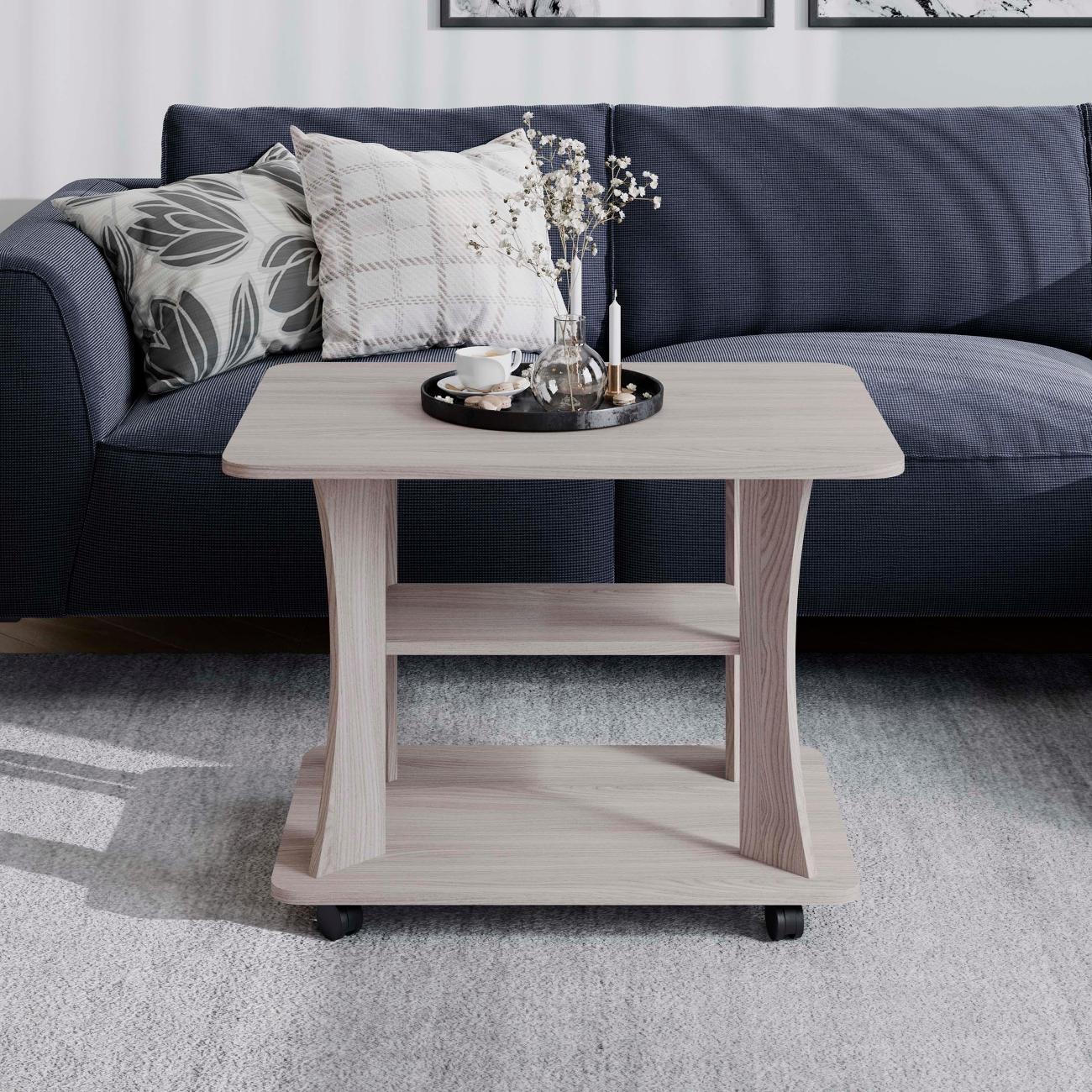 Журнальный стол Тип 8 - классический минималистичный дизайн, сбалансированная конструкция, доступная цена и разнообразие расцветок набора позволяют приобрести подходящую модель для помещения, оформленного в любом стиле. Столик оснащен колесиками с поворотным механизмом - 360, что делает его мобильным. Сочетает в себе компактность и функциональность, подойдет в любой интерьер разного типа: спальня, прихожая, детская, дача. Идеально подойдет для работы с ноутбуком. В нем расположены две полочки для удобства хранения вещей.  Столешница имеет скругленные углы. Данная модель мебели выполнена из прочного безопасного ЛДСП - 16 мм. Он представляет собой качественной продукцией и экологически чистым изделием. Отличное решение как мебель в гостиную для вашего дома, использовав его как придиванный стол.