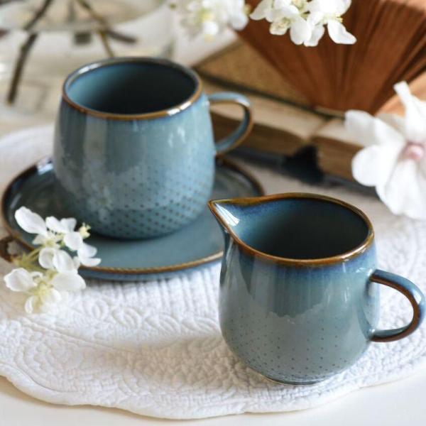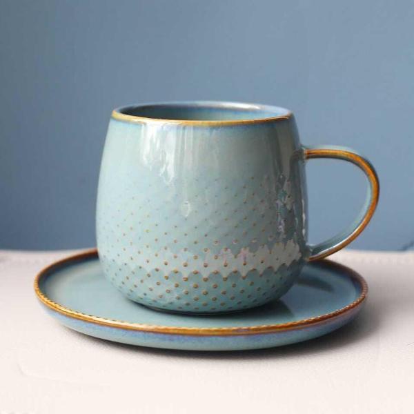 Эффектный набор кружек для чая большого объема сочетает классический выбор цвета и оригинальное дизайнерское решение. Приятная цветовая гамма сочетается с декором в виде маленьких фактурных горошин. Чайные пары украшены окантовкой и рельефным декором, слегка оттененным медным цветом. Чайная пара фарфор имеет глянцевое покрытие. Глазурь защищает поверхность чашки для чая от механических повреждений, придавая красивый блеск.