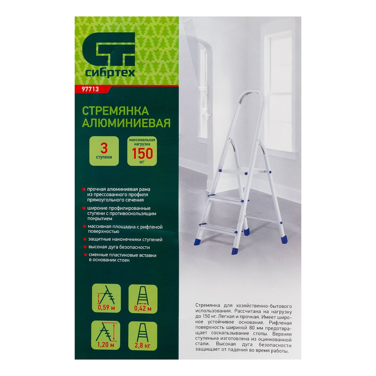 Лестница «Сибртех» (97713) оборудована тремя профилированными ступенями, что позволяет удобно работать на высоте. Рифленая поверхность предотвращает скольжение. Для безопасной эксплуатации изделие оснащено высокой дугой. Модель произведена из прочного алюминиевого сплава, поэтому характеризуется повышенной устойчивостью к износу, деформации и повреждениям, способна выдерживать нагрузку до 150 кг без потери потребительских качеств. Специальные накладки на ножках защищают напольное покрытие от образования потертостей и царапин во время использования. Благодаря продуманной форме лестница надежно фиксируется в рабочем положении. Размер изделия в сложенном виде — 1335 х 410 х 110 мм.