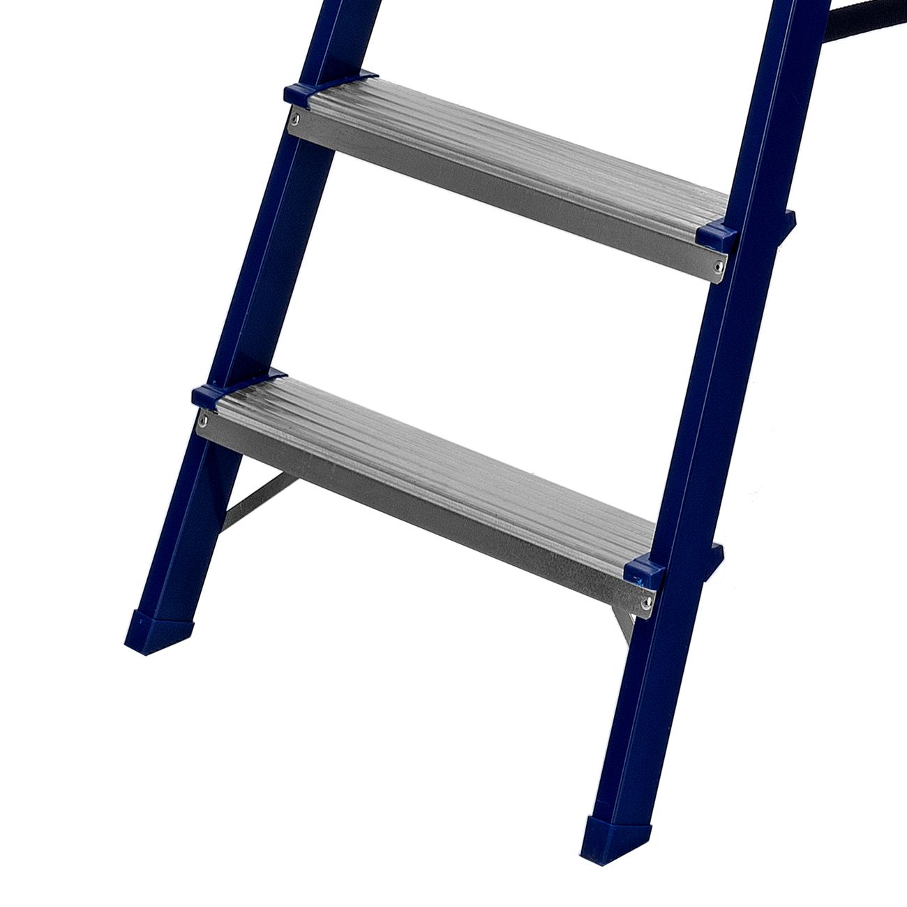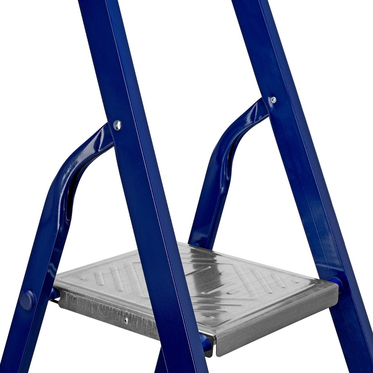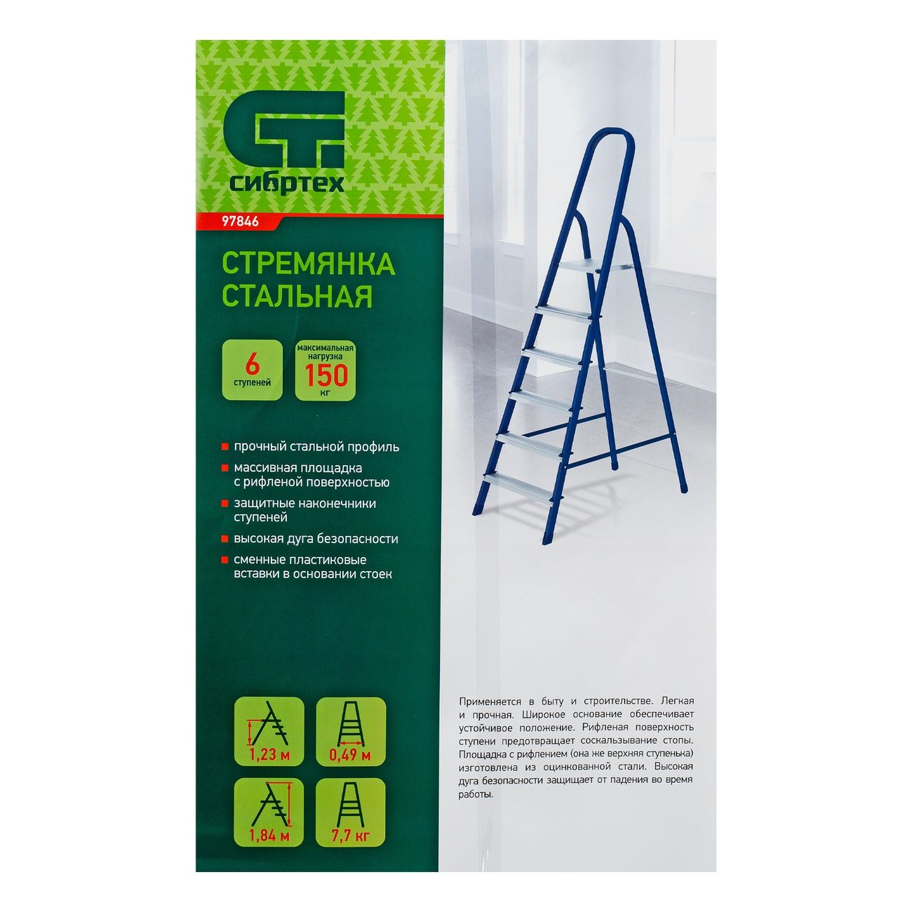 Лестница «Сибртех» (97846) обладает прочной стальной рамой прямоугольного сечения. Материал изготовления характеризуется устойчивостью к износу, деформации, повреждениям и образованию коррозии. Оптимальный угол стоек при раздвигании и четыре опоры с пластиковыми наконечниками обеспечивают надежную фиксацию модели на напольном покрытии. За высокую дугу удобно держаться и сохранять равновесие при работе на высоте. Стремянка оснащена шестью широкими ступеньками, которые помогают удобно подняться на рабочую площадку. Благодаря профилированной поверхности ноги не скользят при подъеме и спуске. Лестница способна выдерживать нагрузку до 150 кг. Размер в сложенном состоянии — 2000 х 475 х 105 мм, что обеспечивает удобство хранения.