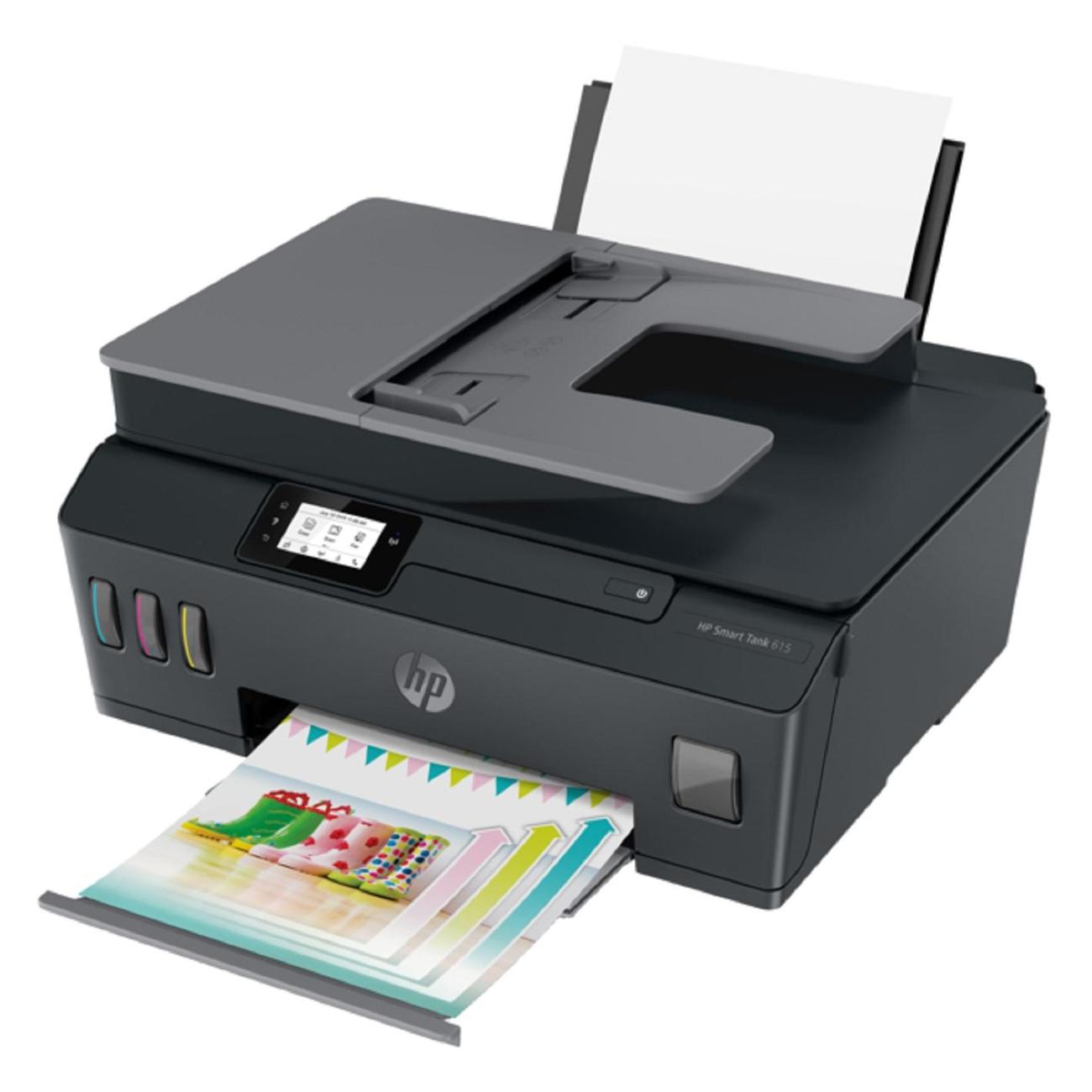 Цветное струйное МФУ HP Smart Tank 615 AiO (Y0F71A/I) обладает специальными механизмами для простой замены печатающих головок с системой защиты от проливаний. В комплекте поставляются шесть картриджей серии GT50, три из них — черные. Встроенный датчик обеспечивает контроль уровня расхода чернил.