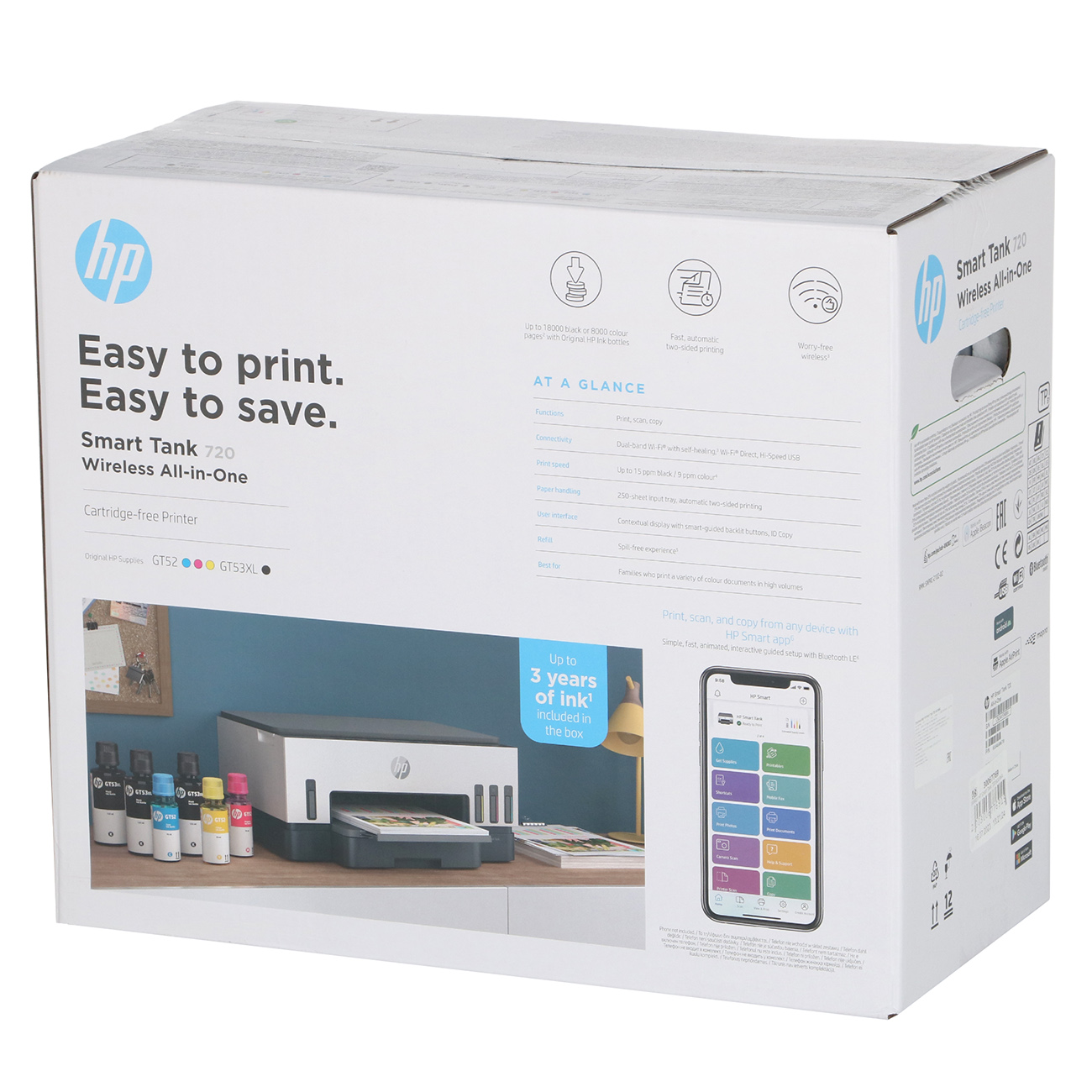Струйное МФУ HP Smart Tank 720 (6UU46A) печатной нагрузкой до 5000 страниц в месяц объединяет функции копира, цветного принтера и сканера. Устройство поддерживает автоматическую двустороннюю печать разрешением до 1200x1200 dpi, получаемые с его помощью изображения устойчивы к смазыванию, смачиванию, воздействию ультрафиолета. Максимальный формат совместимых печатных носителей — А4, плотность бумаги (обычной, для фото) — 60-300 г/м².