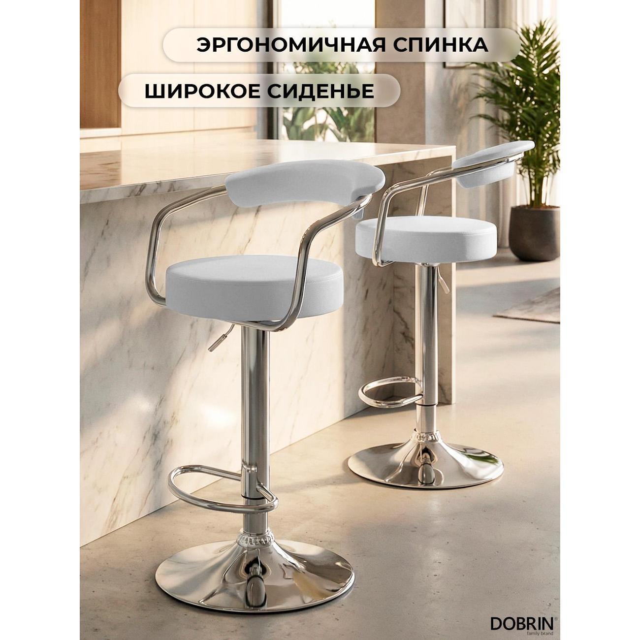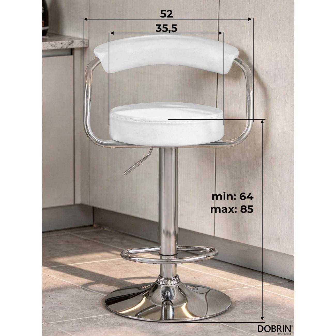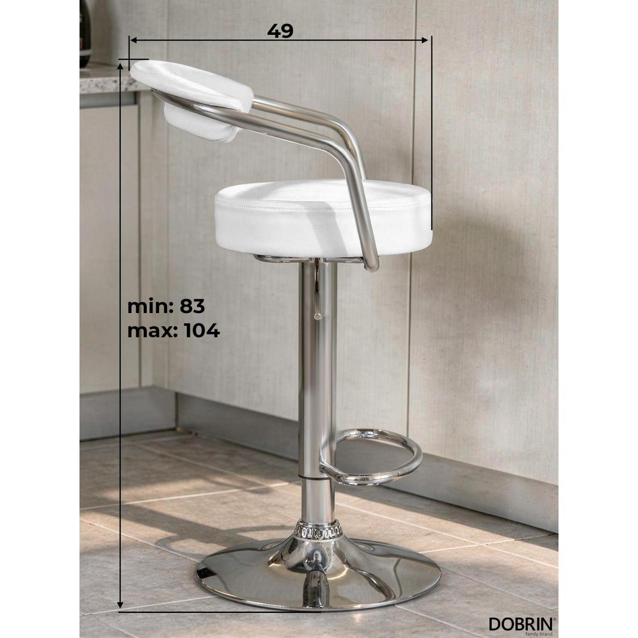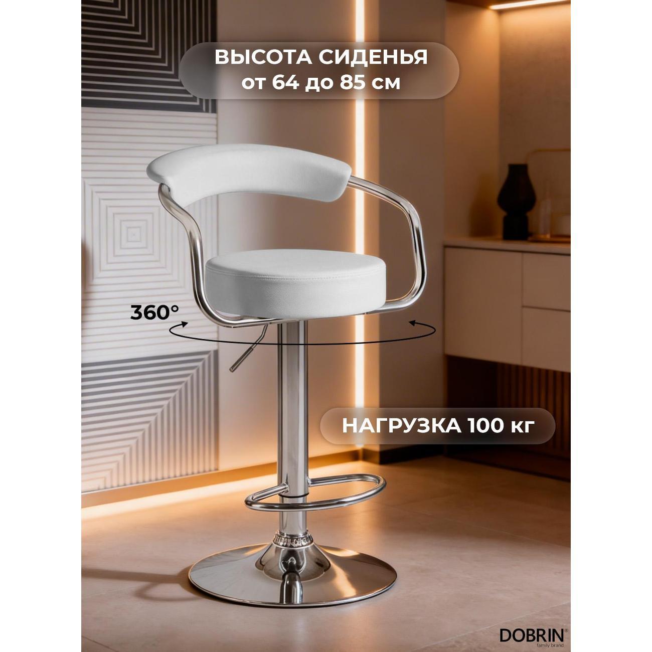 Стул барный DOBRIN MARTA (белый). Сиденье искусственная кожа, сиденье круглой формы, мягкое, с мягкой спинкой. Основание сделано из прочного металла. Есть механизм вращения. Стул с подлокотниками высотой 17 см. Стул с газлифтом, с регулировкой высоты максимальной высотой 104 см и минимальной высотой 83 см, ширина 52 см, глубина 49 см. Сиденье с максимальной высотой 85 см и минимальной высотой 64 см. Требуется простейшая сборка, удобная инструкция прилагается. Товар изготовлен по уникальному дизайну и эскизу DOBRIN с любовью к мебели. Максимальная нагрузка 100 кг. Гарантийный срок 12 месяцев и минимальный срок службы от 5 лет. Отлично подойдет барный стул для кухни, бара, кафе, ресторана, на дачу, парикмахерскую, в салон красоты или барбершоп