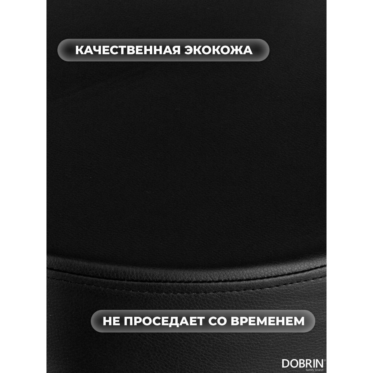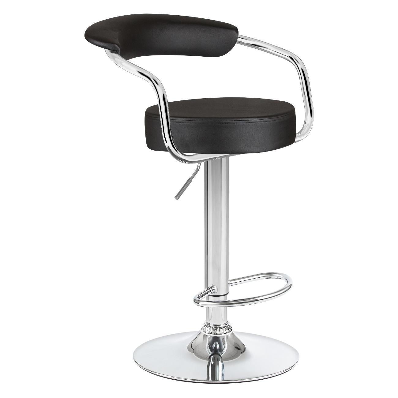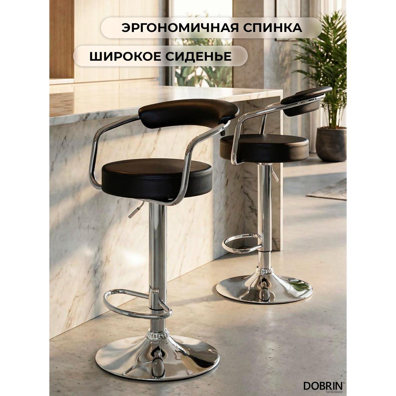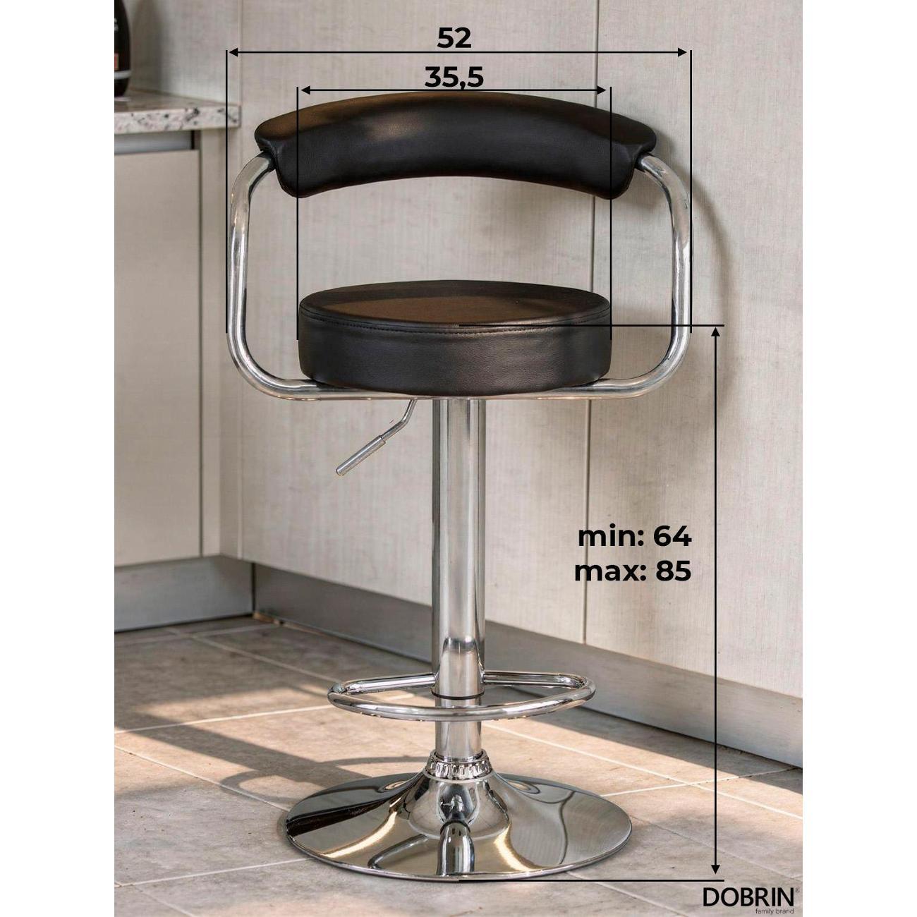 Стул барный DOBRIN MARTA (чёрный). Сиденье искусственная кожа, сиденье круглой формы, мягкое, с мягкой спинкой. Основание сделано из прочного металла. Есть механизм вращения. Стул с подлокотниками высотой 17 см. Стул с газлифтом, с регулировкой высоты максимальной высотой 104 см и минимальной высотой 83 см, ширина 52 см, глубина 49 см. Сиденье с максимальной высотой 85 см и минимальной высотой 64 см. Требуется простейшая сборка, удобная инструкция прилагается. Товар изготовлен по уникальному дизайну и эскизу DOBRIN с любовью к мебели. Максимальная нагрузка 100 кг. Гарантийный срок 12 месяцев и минимальный срок службы от 5 лет. Отлично подойдет барный стул для кухни, бара, кафе, ресторана, на дачу, парикмахерскую, в салон красоты или барбершоп
