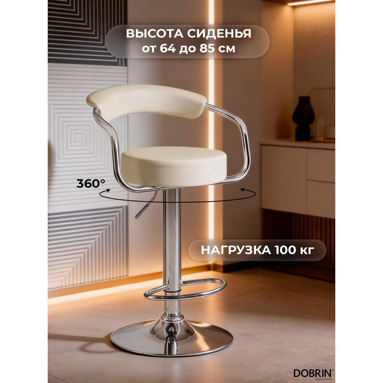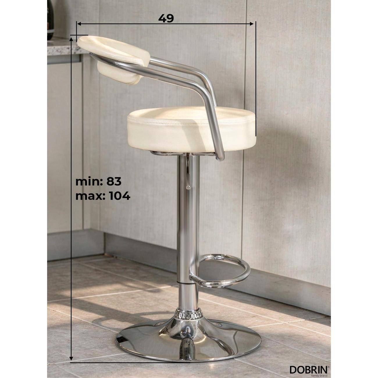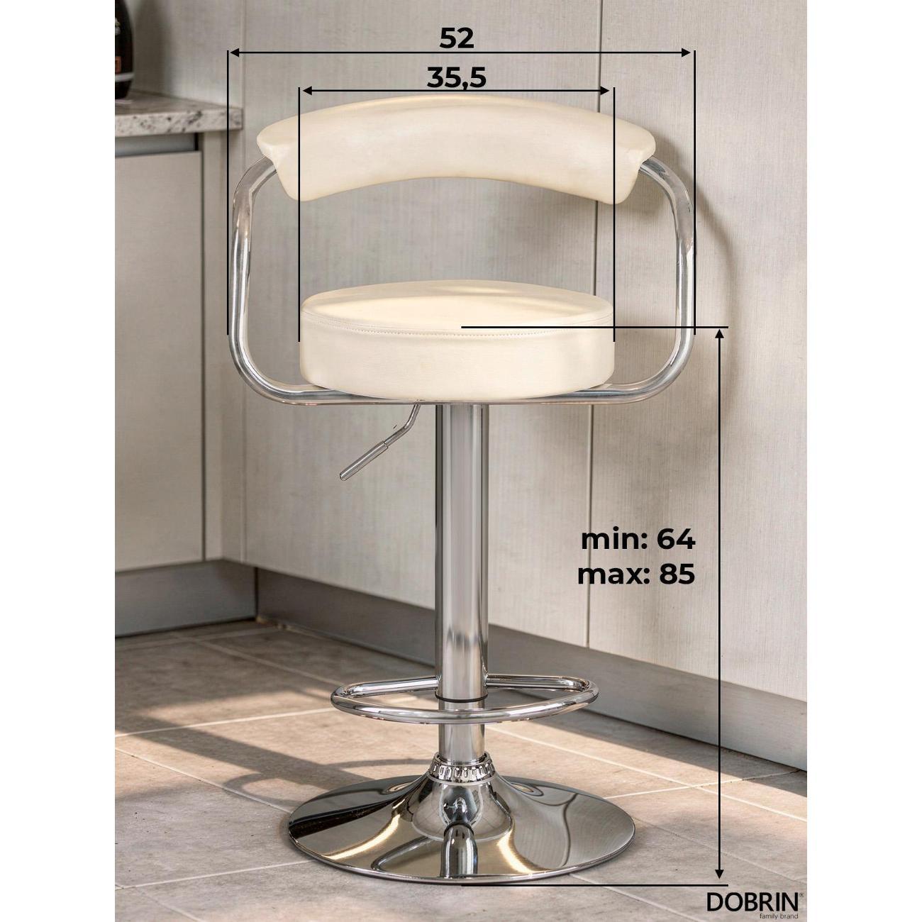 Стул барный DOBRIN MARTA (кремовый). Сиденье искусственная кожа, сиденье круглой формы, мягкое, с мягкой спинкой. Основание сделано из прочного металла. Есть механизм вращения. Стул с подлокотниками высотой 17 см. Стул с газлифтом, с регулировкой высоты максимальной высотой 104 см и минимальной высотой 83 см, ширина 52 см, глубина 49 см. Сиденье с максимальной высотой 85 см и минимальной высотой 64 см. Требуется простейшая сборка, удобная инструкция прилагается. Товар изготовлен по уникальному дизайну и эскизу DOBRIN с любовью к мебели. Максимальная нагрузка 100 кг. Гарантийный срок 12 месяцев и минимальный срок службы от 5 лет. Отлично подойдет барный стул для кухни, бара, кафе, ресторана, на дачу, парикмахерскую, в салон красоты или барбершоп