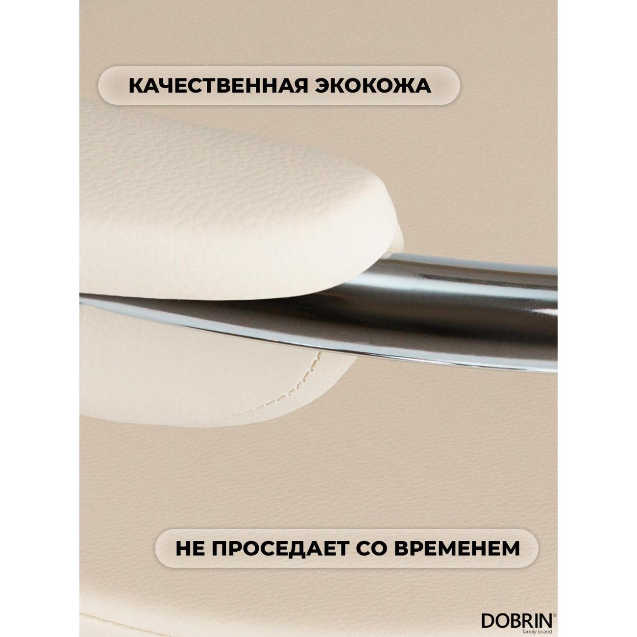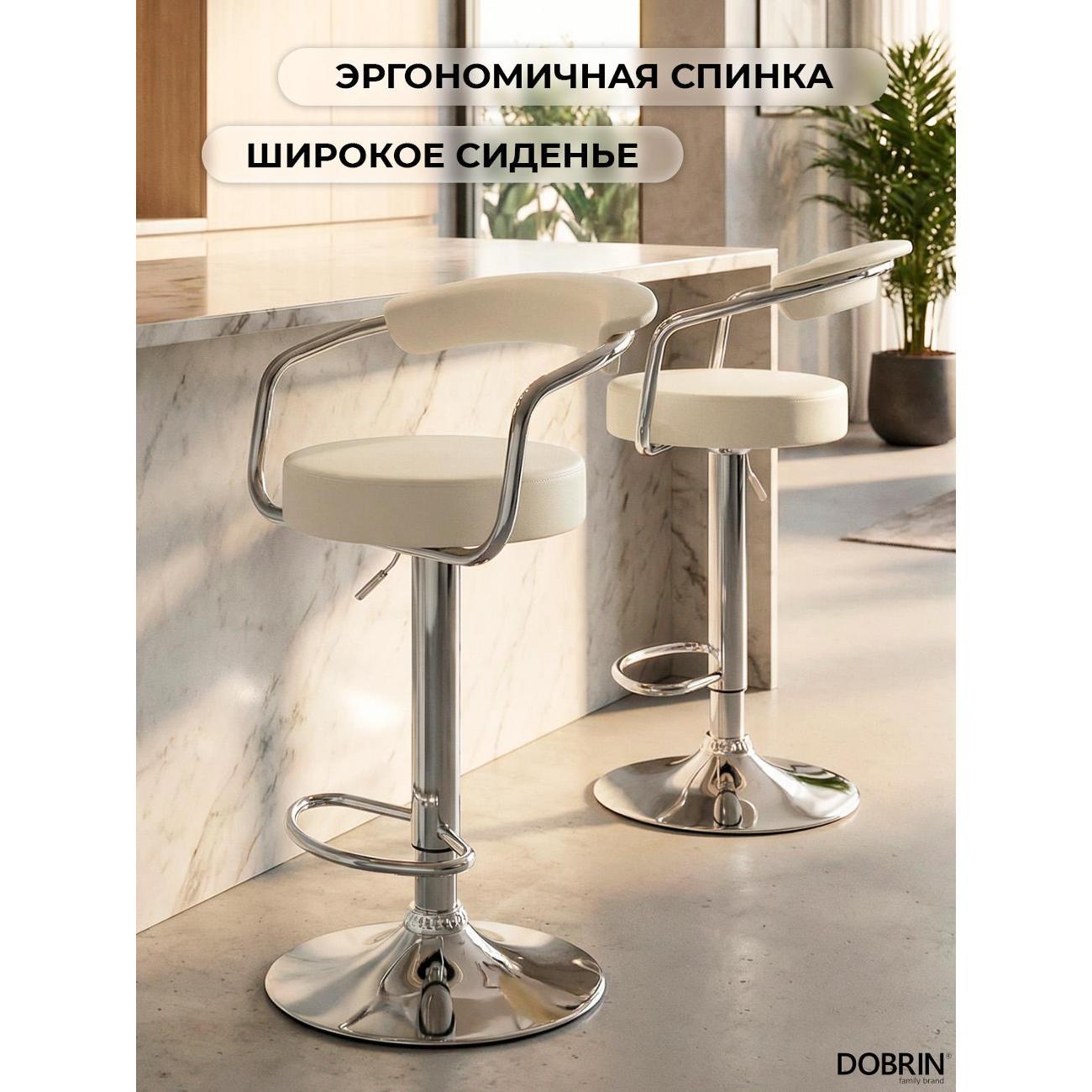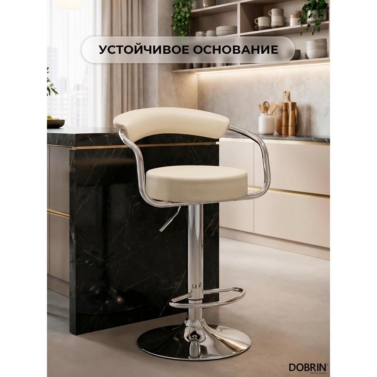 Стул барный DOBRIN MARTA (кремовый). Сиденье искусственная кожа, сиденье круглой формы, мягкое, с мягкой спинкой. Основание сделано из прочного металла. Есть механизм вращения. Стул с подлокотниками высотой 17 см. Стул с газлифтом, с регулировкой высоты максимальной высотой 104 см и минимальной высотой 83 см, ширина 52 см, глубина 49 см. Сиденье с максимальной высотой 85 см и минимальной высотой 64 см. Требуется простейшая сборка, удобная инструкция прилагается. Товар изготовлен по уникальному дизайну и эскизу DOBRIN с любовью к мебели. Максимальная нагрузка 100 кг. Гарантийный срок 12 месяцев и минимальный срок службы от 5 лет. Отлично подойдет барный стул для кухни, бара, кафе, ресторана, на дачу, парикмахерскую, в салон красоты или барбершоп