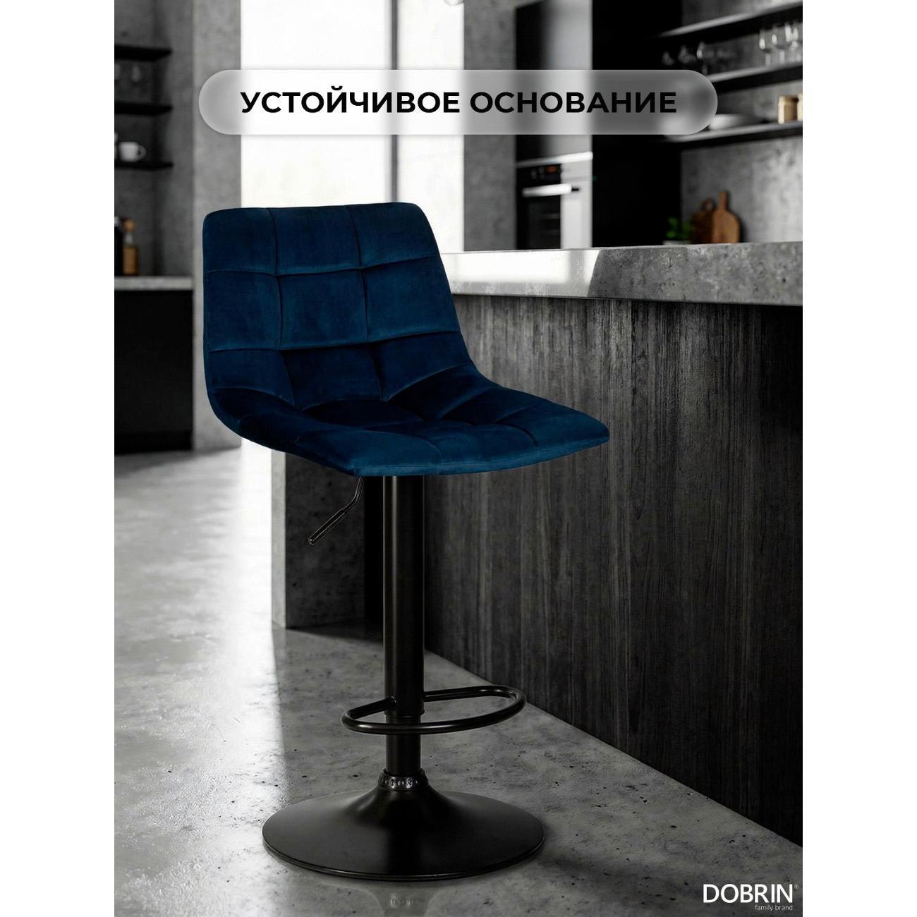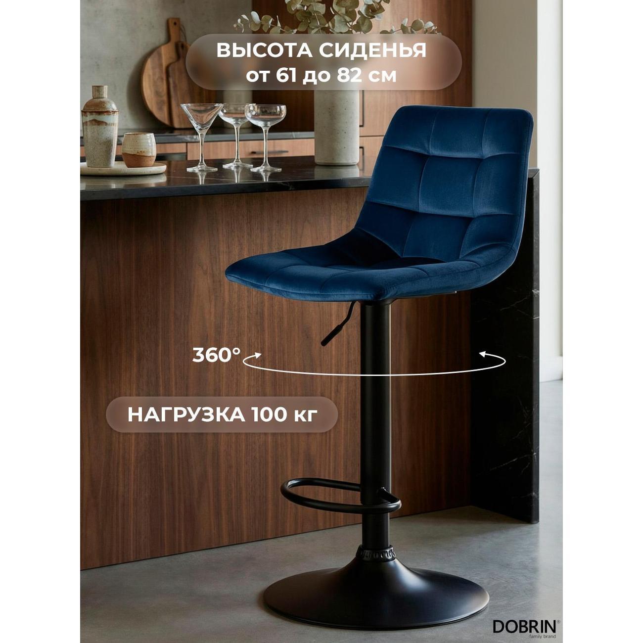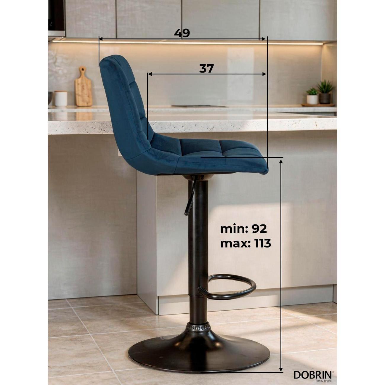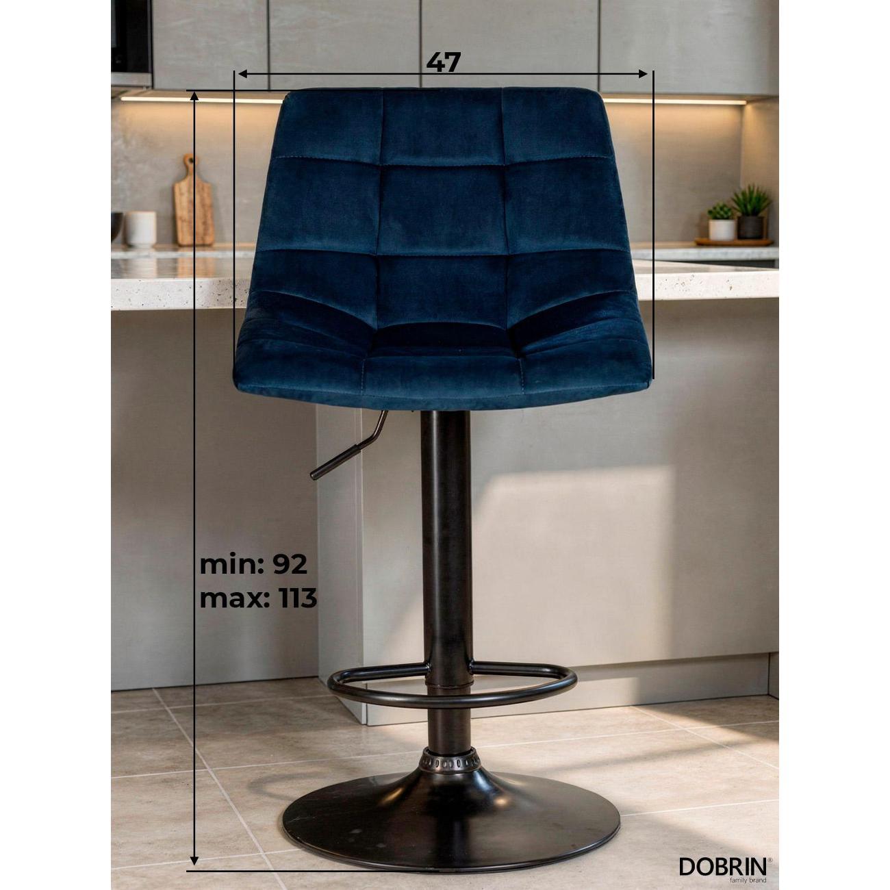 Стул барный DOBRIN TAILOR BLACK (синий велюр (MJ9-117)). Сиденье велюр искусственный, сиденье фигурной формы, мягкое, с мягкой спинкой. Основание сделано из прочного металла. Есть механизм вращения. Стул без подлокотников. Стул с газлифтом, с регулировкой высоты максимальной высотой 113 см и минимальной высотой 92 см, ширина 47 см, глубина 49 см. Сиденье с максимальной высотой 82 см и минимальной высотой 61 см. Требуется простейшая сборка, удобная инструкция прилагается. Товар изготовлен по уникальному дизайну и эскизу DOBRIN с любовью к мебели. Максимальная нагрузка 100 кг. Гарантийный срок 12 месяцев и минимальный срок службы от 5 лет. Отлично подойдет барный стул для кухни, бара, кафе, ресторана, на дачу, парикмахерскую, в салон красоты или барбершоп