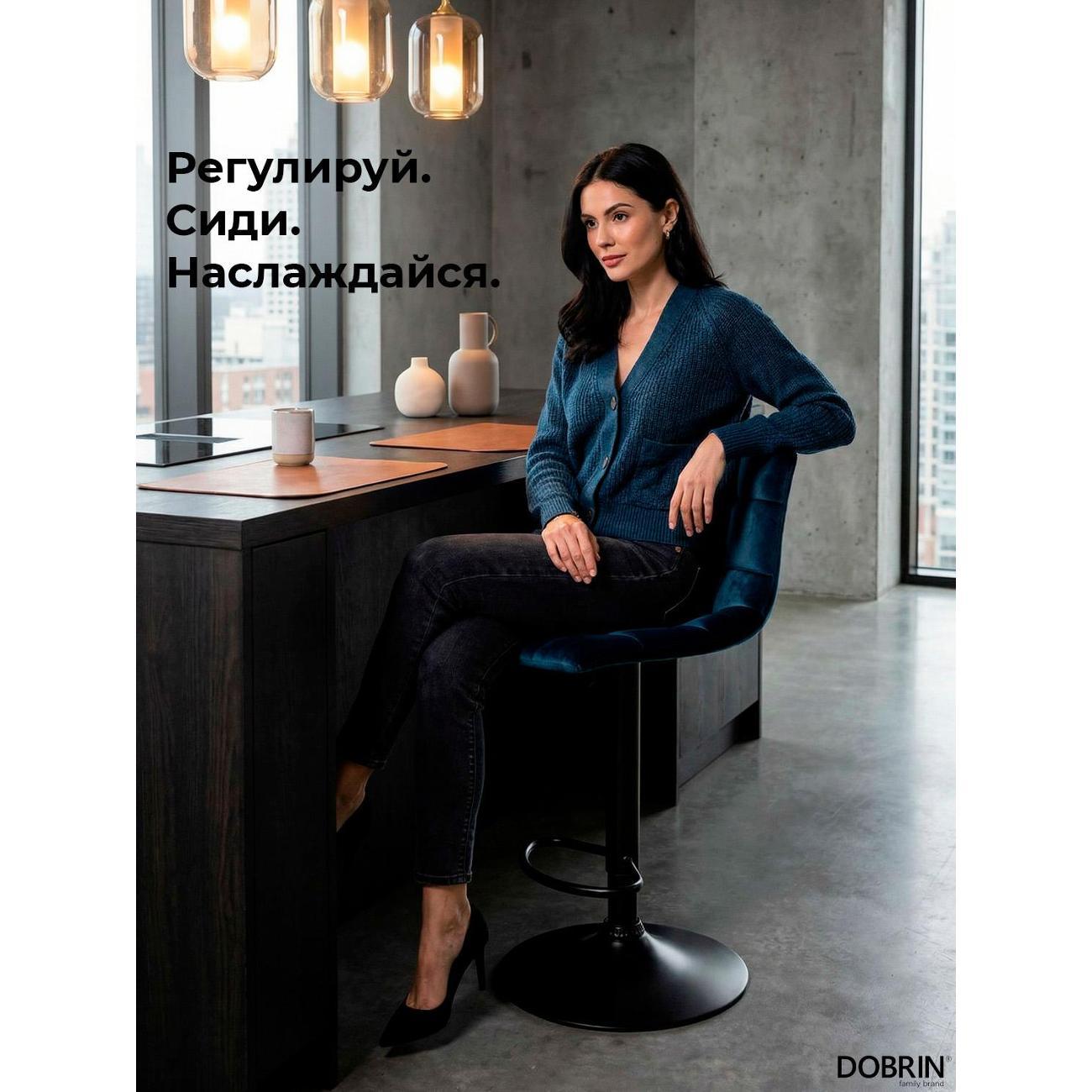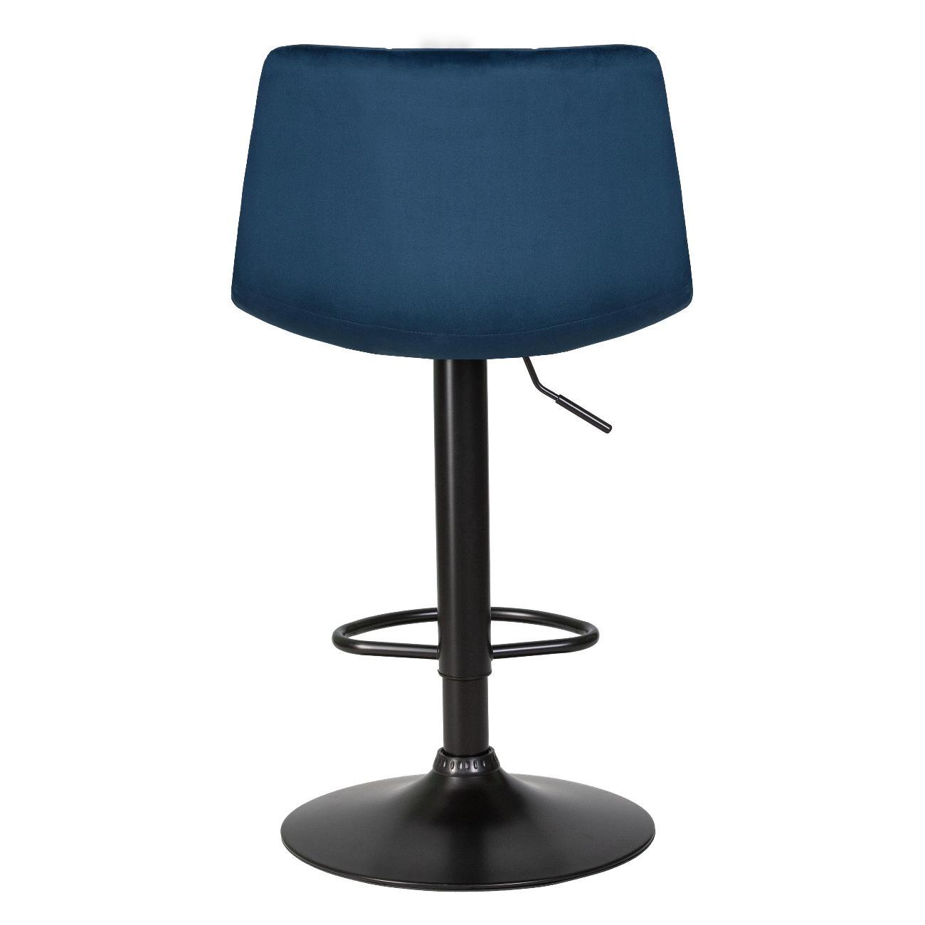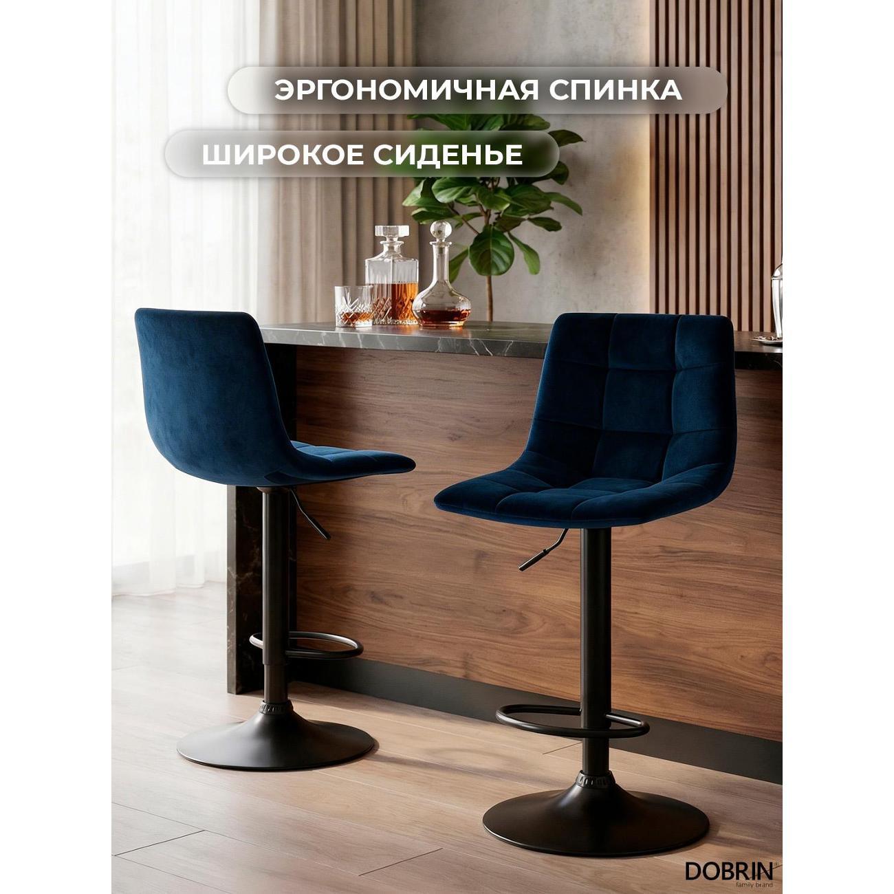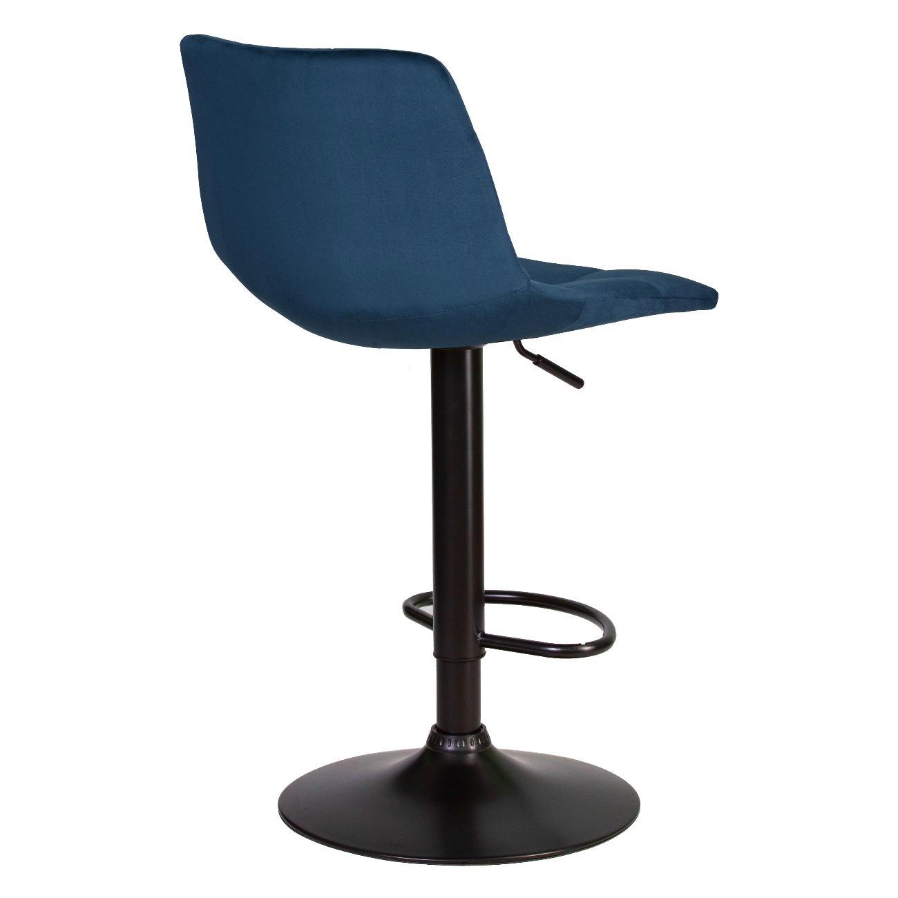 Стул барный DOBRIN TAILOR BLACK (синий велюр (MJ9-117)). Сиденье велюр искусственный, сиденье фигурной формы, мягкое, с мягкой спинкой. Основание сделано из прочного металла. Есть механизм вращения. Стул без подлокотников. Стул с газлифтом, с регулировкой высоты максимальной высотой 113 см и минимальной высотой 92 см, ширина 47 см, глубина 49 см. Сиденье с максимальной высотой 82 см и минимальной высотой 61 см. Требуется простейшая сборка, удобная инструкция прилагается. Товар изготовлен по уникальному дизайну и эскизу DOBRIN с любовью к мебели. Максимальная нагрузка 100 кг. Гарантийный срок 12 месяцев и минимальный срок службы от 5 лет. Отлично подойдет барный стул для кухни, бара, кафе, ресторана, на дачу, парикмахерскую, в салон красоты или барбершоп