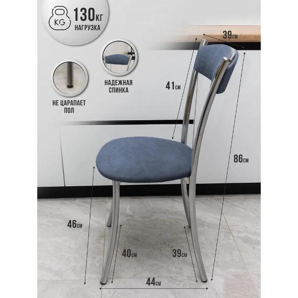 Набор включает четыре стула. Изделия предназначены для использования в помещении: на кухне, в столовой, на даче или в кафе. Каждый стул имеет мягкую сидушку и спинку. Ножки выполнены из металла с хромированным покрытием. Каркас цельносварной, что обеспечивает устойчивость конструкции. На нижних концах ножек установлены пластиковые заглушки. Заглушки предотвращают скольжение и защищают напольное покрытие от царапин. Вес одного стула — 3,7 кг. Легкий вес упрощает перемещение стульев по комнате.