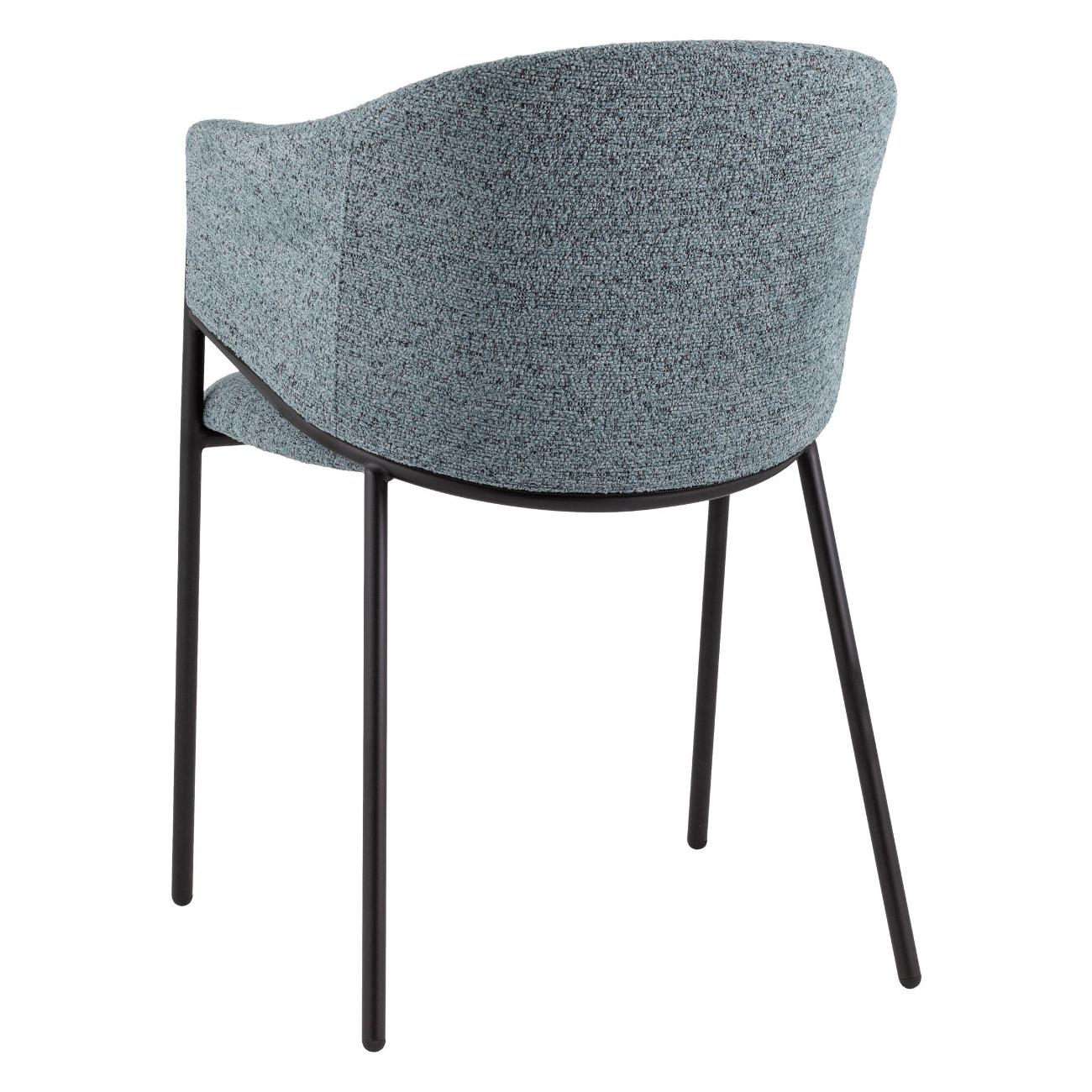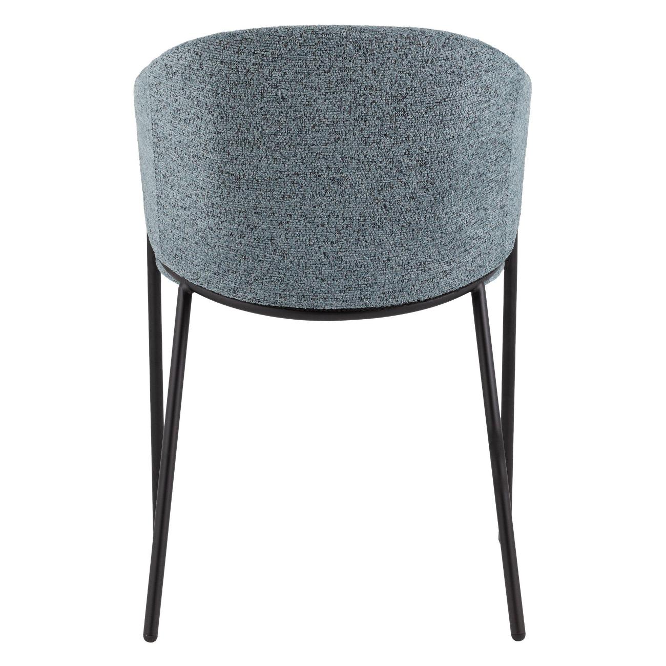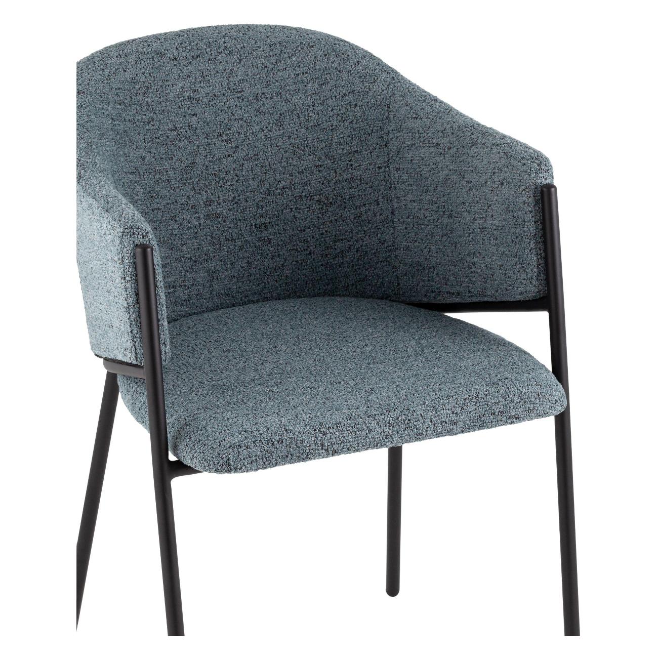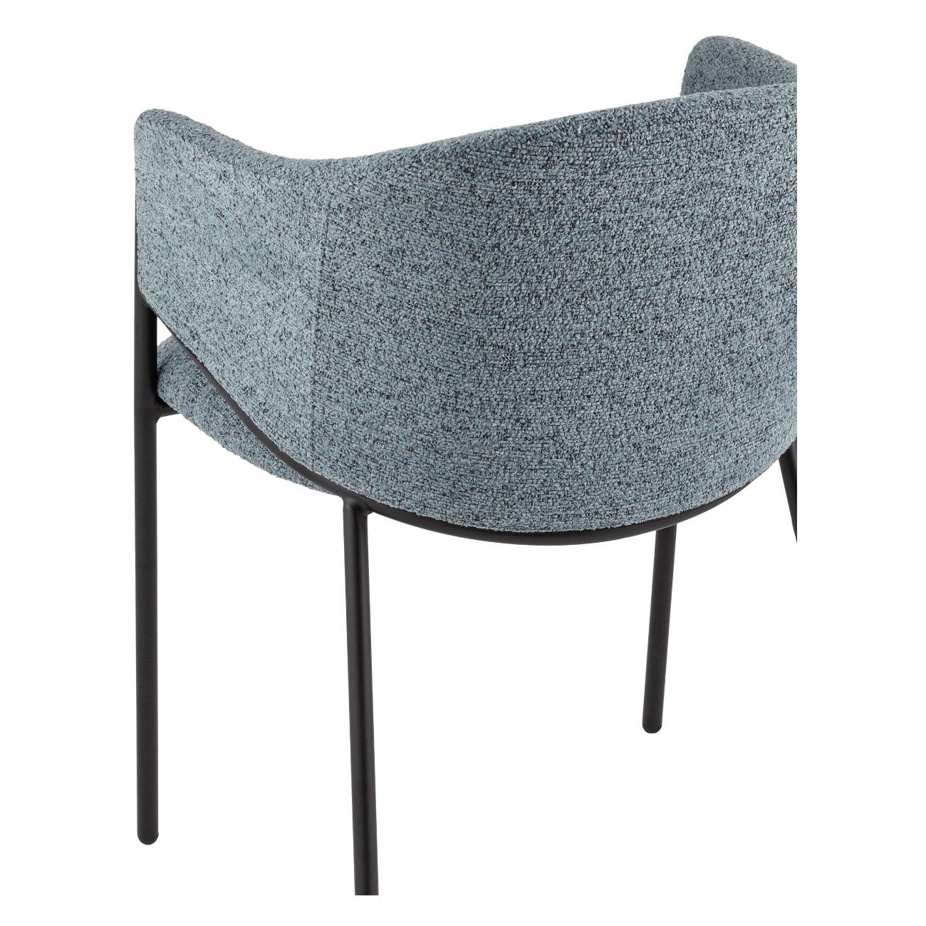 Материалы и исполнение. Сиденье и спинка стула обтянуты мягкой тканью букле — фактурный материал с приятным на ощупь рельефом, приятного голубого цвета, что придаёт изделию уют и современность. Металлический каркас с чёрным матовым покрытием обеспечивает надёжность и долговечность конструкции, а также подчёркивает контраст и выразительность дизайна.
