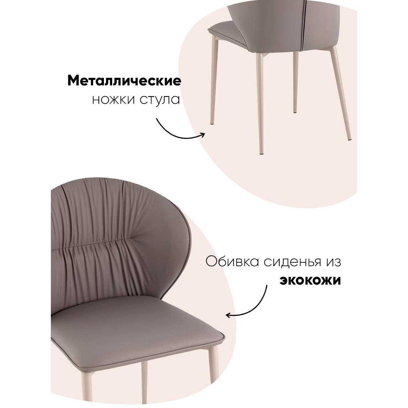 Каркас выполнен из прочного металла, что гарантирует его долговечность и устойчивость. Устойчивые ножки обеспечивают стабильность, а максимальная нагрузка в 100 кг делает его надёжным выбором для ежедневного использования. Сиденье и спинка обиты экокожей, которая не только приятна на ощупь, но и устойчива к износу, что позволяет сохранить первоначальный вид стула на долгие годы.