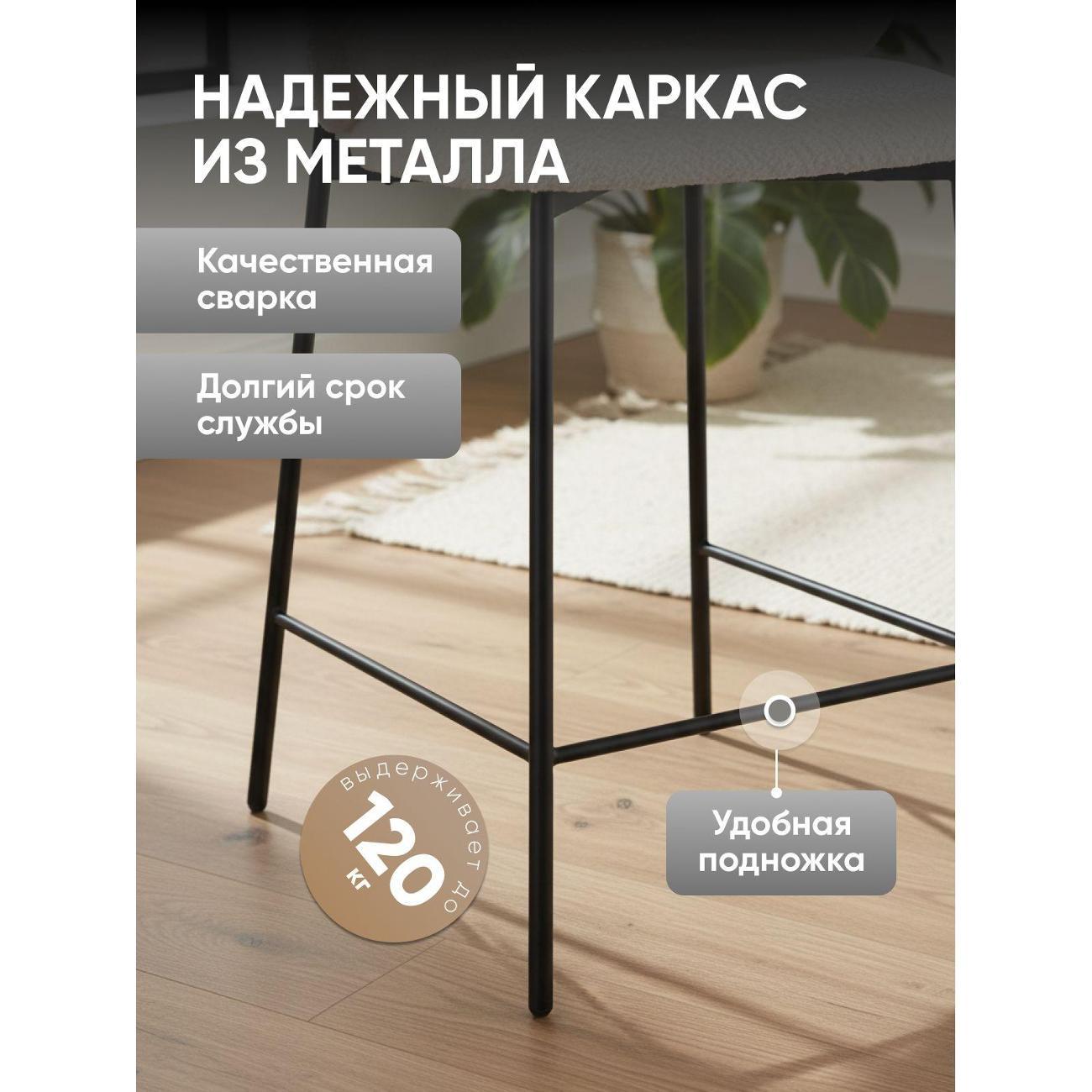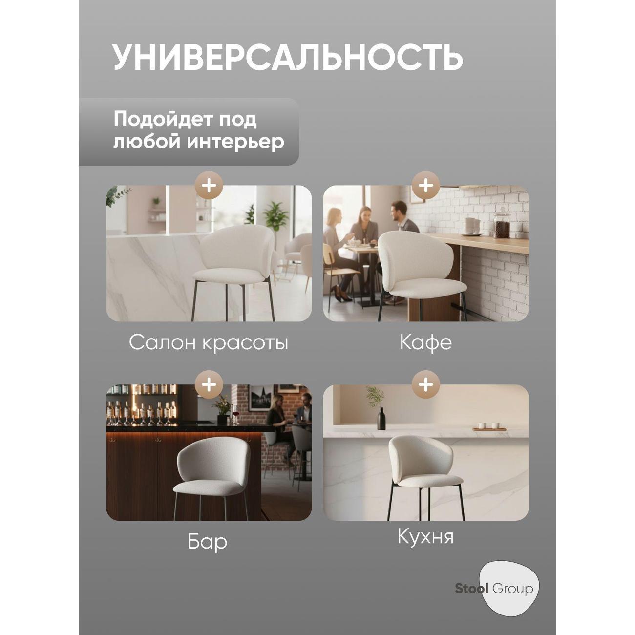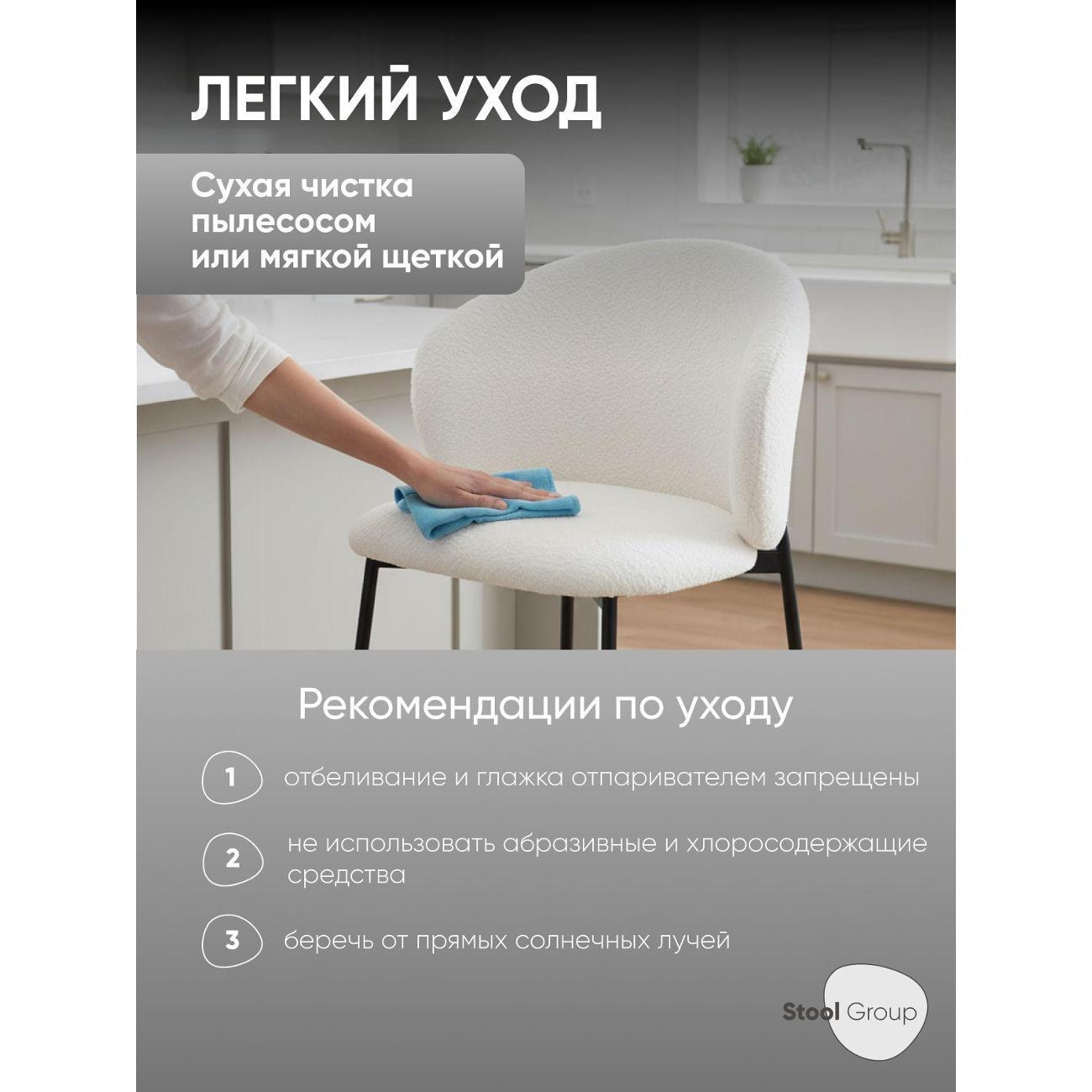 Для кухонных островков, барных зон и высоких столешниц стул подходит в роли стула полубарного для кухни со спинкой, обеспечивая надёжную опору и поддерживая удобную посадку во время завтраков, перекусов или общения. Ткань букле приятна на ощупь и хорошо подходит для повседневного использования, сохраняя аккуратный внешний вид. Удобная высота делает модель практичной также и в косметических зонах — стул можно использовать как стул для макияжного столика, создавая стабильную и комфортную поверхность для работы перед зеркалом.