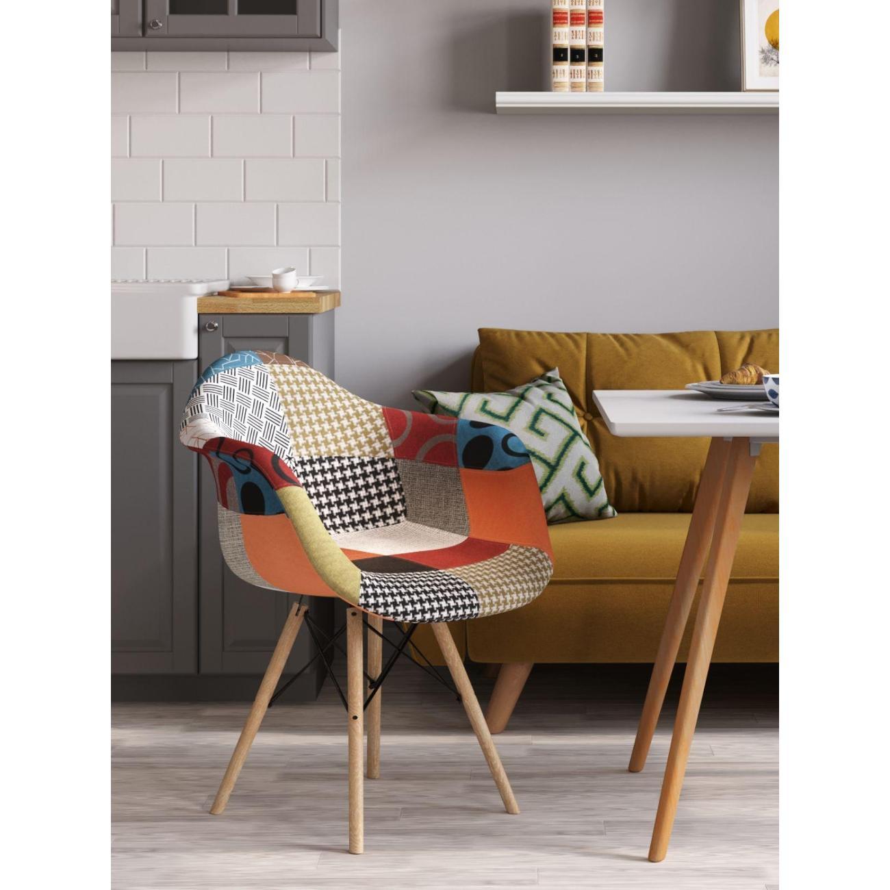 Кресло DSW - это комфортный и стильный предмет интерьера. Прочный каркас из полипропилена обтянут яркой мебельной тканью в стиле пэчворк. Ножки изготовлены из массива бука, надежную конструкцию дополняют металлические крепления, по которым легко узнается культовый дизайн самых популярных стульев в мире. Кресло стул с подлокотниками из лоскутов.