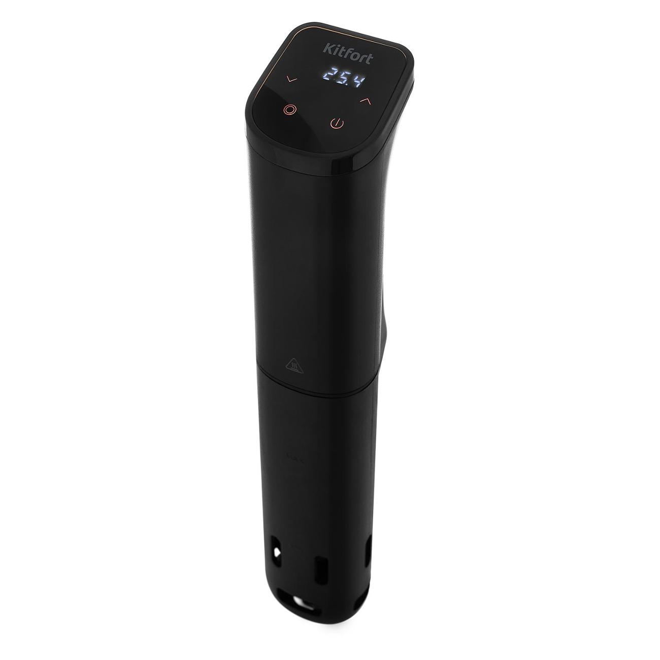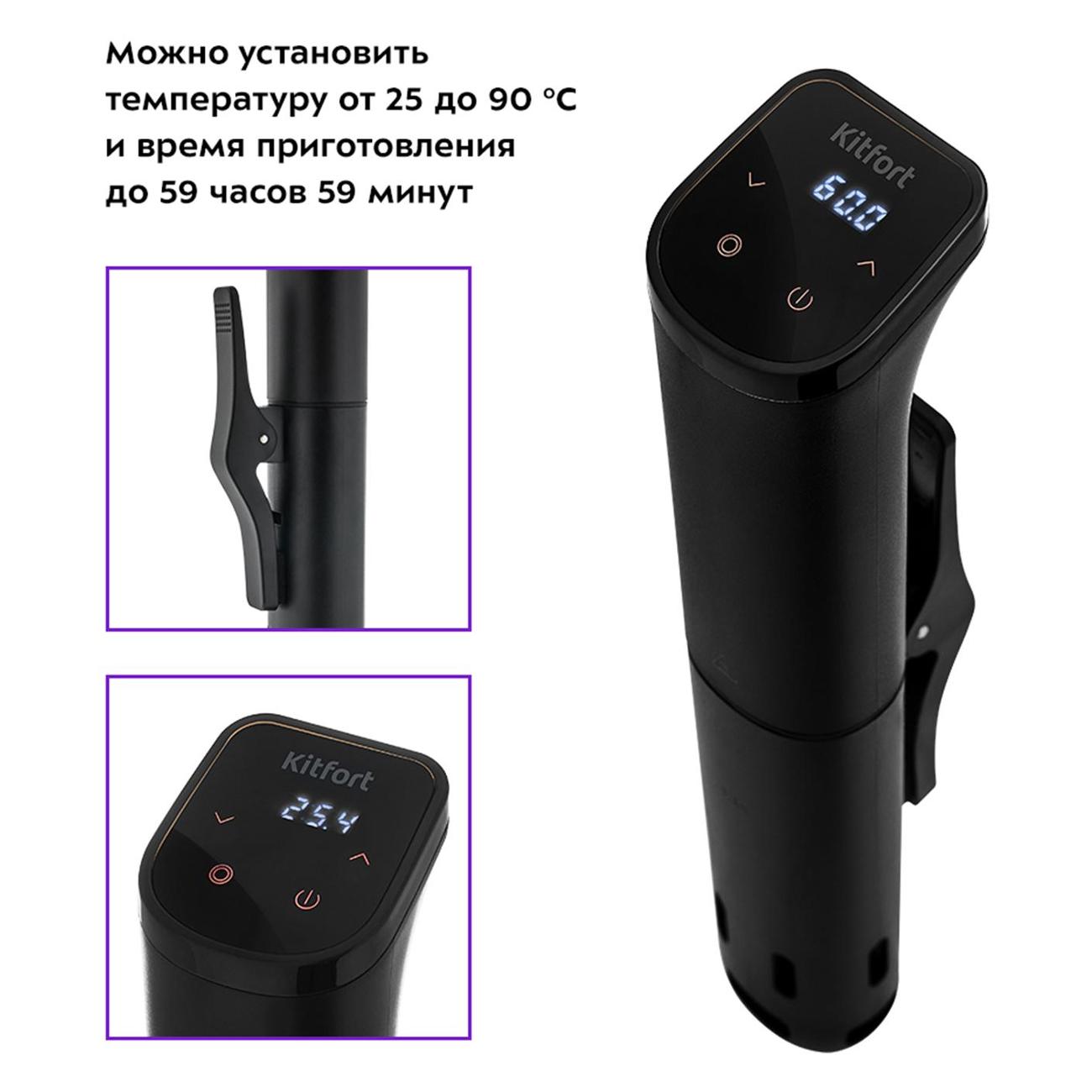 Су-вид Kitfort КТ-4057 погружного типа легок в управлении за счет регулировки времени приготовления и температуры нагрева от 25°C до 90°C. Предусмотрена функция поддержания тепла, защиты от перегрева. На внешней части устройства размещен дисплей с индикацией включения и низкого уровня воды. Корпус черного цвета выполнен из пластика и нержавеющей стали. Модель потребляет мощность 800 Вт. Общая масса составляет 0,69 кг. Габариты: 33,2ⅹ7,6ⅹ5,7 см. Гарантия использования — 1 год, службы — 2 года.