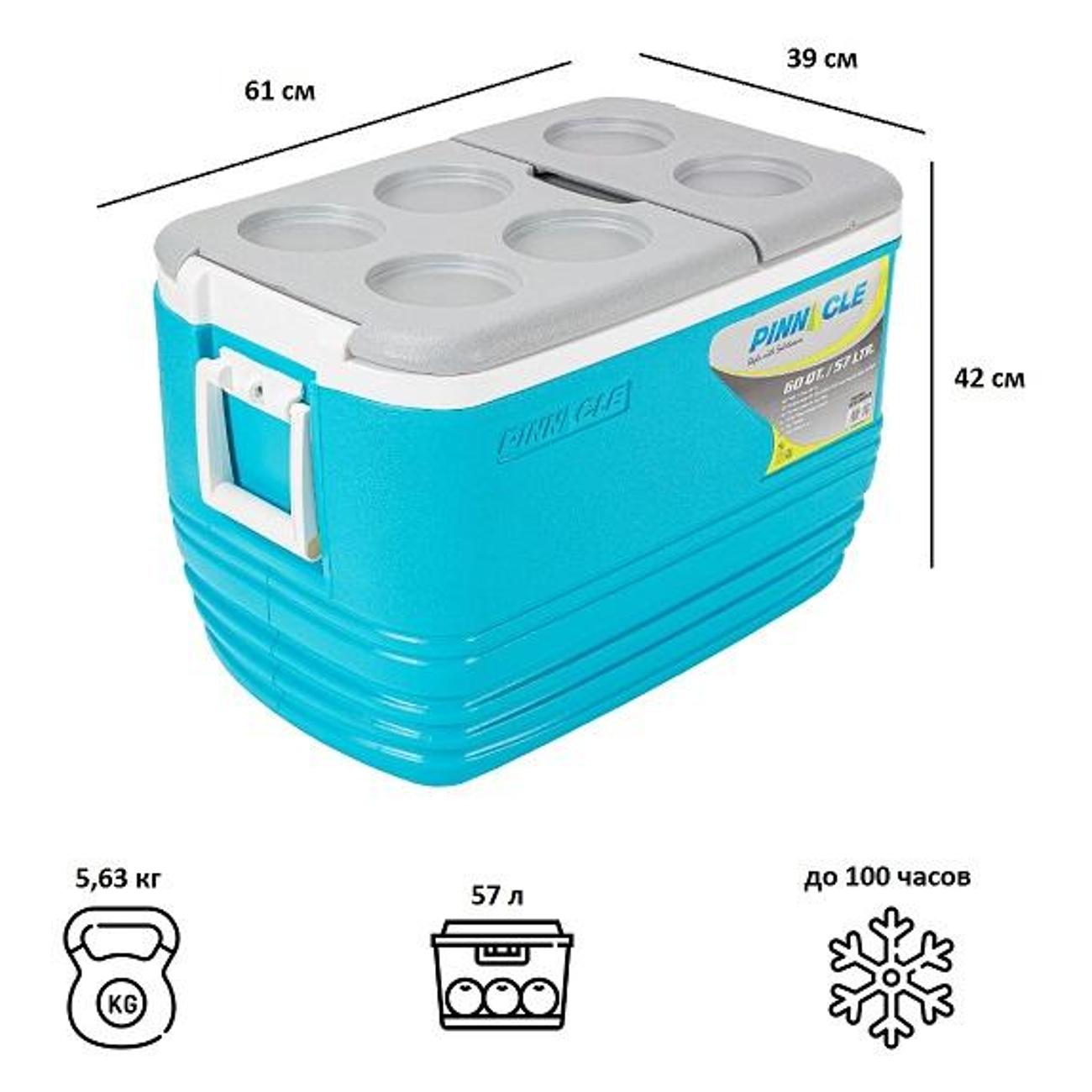 Крышка с фиксацией дополнена углублениями для размещения стаканов или кружек. Ручка для переноски и колесики для перемещения делают эксплуатацию удобной. Модель с толщиной стенок 28 мм выполнена в высокопрочном корпусе из пенополиуретана, благодаря чему достигается долгий срок службы. Габариты равны 42х39х61 см, вес — 5,63 кг.