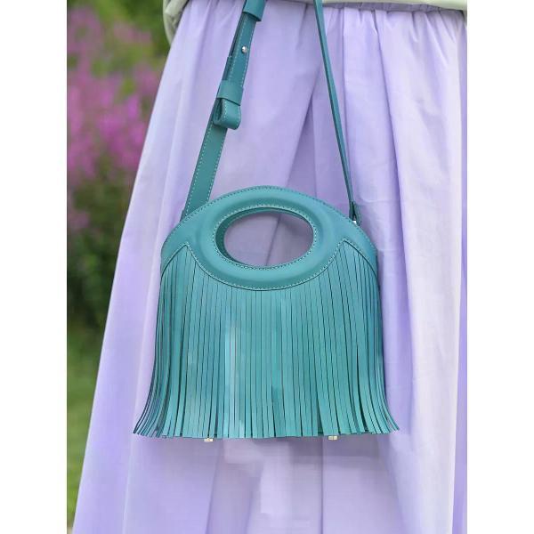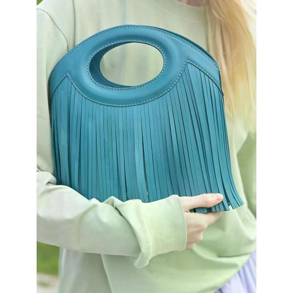 Сумка с бахромой маленького размера SHEBBY 3043. В верхней части прорубные отверстия-ручки овальной формы. Открытый верх без застёжки обеспечивает лёгкий доступ к содержимому. Внутри 2 кармана: накладной на резинке и карман на молнии. На передней и задней стенках декоративная кожаная бахрома. На дне сумки металлические ножки (пукли). В комплект входит съемный, регулируемый до 120 см, плечевой ремень.