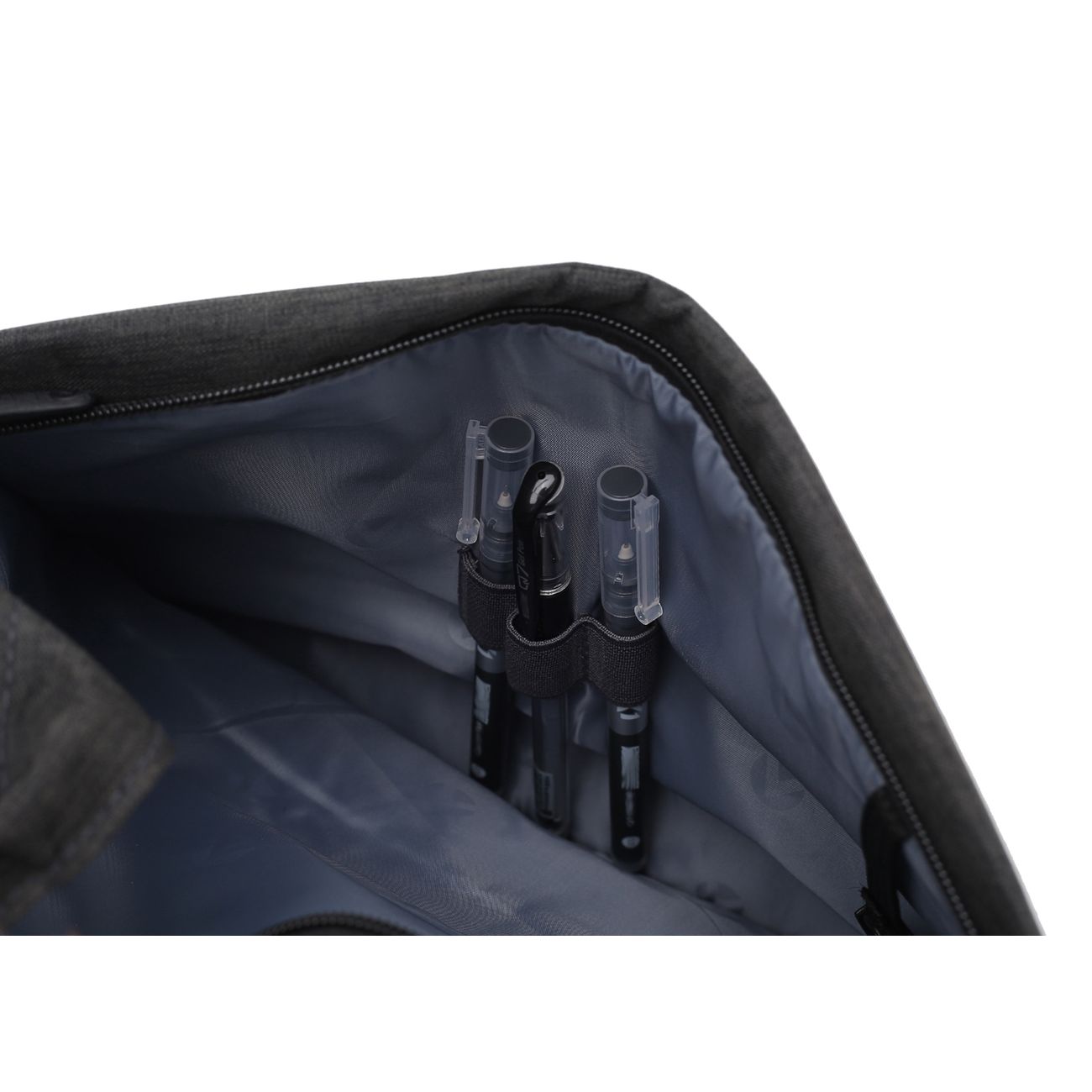 Имеется карабин на ремешке для крепления ключей/меток, держатели для письменных принадлежностей, внешние отделения закрываются с помощью молний.