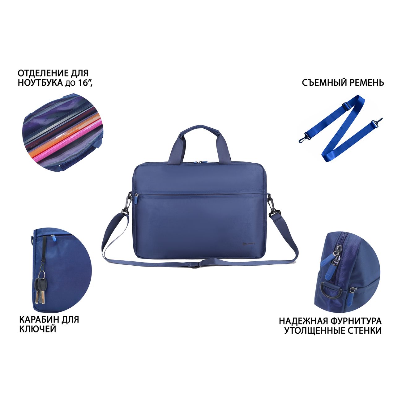 Сумка для ноутбука Lamark L215 Blue имеет просторный центральный отсек, отделения для размещения документов и аксессуаров, карабин для крепления меток и ключей. Предназначена для безопасной переноски ноутбуков диагональю до 16 дюймов с помощью двух крепких ручек, а так же съемному наплечному ремню.