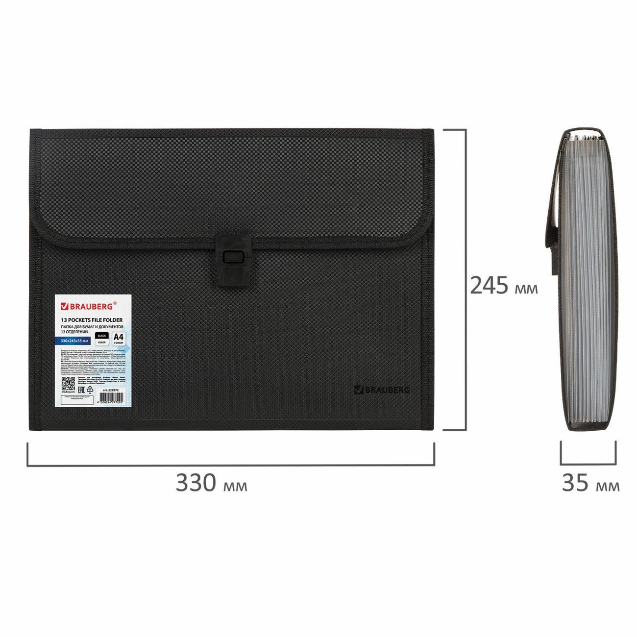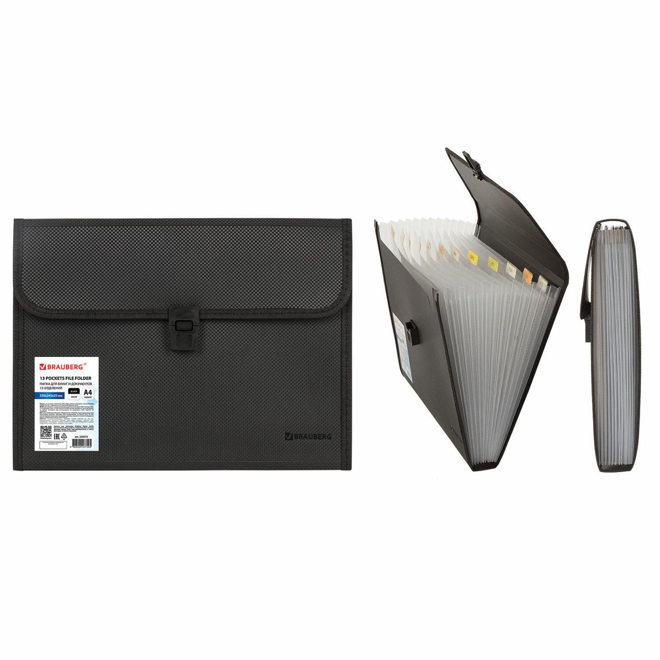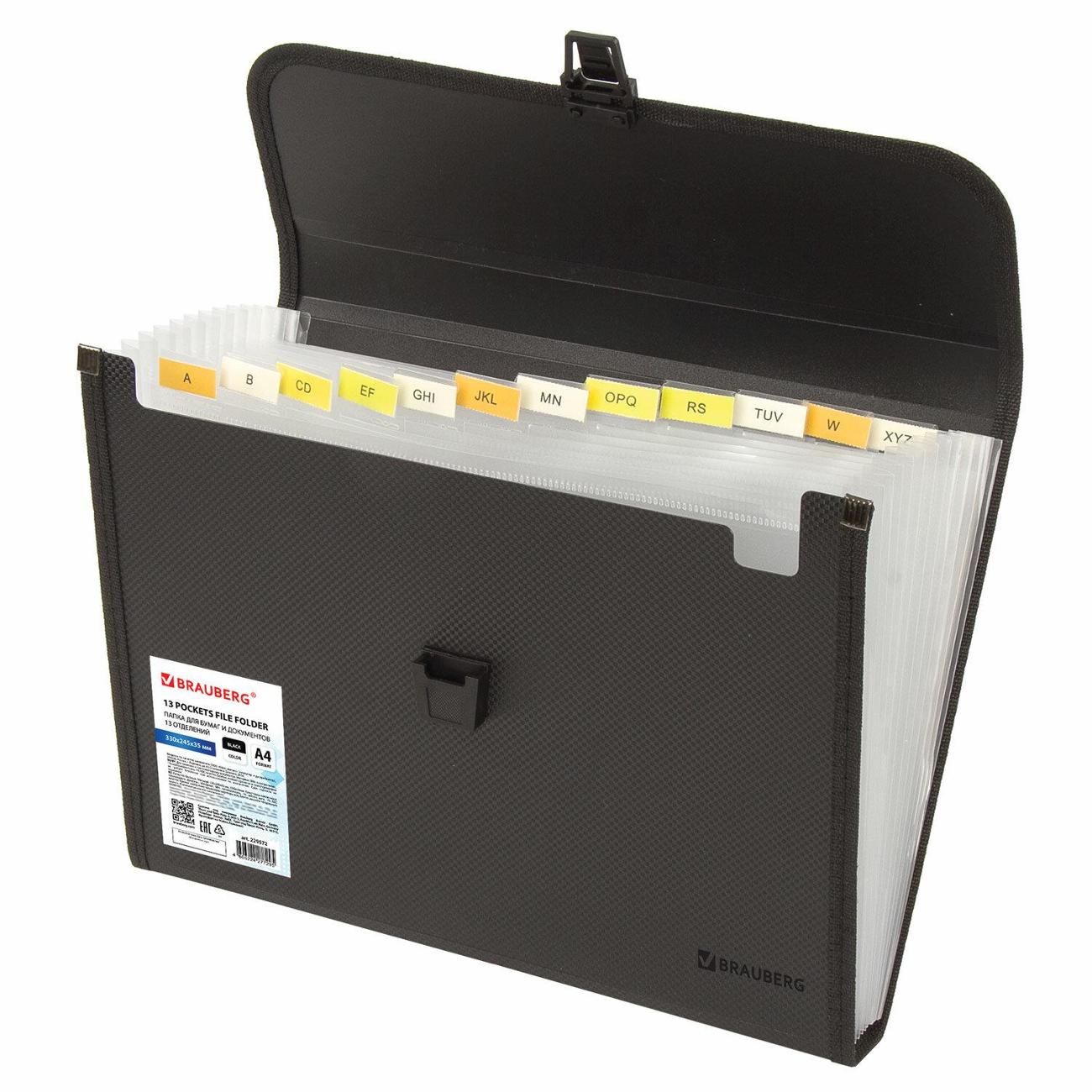Изготовлена из качественного пластика толщиной 0,7 мм с фактурой под "ткань" и содержит 13 отделений, которые позволяют структурировать документы. Для удобства поиска нужного документа папка формата А4 снабжена индексными ярлыками. Надежный замок плотно закрывают папку, не позволяя содержимому выпасть и защищая от влаги, пыли и прочих механических повреждений. Папка представлена в солидном черном цвете.