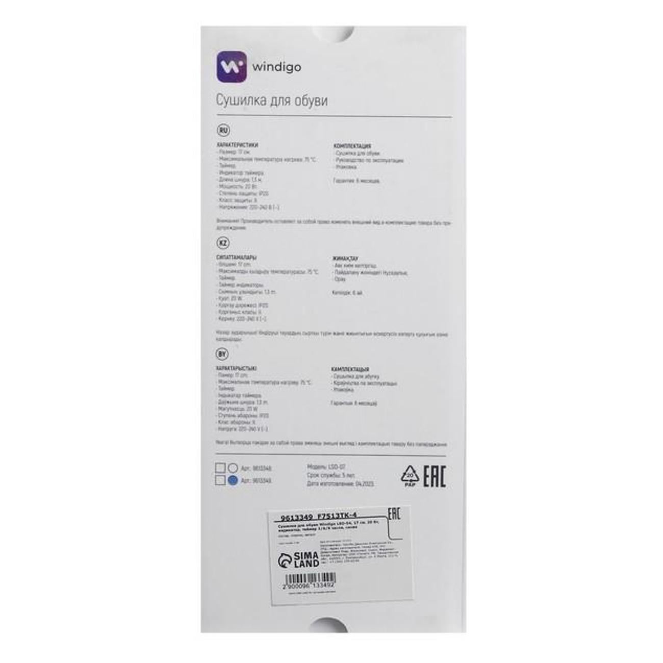Сушилка для обуви Windigo LSO-07 (9613349) — устройство в вытянутом пластиковом корпусе, которое позволяет продлевать срок службы вещей и уменьшать вероятность развития грибка ног. Конструкция предусматривает большое количество отверстий, которые способствуют равномерному распределению теплого воздуха температурой до 75°С, тем самым уменьшая вероятность возникновения деформации и повреждения обуви. За счет кругового потока теплого воздуха процесс сушки не занимает много времени.