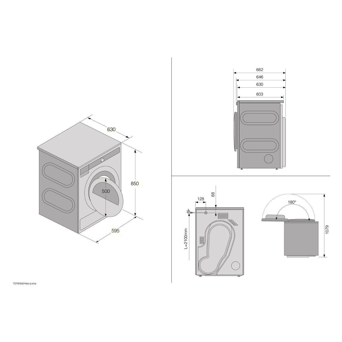Габаритные размеры составляют 85x59,5x63 см, что позволяет устанавливать устройство в стандартную нишу. Модель можно размещать на стиральной машине в колонну. Глубина с открытой дверцей увеличивается до 108 см. Дверца люка перенавешивается, верхняя крышка является съемной для встраивания под столешницу. Отвод конденсата возможен как в резервуар, так и непосредственно в дренаж.