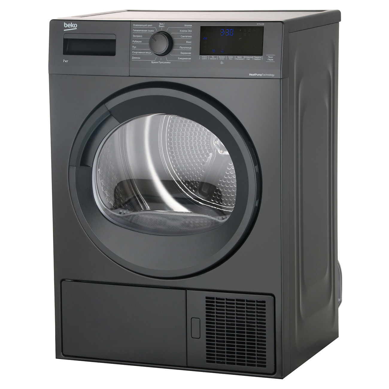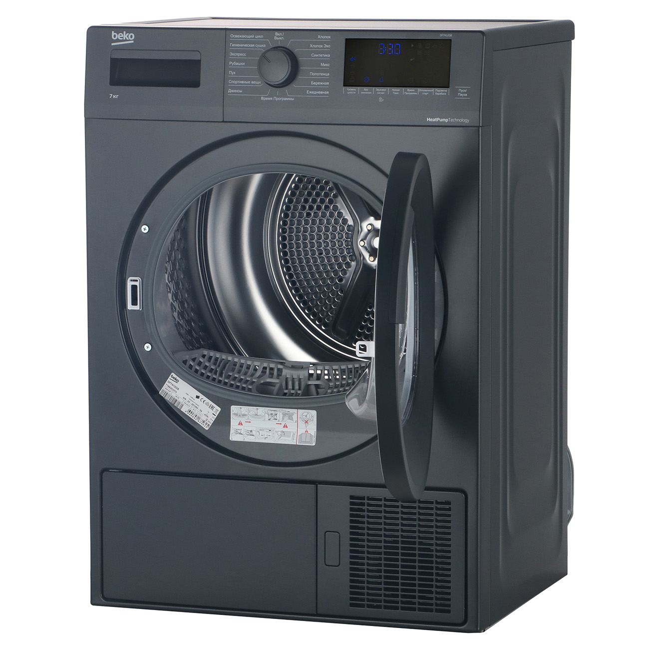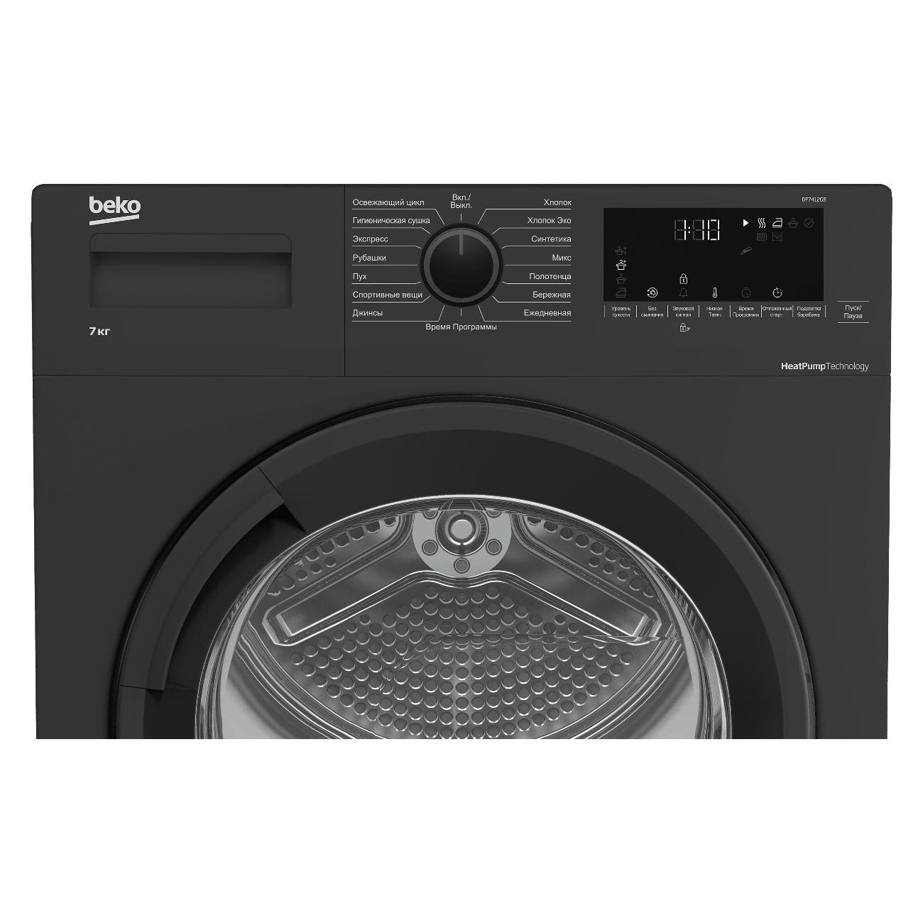 Сушильная машина Beko DF7412GB вмещает 7 кг белья, можно выбирать подходящий режим для разных типов тканей: от хлопка до шерсти, с различным уровнем влажности.