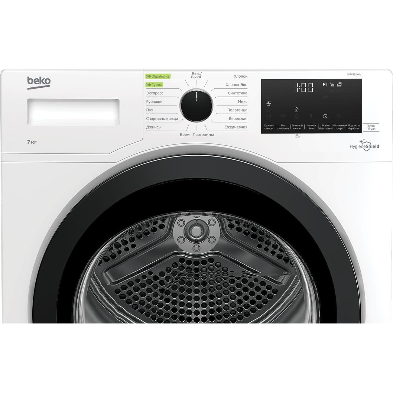 Сушильная машина Beko DF7439SXUV, белая вмещает до 7 кг белья. В этой модели используется технология Heat-Pump, которая сочетает конденсационную и воздушную сушку, что позволят добиться высокой эффективности и уменьшить потребление электроэнергии. За цикл расходуется 1,76 кВт*ч, что соответствует классу А+.