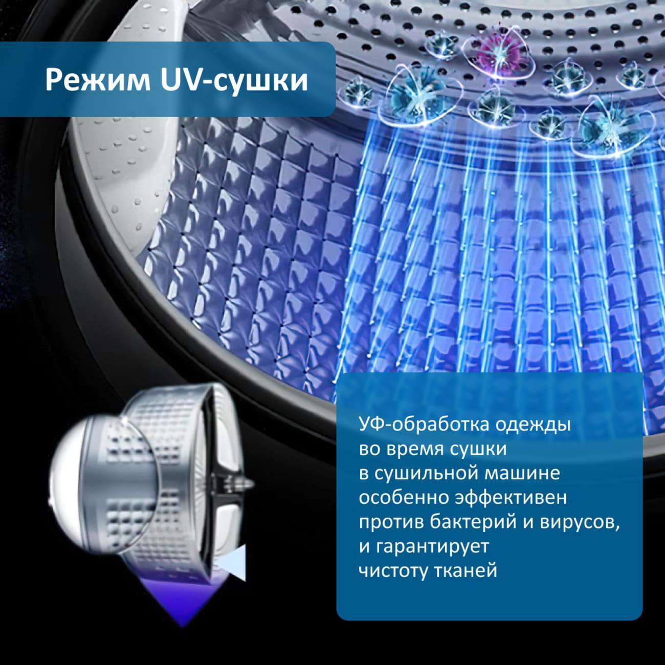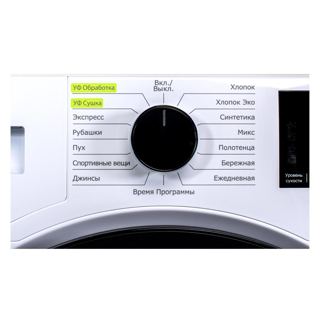 Прибор оснащен русифицированной панелью управления. Настройки выбираются с помощью поворотного переключателя, информация отображается на LED-дисплее. Барабан обладает объемом 83 л. За счет сотовой поверхности белье высушивается бережно. Реверсивное вращение предотвращает скручивание, обеспечивая равномерное просыхание.