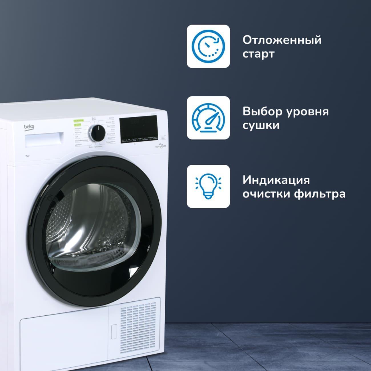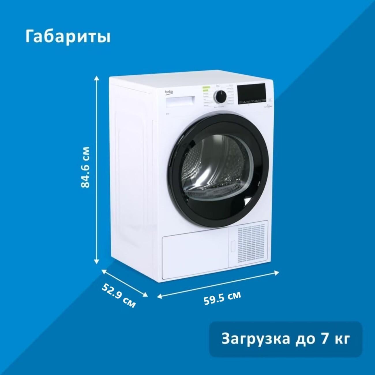Блокиратор не позволит детям запустить машину. Предусмотрен звуковой сигнал, оповещающий об окончании процесса. Устройство за цикл расходует всего 1,76 кВт электричества, что соответствует классу энергоэффективности А. Beko DF7412GA подходит для установки на стиральную машину, что позволит сэкономить пространство.