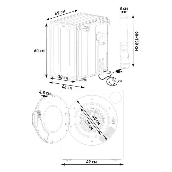В сушильной машине Estares EASY DRY Mini за один раз можно высушить до 4 кг белья. За счет компактных размеров прибор поместится в небольших по площади помещениях, доступны настенная фиксация (в комплект входит специальное крепление) и установка на стиральную машину. Глубина модели — 46 см, вес — 8 кг. Дверь открывается на 180°.