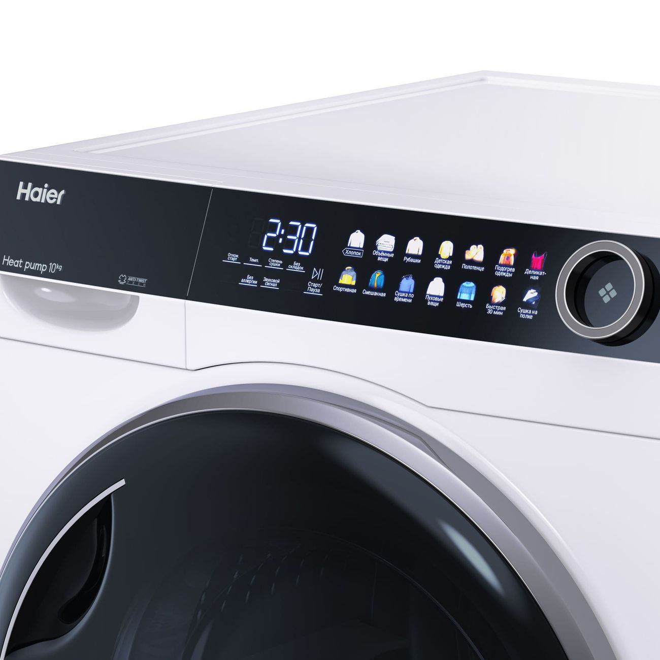 Сушильная машина Haier HD100-A2378 — модель конденсационного типа со стальным барабаном объемом 112 л, оснащенным внутренней подсветкой, в который можно загружать до 10 кг белья. Люк диаметром 52,5 см открывается на 180° и при необходимости может перенавешиваться.