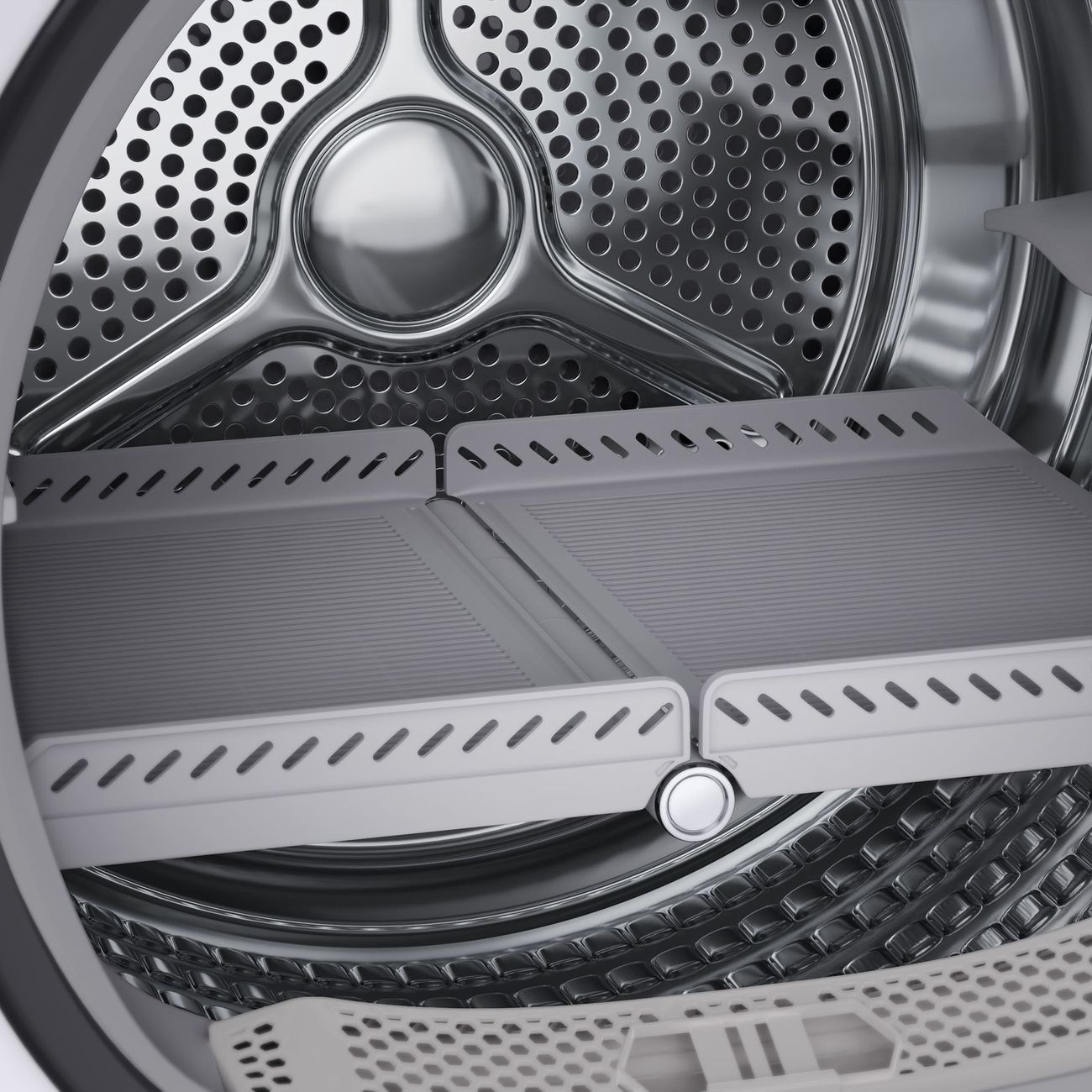 У модели большой выбор программ (14), включая бережную, ускоренную сушку, уход за детской, спортивной одеждой, пуховыми вещами, рубашками. Благодаря реверсивному вращению барабана предотвращается возникновение заломов и складок.