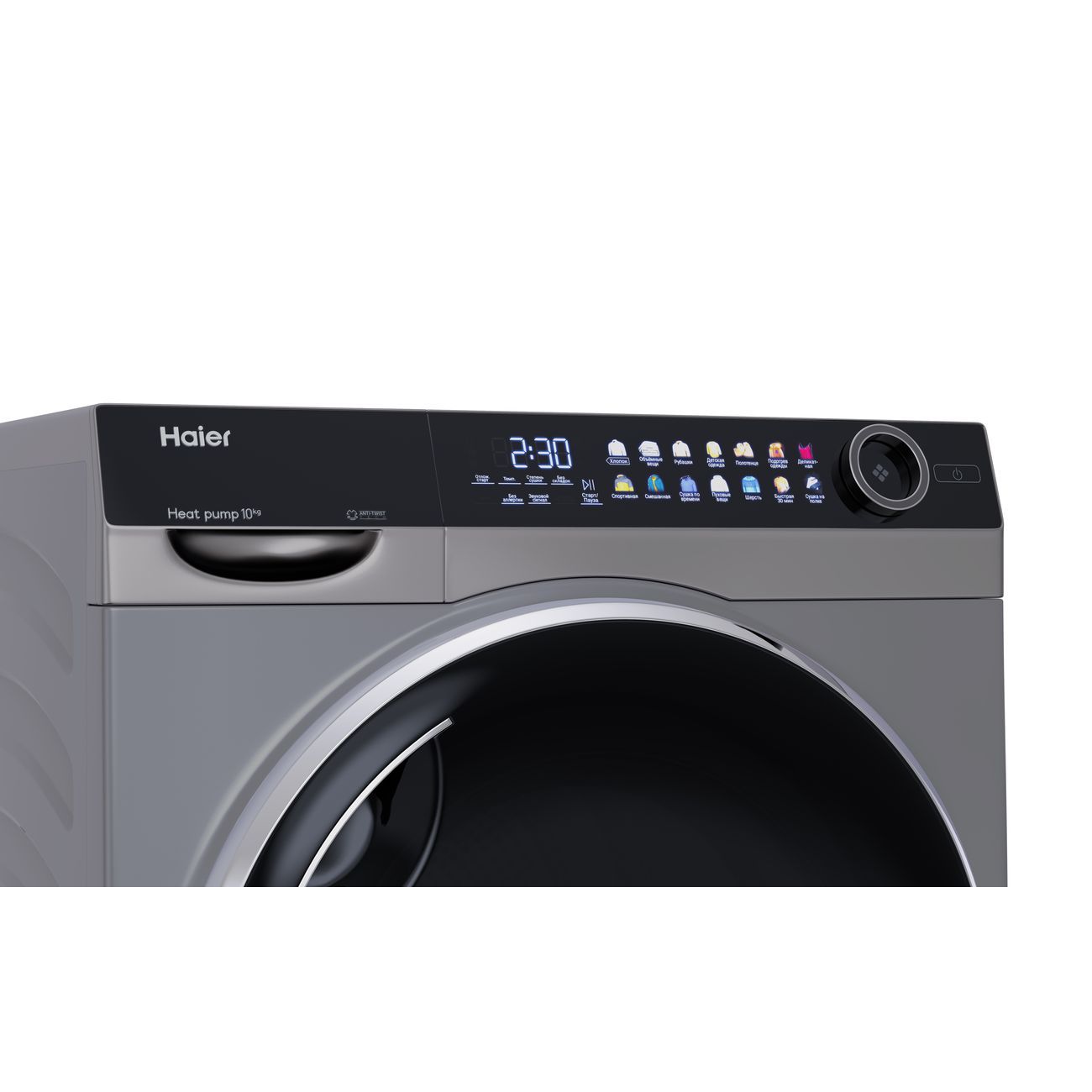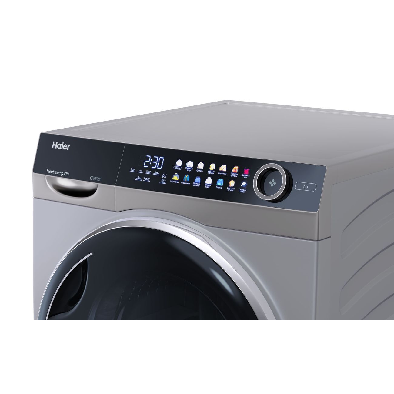 Сушильная машина Haier HD100-A2378S серебристого цвета с черными элементами оснащена барабаном объемом 112 л и рассчитана на максимальную загрузку 10 кг. В прибор заложено четыре температурных режима в диапазоне от 50°С до 65°С и 14 программ: «Детская одежда», «Шерсть», «Пуховые вещи», «Рубашки», «Спортивная», «Хлопок» и другие. Если машину загрузить полностью, то время сушки составит 221 минуту.