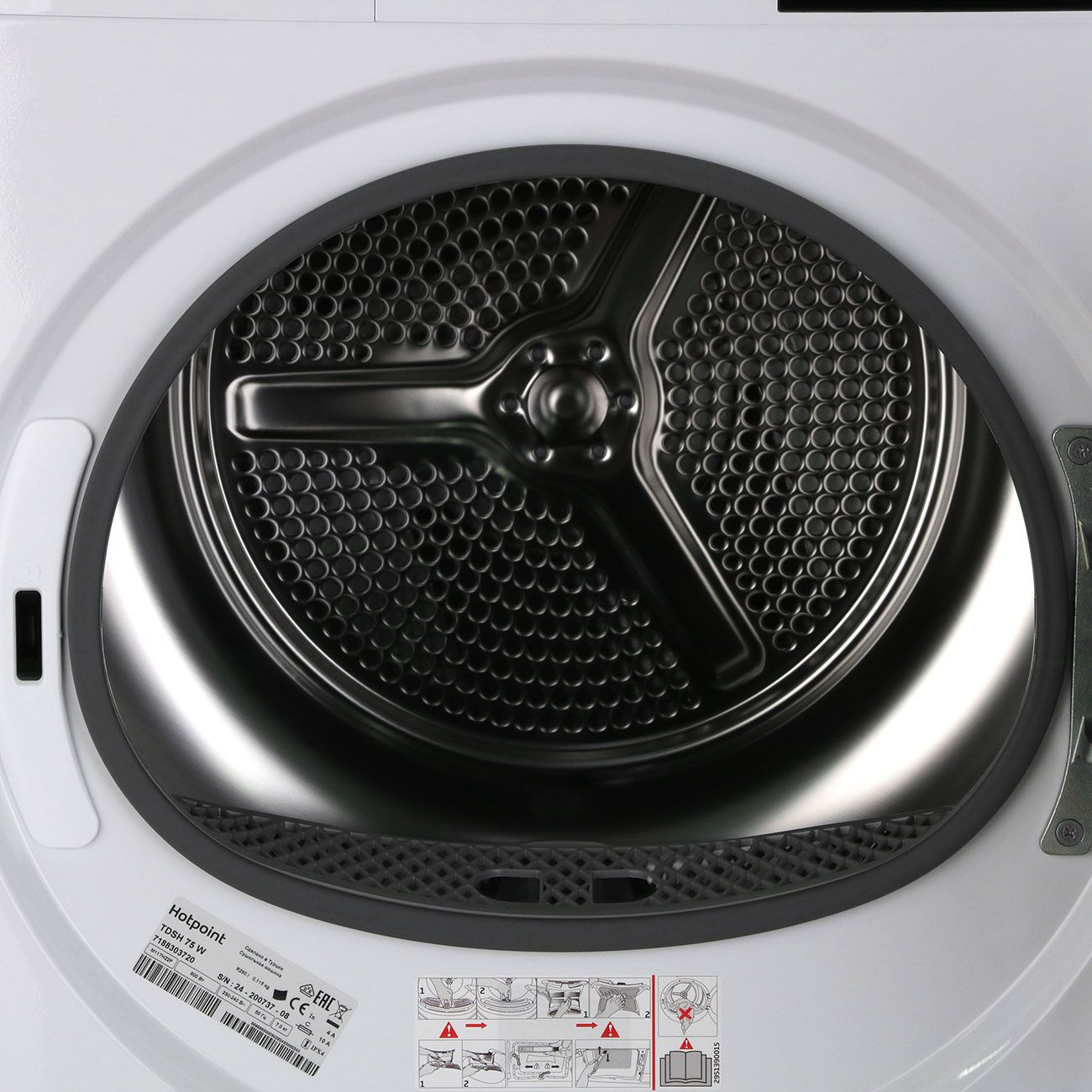 Сушильная машина Hotpoint TDSH 75 W, белая, оснащена барабаном объемом 92,5 л и вмещает до 7 кг белья. Прибор работает на основе технологии теплового насоса: в барабан нагнетается горячий воздух.