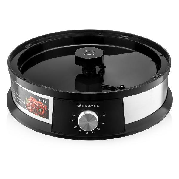 Сушка для фруктов Brayer BR1903 общим объемом 9 л состоит из пяти пластиковых поддонов, которые автоматически вращаются, обеспечивая равномерную циркуляцию воздуха и облегчая процесс высушивания. Устройство оснащено механическим переключателем, благодаря которому осуществляется регулировка температуры в диапазоне от 35°С до 70°С. На корпусе расположен индикатор температуры нагрева. Данная модель эффективно справляется с высушиванием фруктов, ягод, рыбы, мяса, грибов и трав. За безопасную эксплуатацию отвечает функция отключения при перегреве.