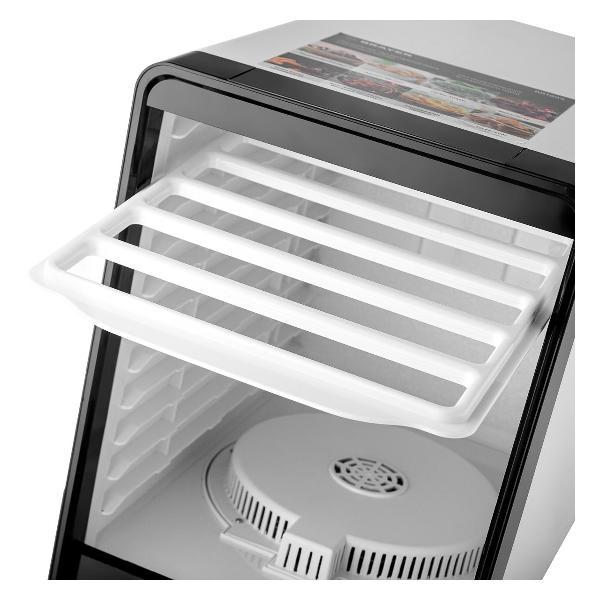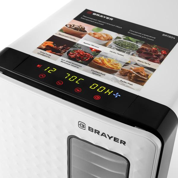 Сушка для фруктов Brayer BR1904 оснащена полностью закрытым корпусом, который включает в себя десять плоских поддонов и сетку для размещения мелких продуктов. Полезный объем составляет 13 л. За управление отвечает сенсорная панель на корпусе и электронный дисплей, на котором отображаются индикаторы включения и температуры нагрева. Благодаря встроенному таймеру прекращение программы высушивания произойдет в заданное время.