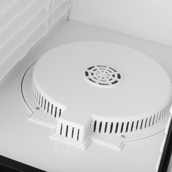 Предусмотрена возможность регулировки степени нагрева в диапазоне от 40°С до 70°С. Встроенный вентилятор обеспечивает активную циркуляцию воздуха между поддонами. Функционал устройства включает в себя сушку фруктов, овощей, ягод, рыбы, мяса, грибов и трав. Конфигурацией данной модели предусмотрено наличие функции отключения при возникновении перегрева.