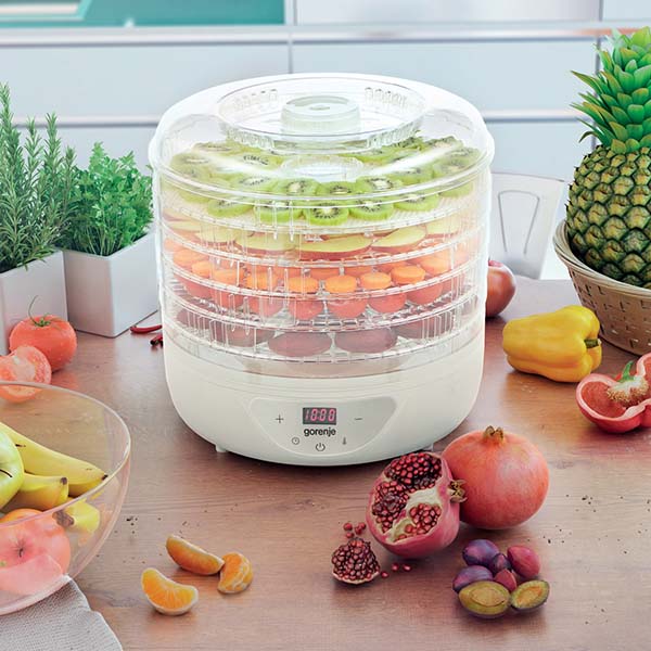 Сушка для фруктов Gorenje FDK24DW получила прозрачный корпус, что облегчает контроль работы устройства. На нижней панели расположена электронная панель, оборудованная цифровым экраном. Диапазон температур — 35-70 градусов. Один шаг — 5 градусов.