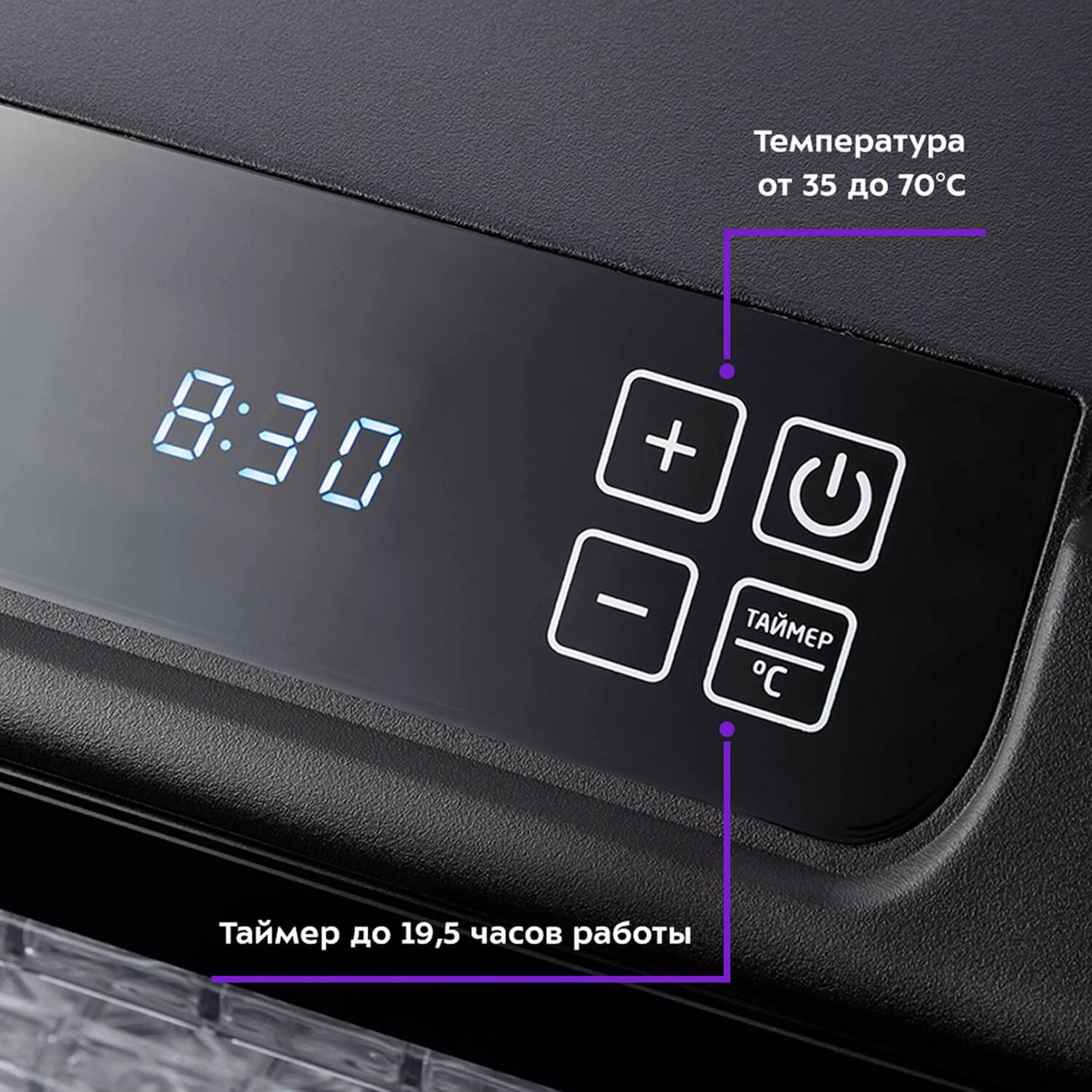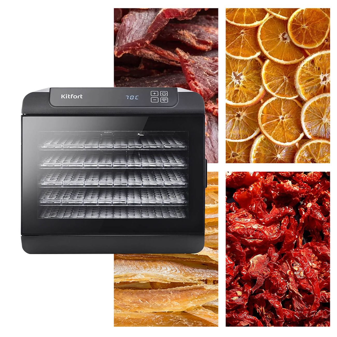 Температурный диапазон — от 35°С до 70°С (шаг в 5°С). Мощный вентилятор в задней стенке обеспечивает равномерную просушку грибов, зелени, мяса и рыбы, овощей и фруктов, трав, предотвращая перемешивание запахов.