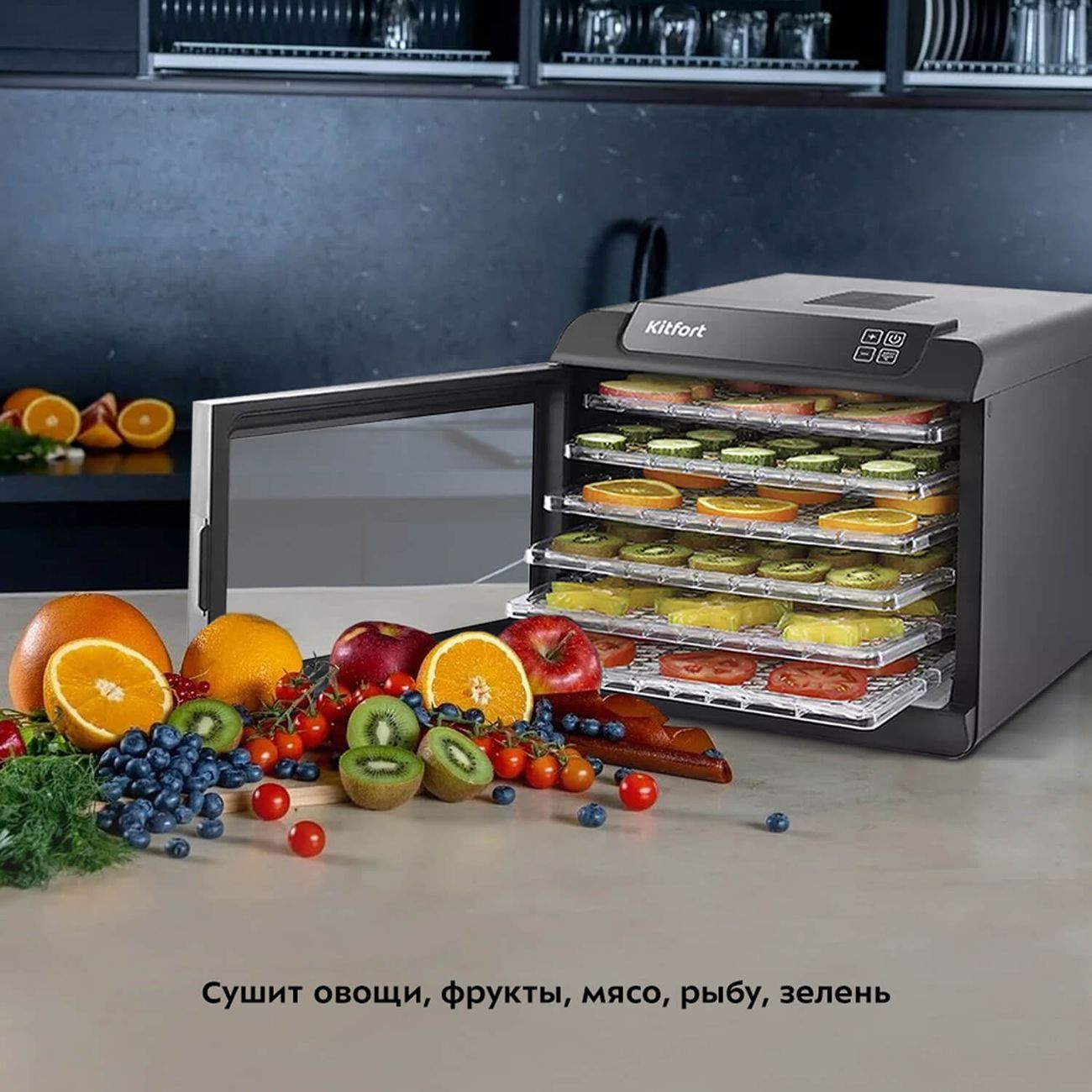 Сушка для фруктов Kitfort КТ-1905 мощностью 500 Вт оснащен шестью пластиковыми поддонами, шестью сетками и шестью лотками для приготовления пастилы. Прибор снабжен сенсорной системой управления, сенсорным дисплеем, таймером до 19,5 часов (шаг 30 минут).