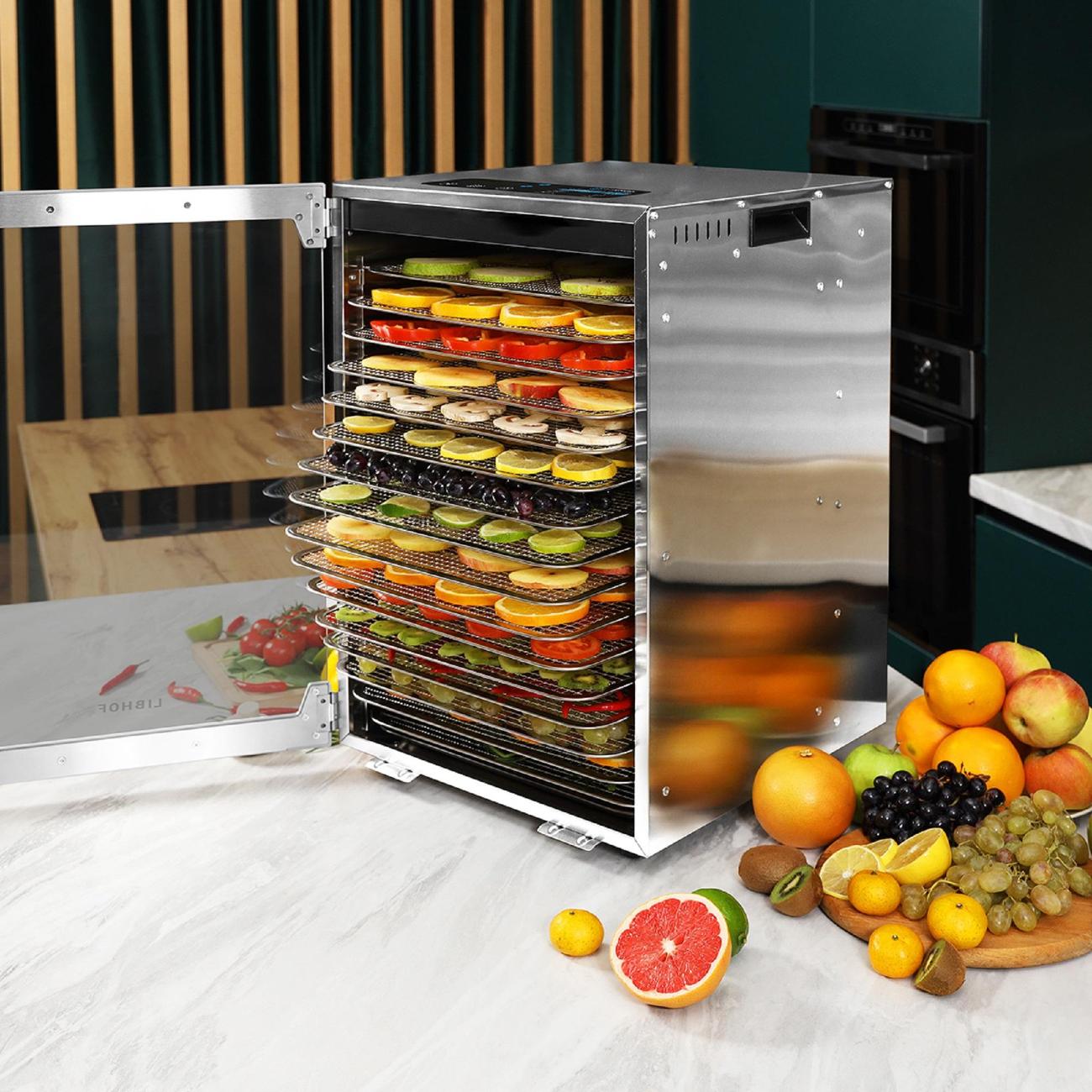 Сушка для фруктов Libhof FDK-16 оснащена 16 поддонами из металла размерами 34х27 см для термообработки разных продуктов (орехов, хлеба, овощей, ягод, рыбы). Управление моделью производится посредством электронной панели. На экране цифрового дисплея показан температурный режим. Мощность нагрева можно настраивать в диапазоне от 20°С до 90°C, поэтому модель оптимальна для сушки трав. Два вентилятора гарантируют равномерное распределение прогретого воздуха.Интегрированный таймер дает возможность устанавливать продолжительность нагрева (до 24 часов). После окончания запрограммированного времени сработает звуковой сигнал и модель отключится. Корпус произведен из металла. На нижней части установлены прорезиненные ножки, что гарантирует высокую устойчивость. В случае перегрева сушилка автоматически отключится. Длина сетевого шнура равна 1,5 м. Габаритные размеры устройства —37,5х39,2х57 см, вес — 18 кг.