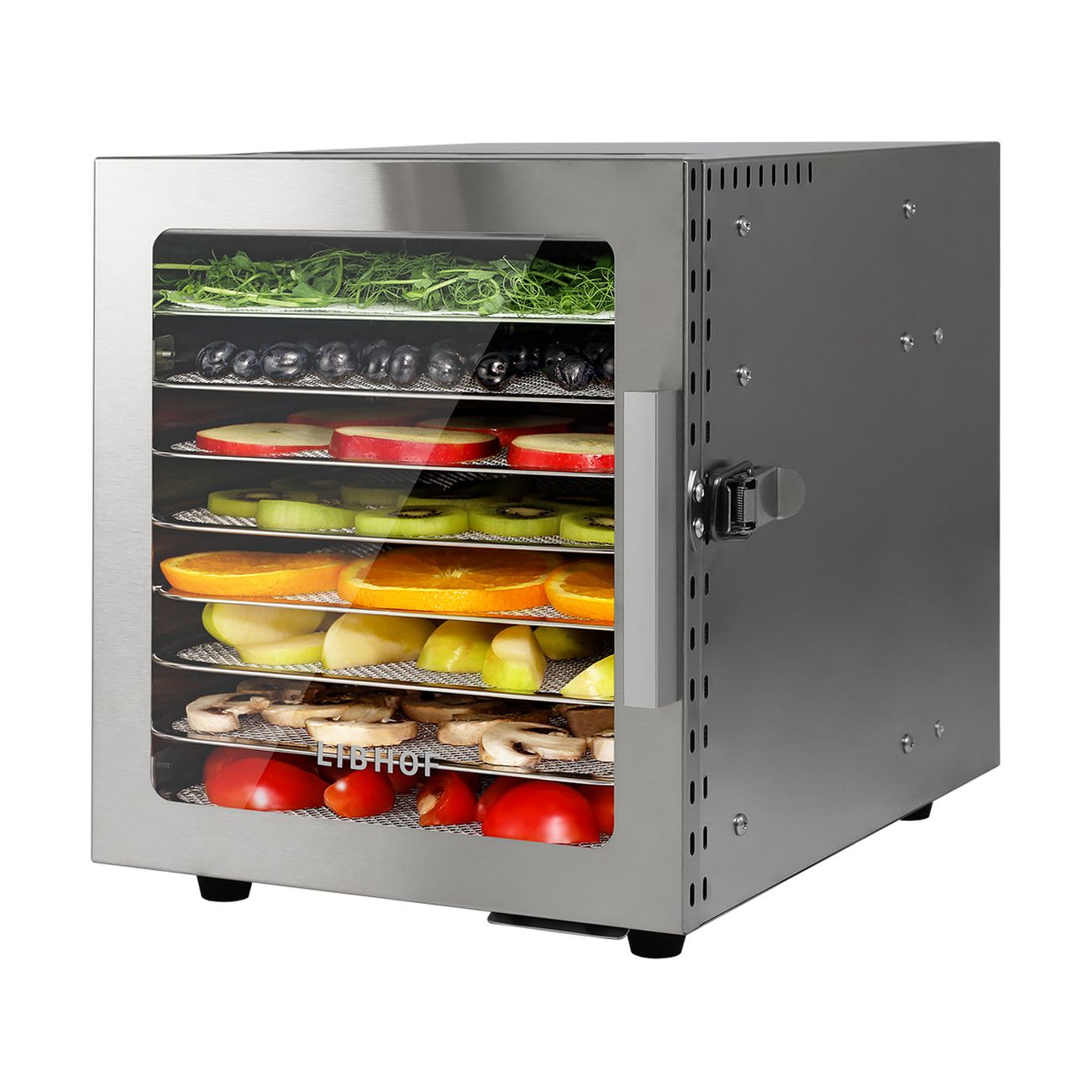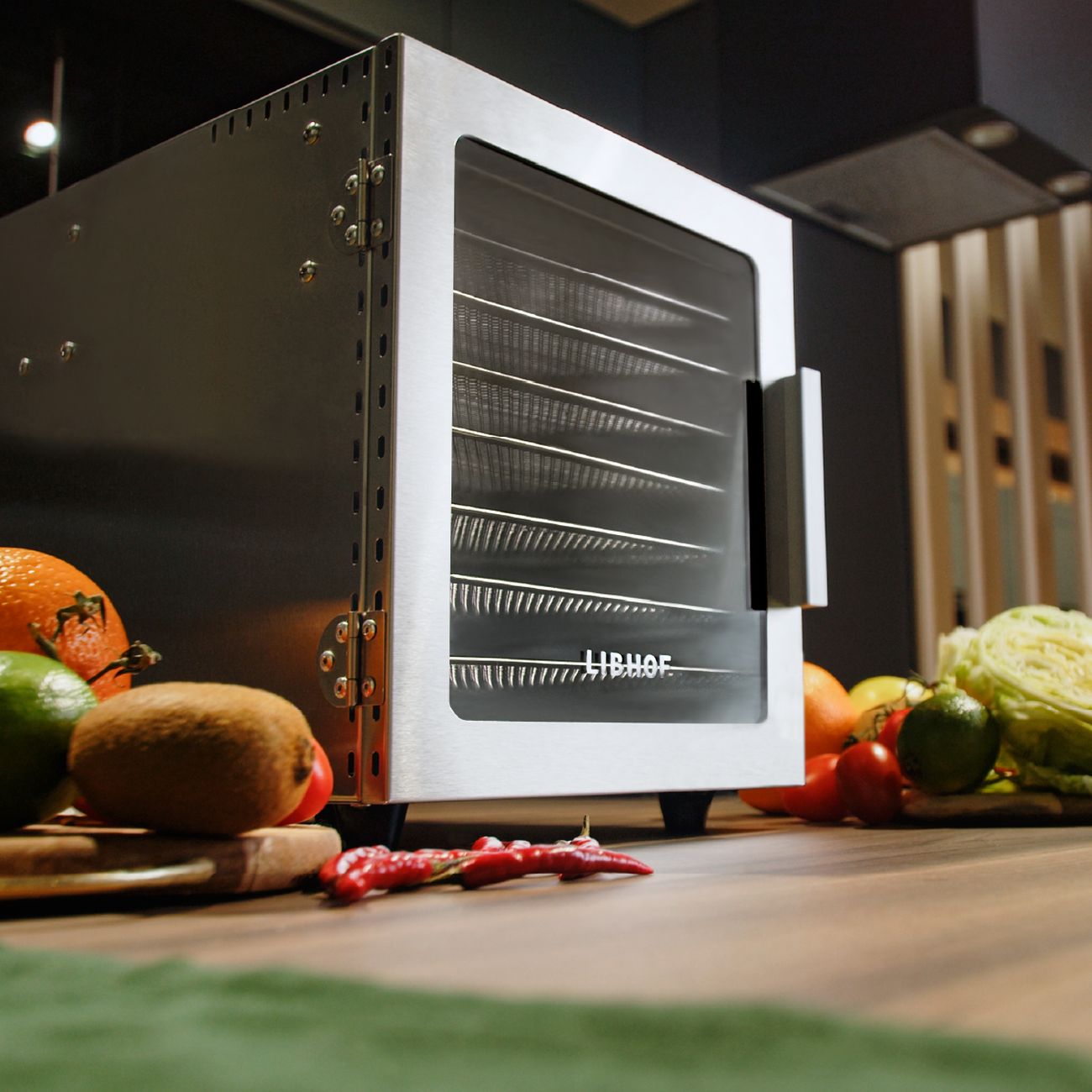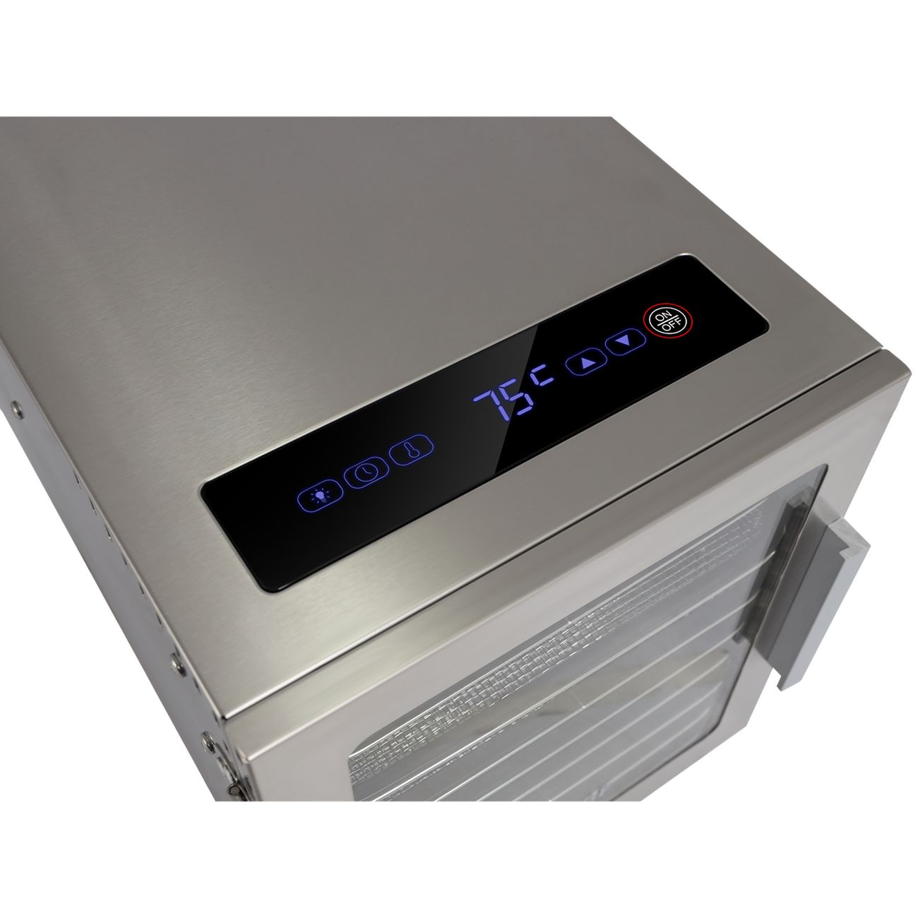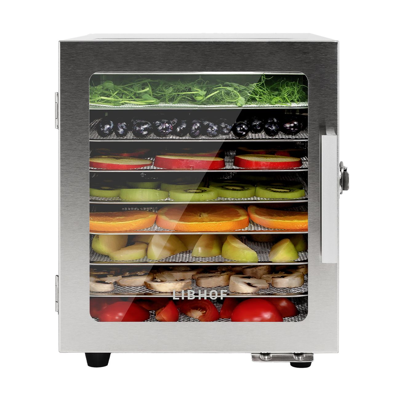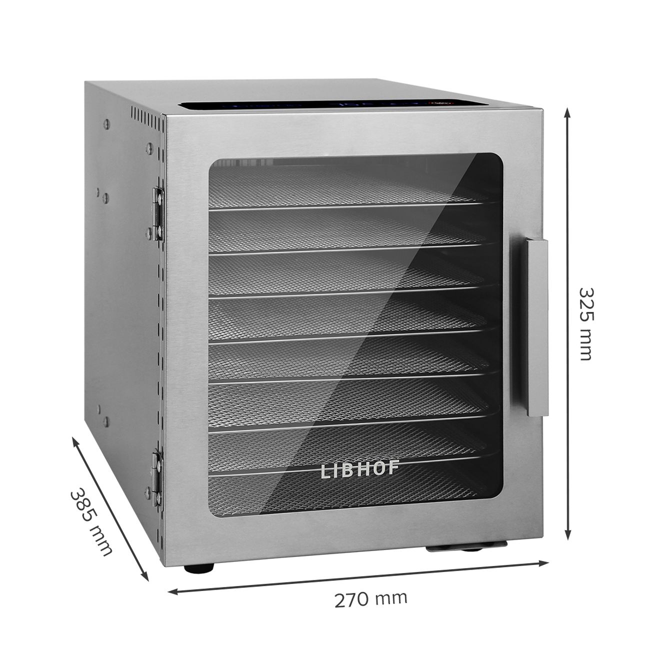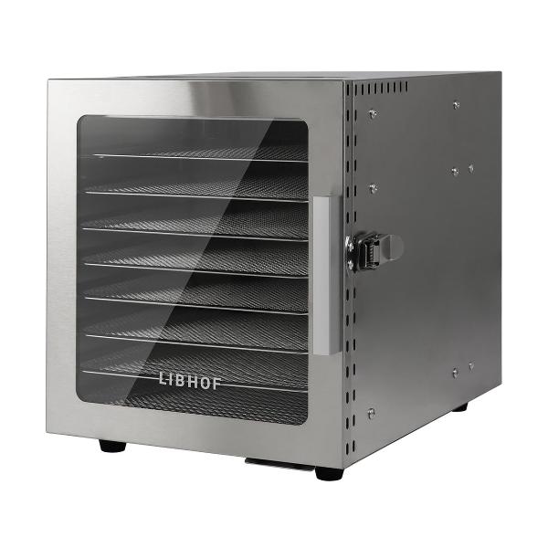 Сушка для фруктов Libhof FDP-08 серебристого цвета оборудована восемью уровнями с высотой 0,25 см. Размер поддона составляет 250х250 мм, диаметр — 25 см. Модель имеет один вентилятор, благодаря которому можно быстро и качественно высушить хлеб, орехи, овощи и фрукты, ягоды, грибы, рыбу, мясо, травы, пастилу и встроенную подсветку. Максимально загружается 3 кг продукта. Устройство мощностью 500 Вт нагревается в диапазоне от 20°С до 90°С. Регулировка воздушного потока не предусмотрена. На цифровом дисплее отображается температура нагрева, индикация включения, количество времени до конца программы и заданная температура. По истечении времени подается звуковой сигнал.