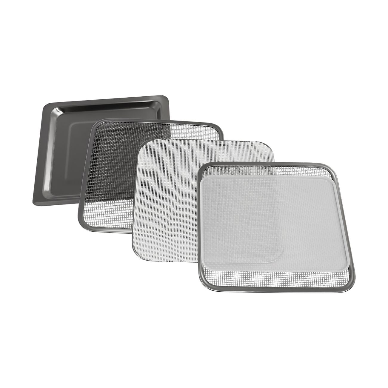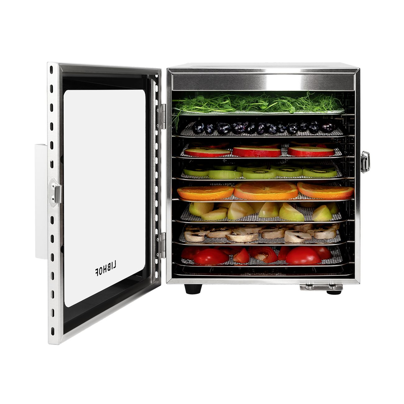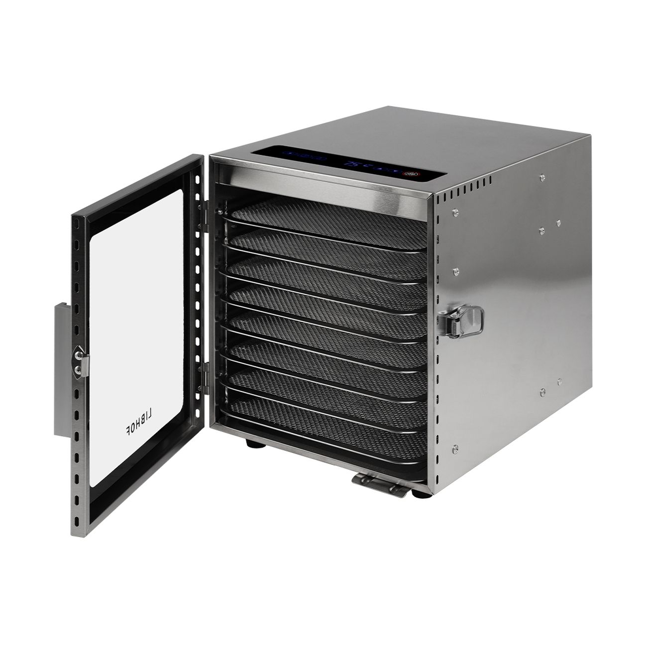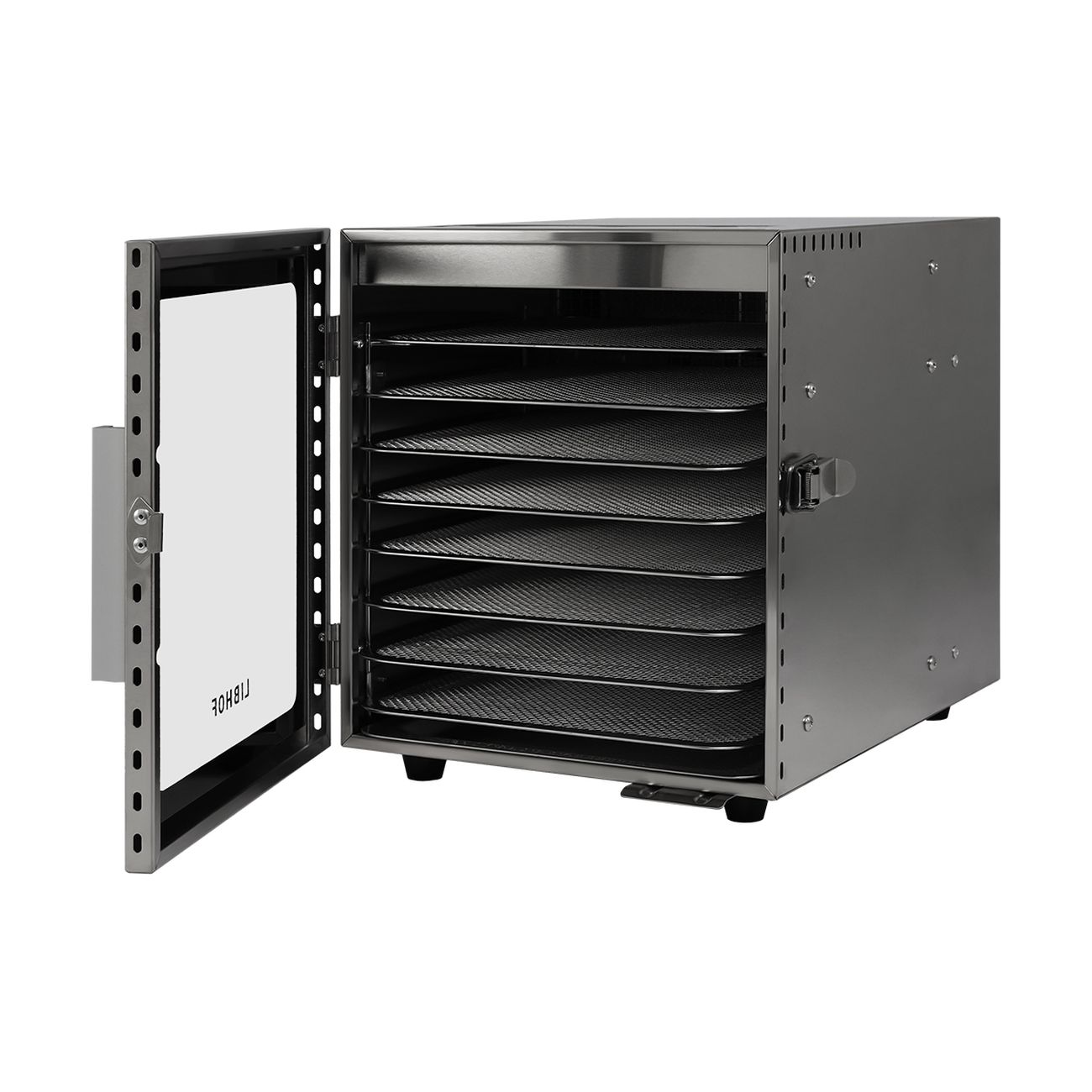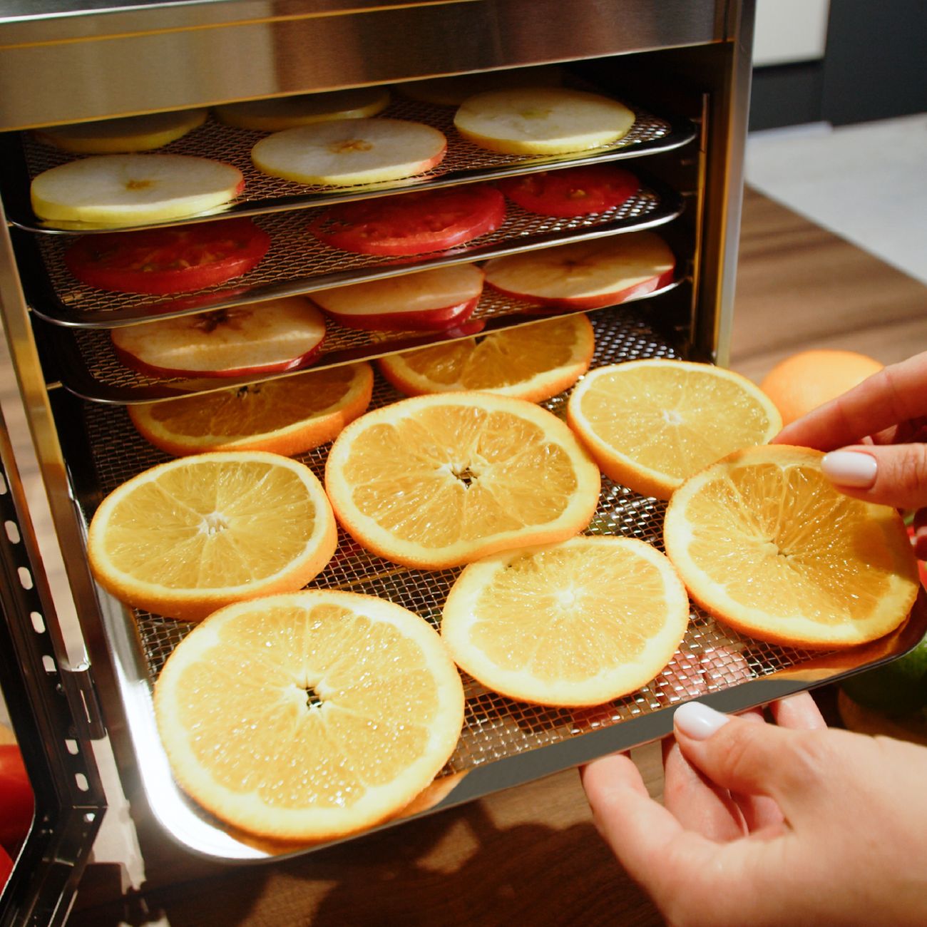 Сушка для фруктов Libhof FDP-08 серебристого цвета оборудована восемью уровнями с высотой 0,25 см. Размер поддона составляет 250х250 мм, диаметр — 25 см. Модель имеет один вентилятор, благодаря которому можно быстро и качественно высушить хлеб, орехи, овощи и фрукты, ягоды, грибы, рыбу, мясо, травы, пастилу и встроенную подсветку. Максимально загружается 3 кг продукта. Устройство мощностью 500 Вт нагревается в диапазоне от 20°С до 90°С. Регулировка воздушного потока не предусмотрена. На цифровом дисплее отображается температура нагрева, индикация включения, количество времени до конца программы и заданная температура. По истечении времени подается звуковой сигнал.