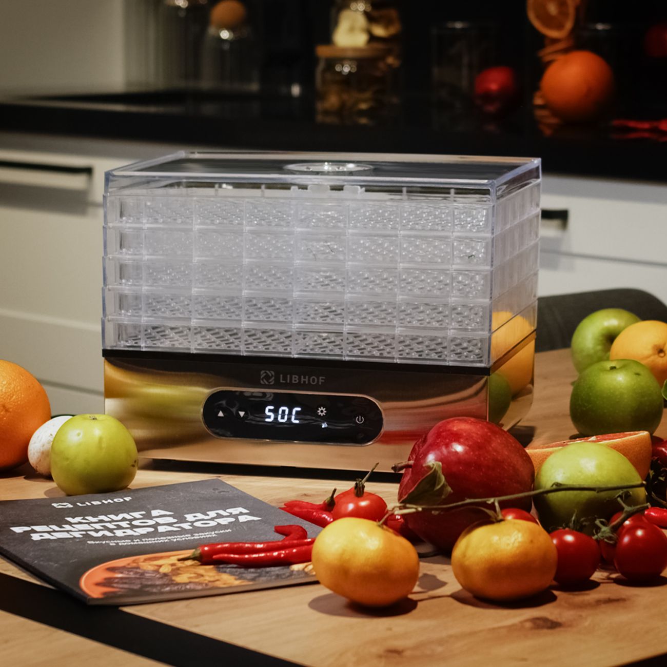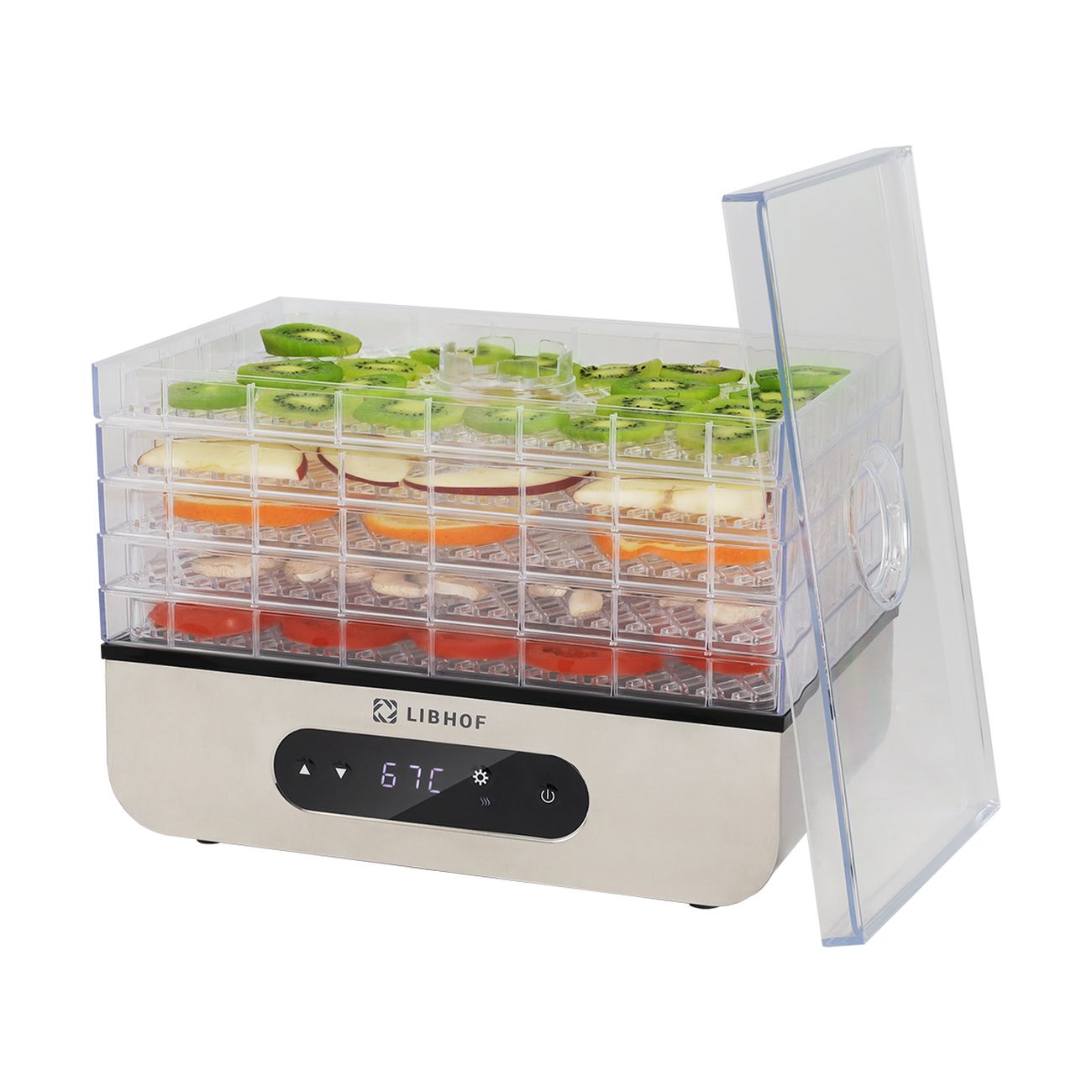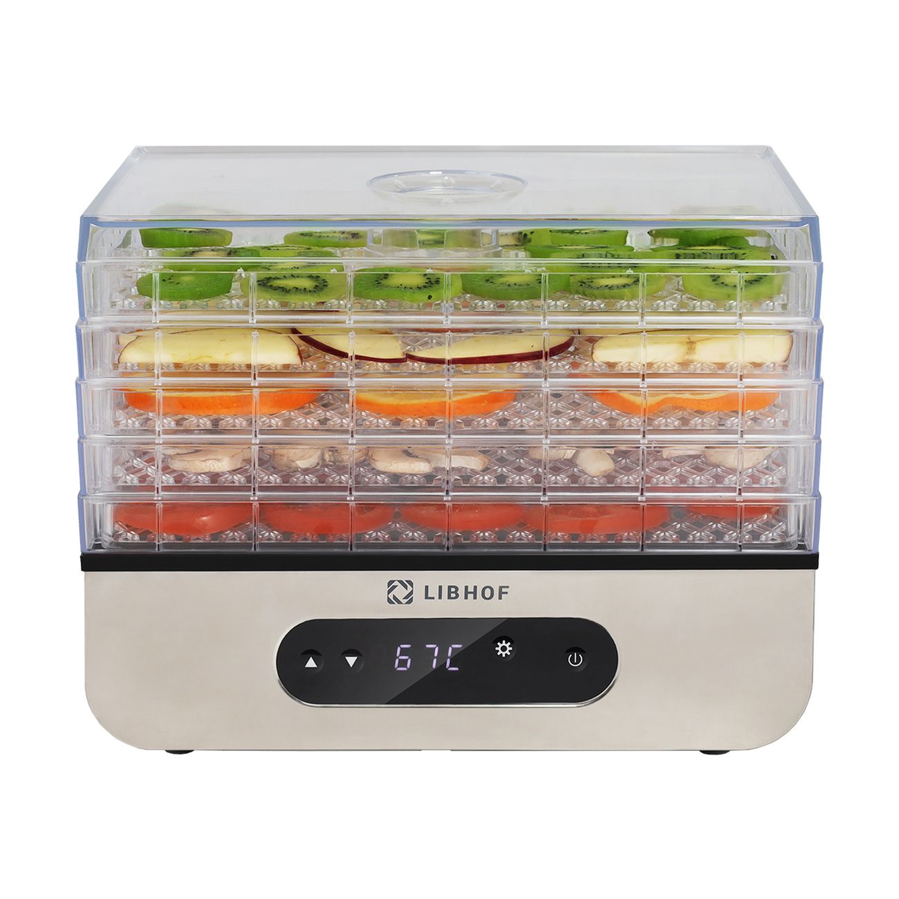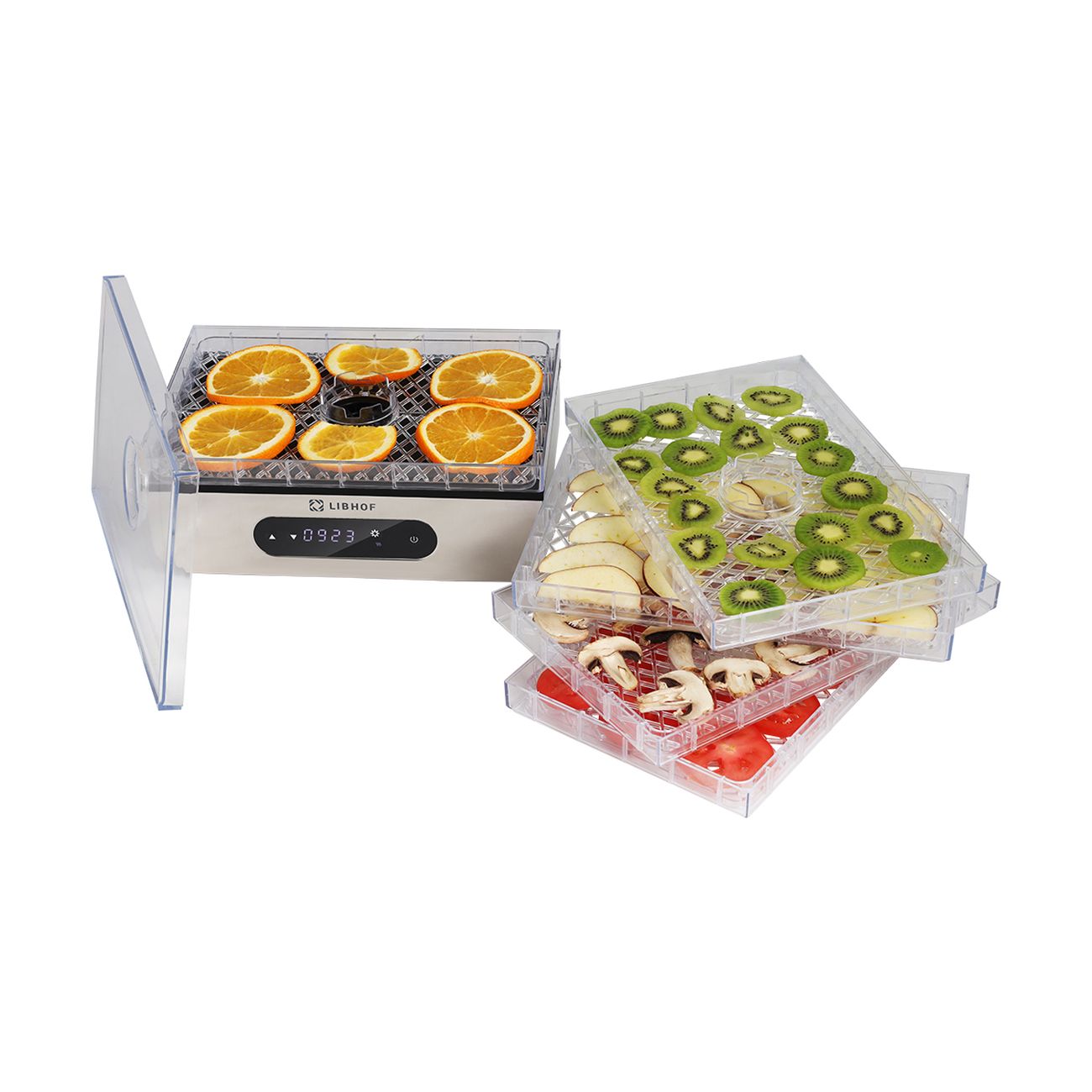 Сушка для фруктов Libhof FDS-051 — модель, поддерживающая регулировку температуры нагрева от 35°C до 70°C. Может использоваться для обработки целого ряда продуктов, в том числе орехов, ягод, фруктов и овощей, мяса и рыбы. Сенсорное управление интуитивно простое и удобное. Вся информация высвечивается на компактном LED-дисплее. Количество уровней (максимальное) — пять. Каждый поддон выполнен из прозрачного пластика. Размеры составляют 29х19 см, внутренняя высота поддона равна 2,5 см.
