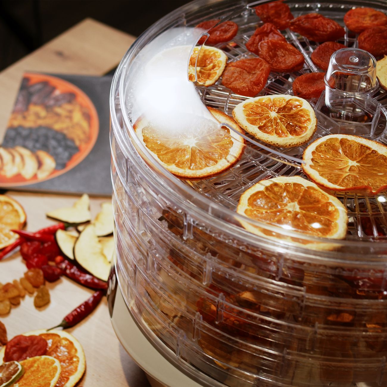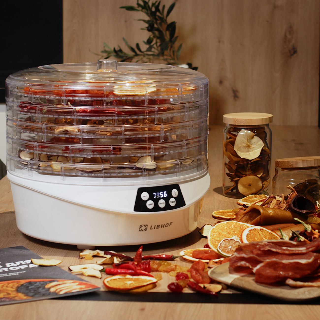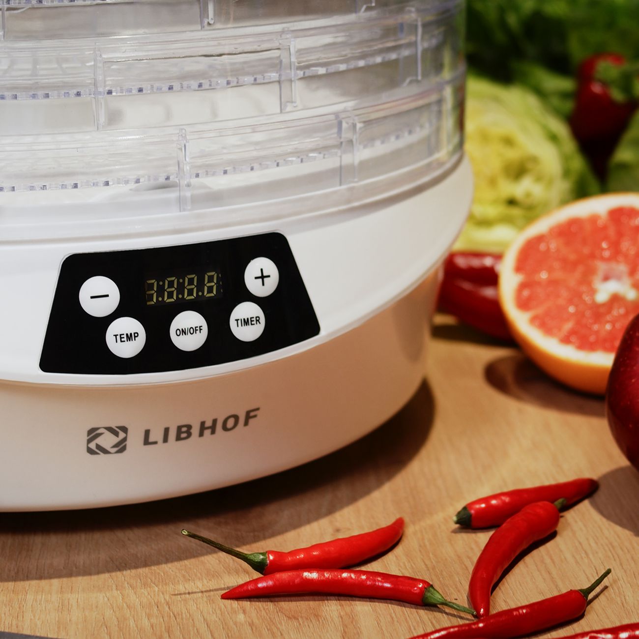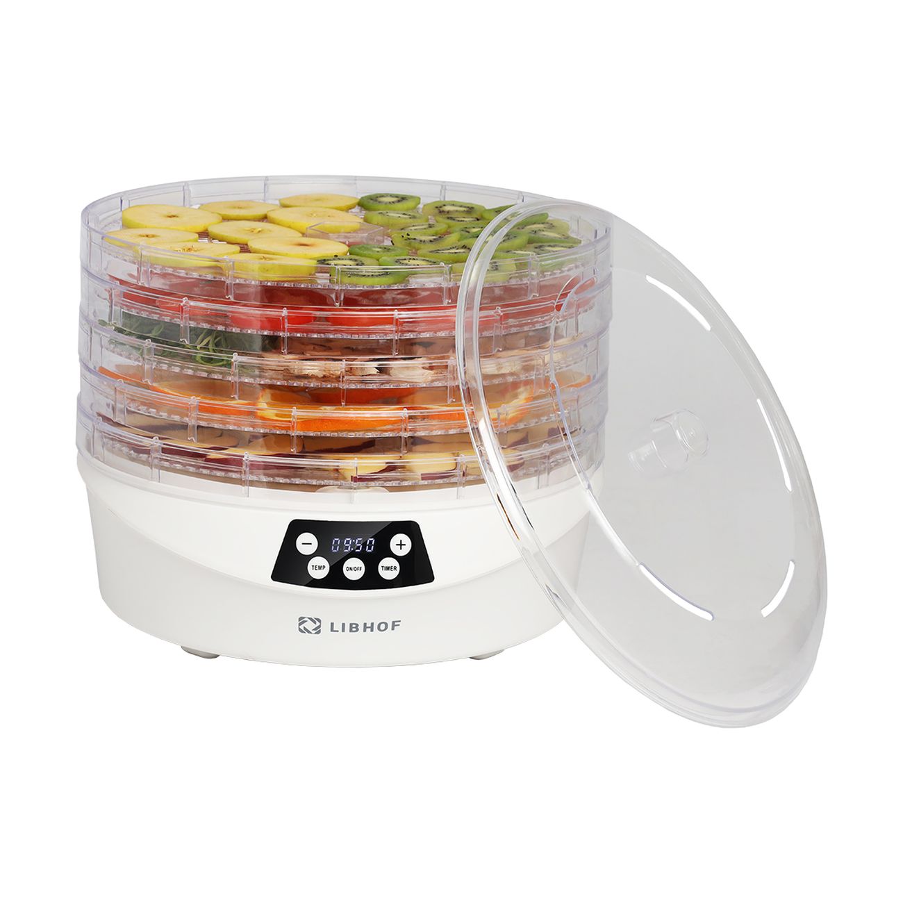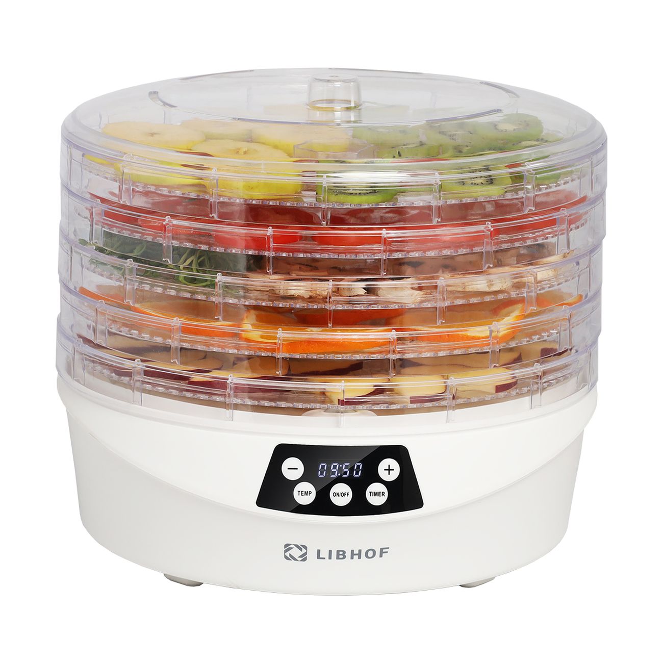 Сушка для фруктов Libhof FDS-053 — модель, рассчитанная на обработку хлеба, орехов, фруктов, овощей, мяса. Возможна регулировка температуры в пределах от 35°C до 70°C. Встроенный вентилятор обеспечивает распределение горячего воздуха по всему внутреннему пространству — это способствует равномерной сушке содержимого. Уровней поддонов — пять, диаметр — 34,2 см, внутренняя высота — 3 см. Материалом для их изготовления служит пластик. Максимальная загрузка устройства достигает 2,5 кг. При перегреве сушилка отключается в автоматическом режиме, что предотвращает ее преждевременный выход из строя.