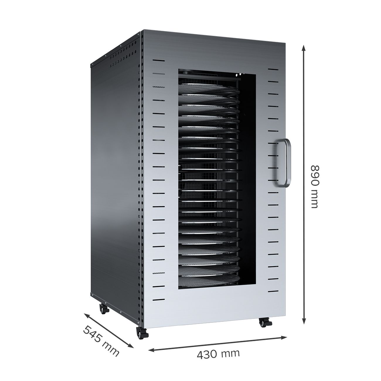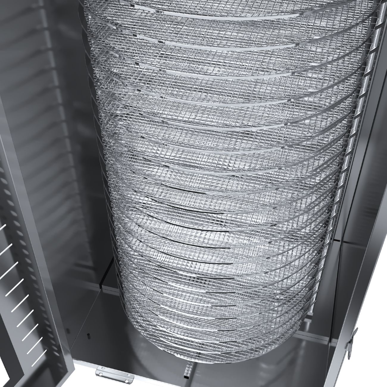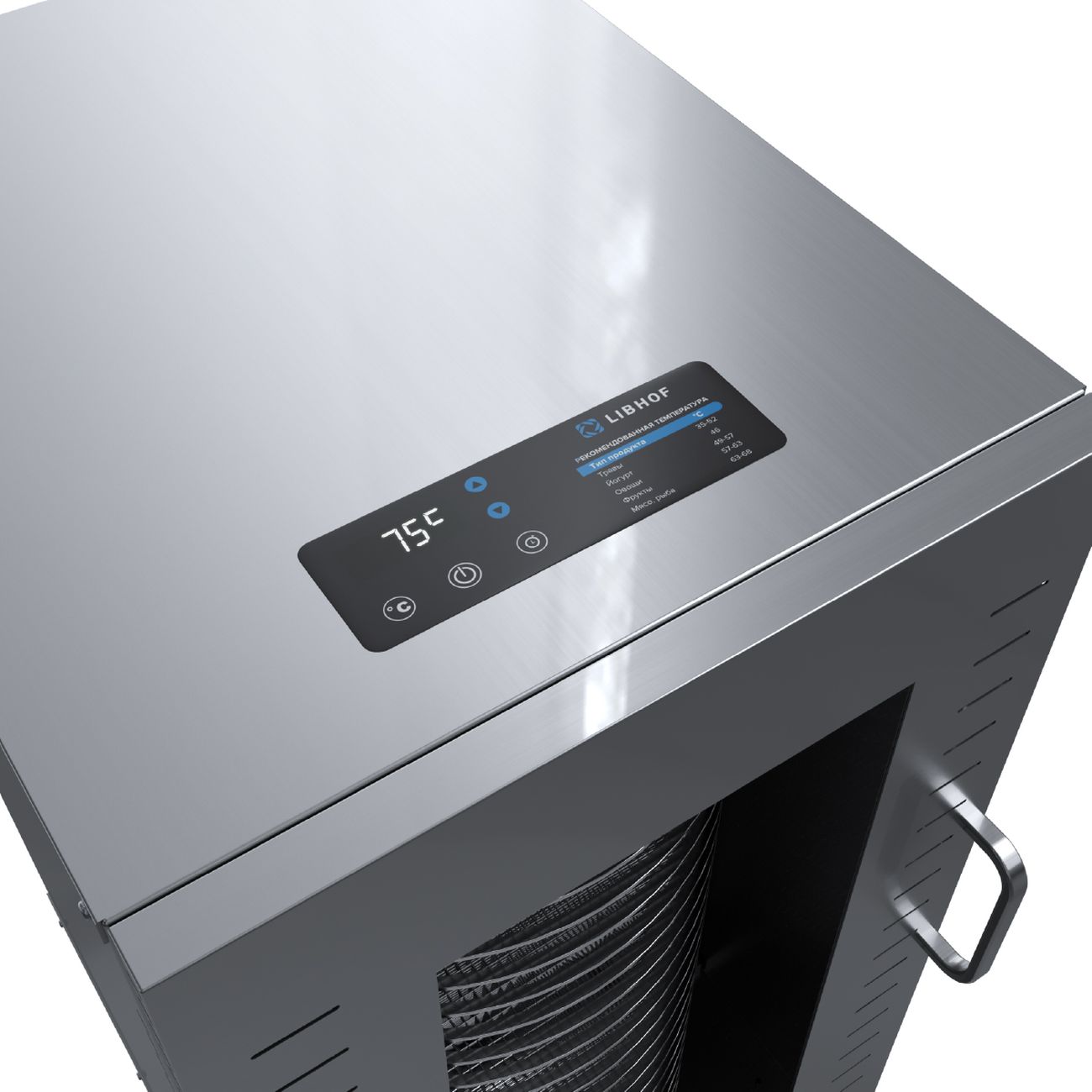 Серебристая сушка для фруктов Libhof FDT-22R выполнена в габаритных размерах 43х89х54,5 см и оборудована 22 уровнями для установки вращающихся поддонов. Потребляемая мощность устройства 2500 Вт и три встроенных вентилятора позволяют высушить хлеб, орехи, фрукты, овощи, ягоды, рыбу, мясо, грибы и приготовить пастилу. Регулировка воздушного потока отсутствует. Максимальная загрузка составляет 28 кг. Температура нагрева варьируется от 20°С до 90°С. При перегреве устройство автоматически выключается.
