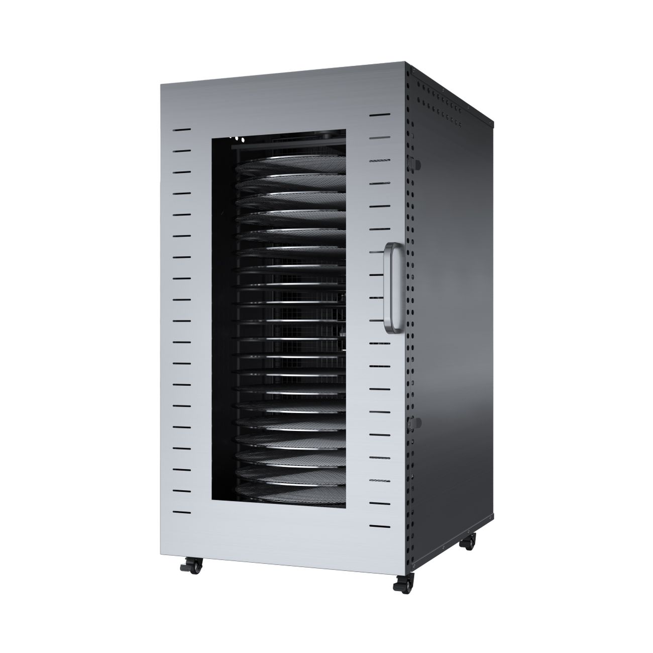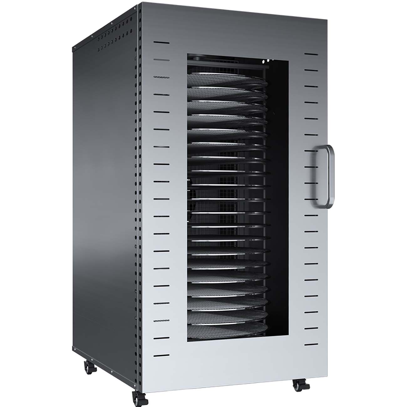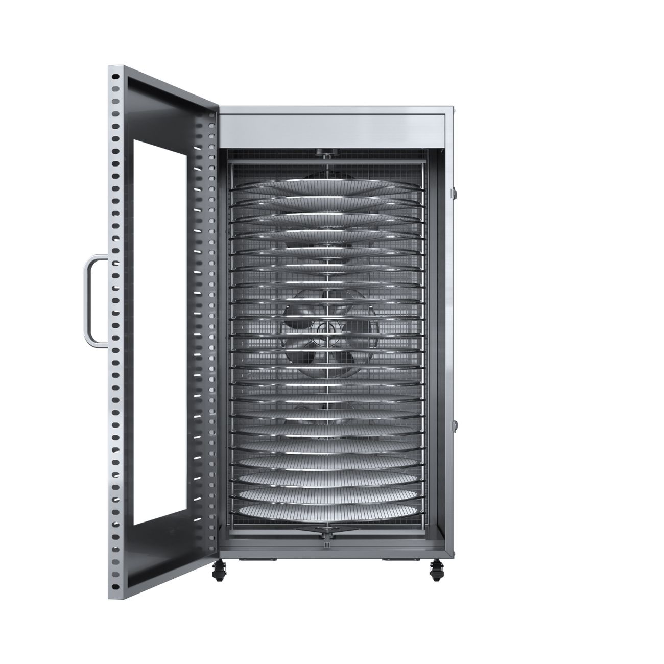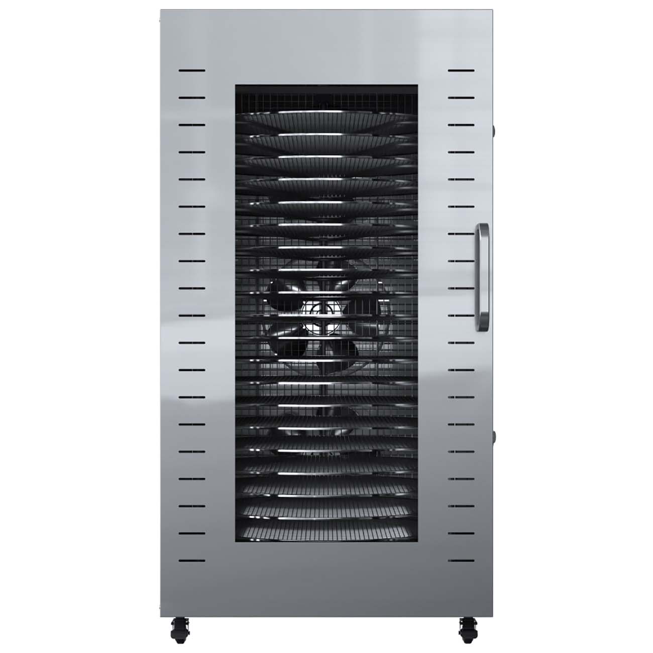 Серебристая сушка для фруктов Libhof FDT-22R выполнена в габаритных размерах 43х89х54,5 см и оборудована 22 уровнями для установки вращающихся поддонов. Потребляемая мощность устройства 2500 Вт и три встроенных вентилятора позволяют высушить хлеб, орехи, фрукты, овощи, ягоды, рыбу, мясо, грибы и приготовить пастилу. Регулировка воздушного потока отсутствует. Максимальная загрузка составляет 28 кг. Температура нагрева варьируется от 20°С до 90°С. При перегреве устройство автоматически выключается.