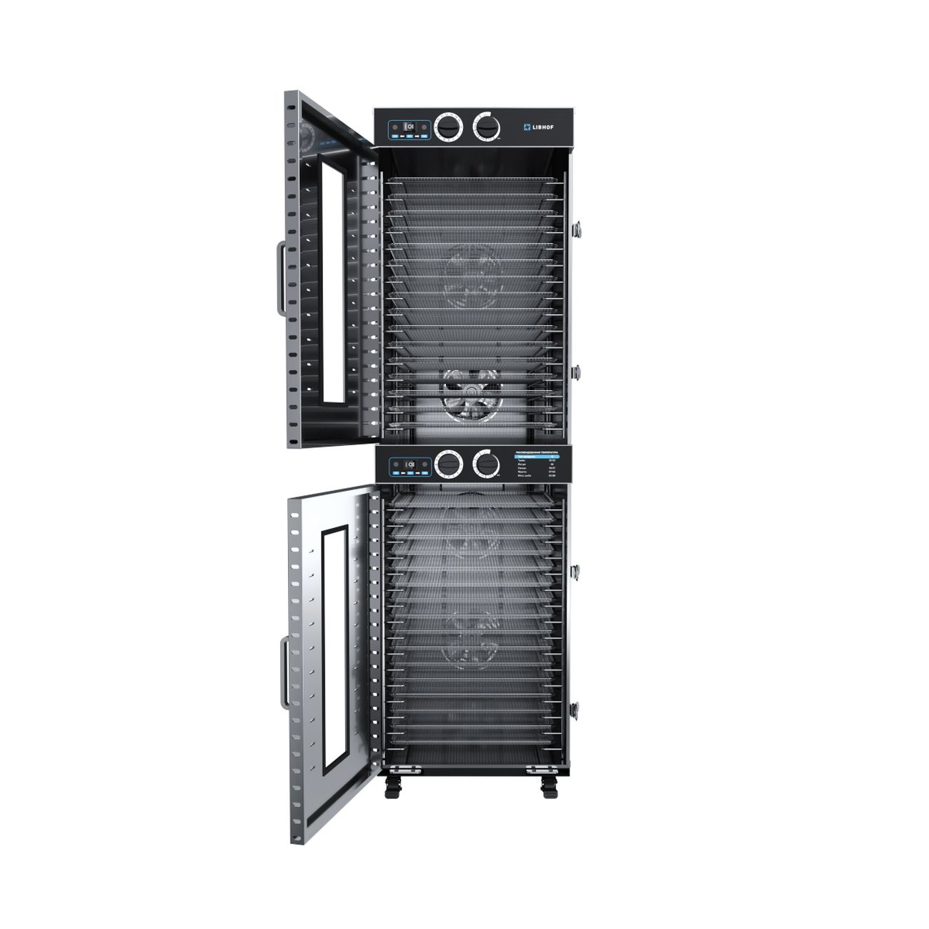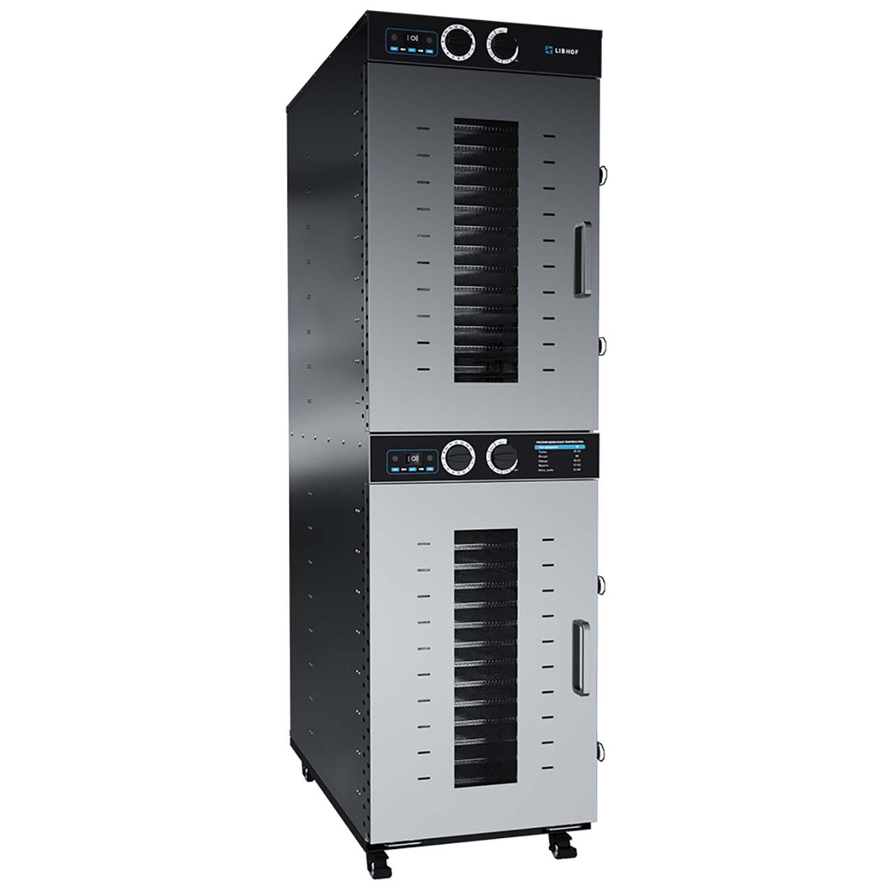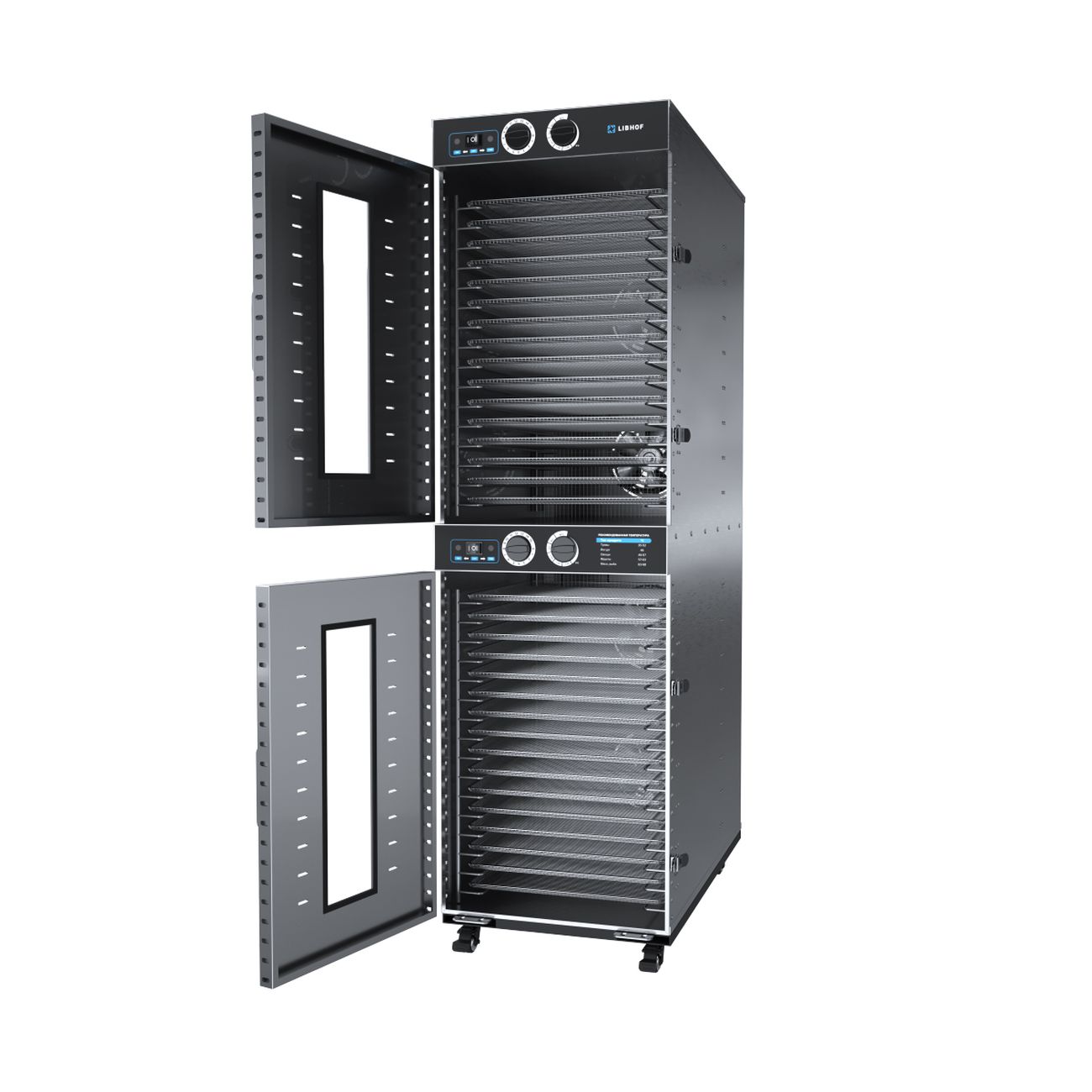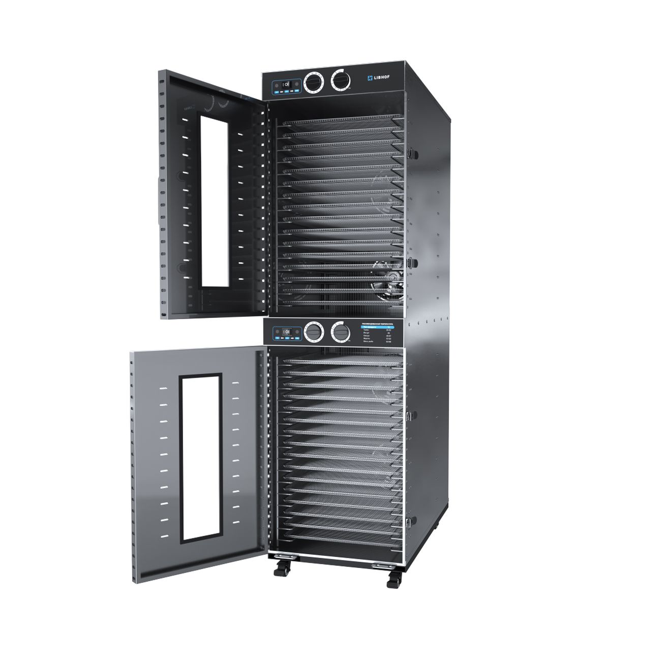 Сушка для фруктов Libhof FDT-32D выполнена в виде двух раздельных камер. Внутри устанавливаются 32 поддона из нержавеющей стали диаметром 39,8 см. Внутренняя высота поддона равна 0,18 см. Дегидратор применяется для сушки фруктов, овощей, ягод, хлеба, орехов, рыбы, мяса, грибов, трав, приготовления пастилы. Максимальная загрузка равна 50 кг. Температура устанавливается и регулируется в диапазоне от 40°C до 90°C. Время сушки регулируется до 15 ч.