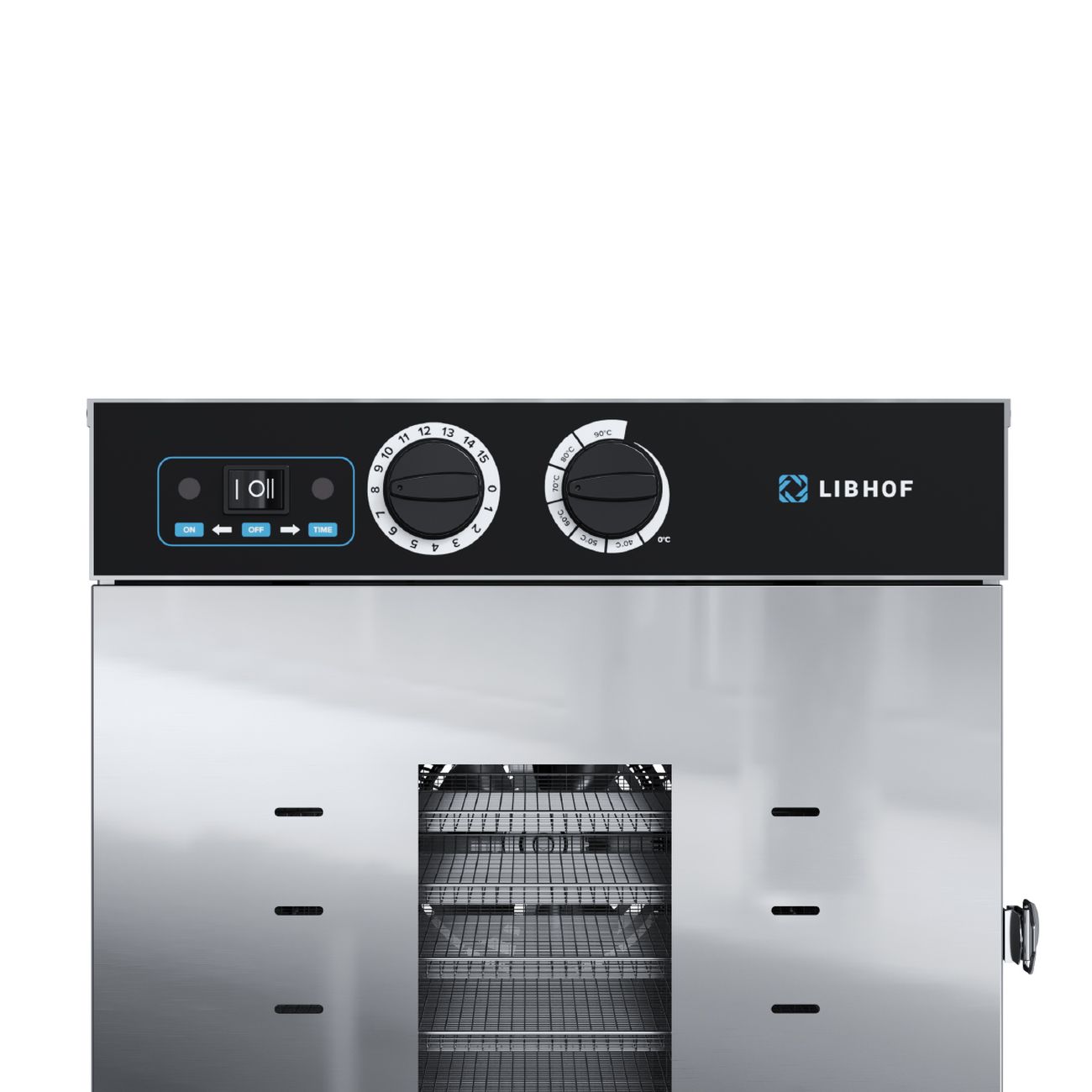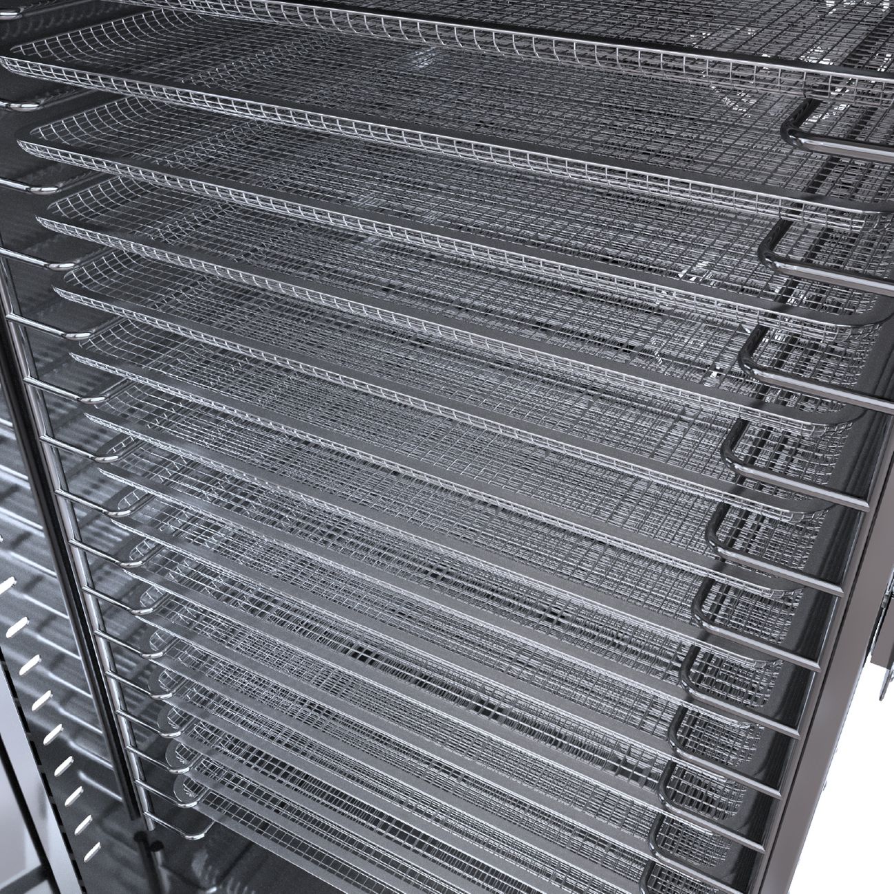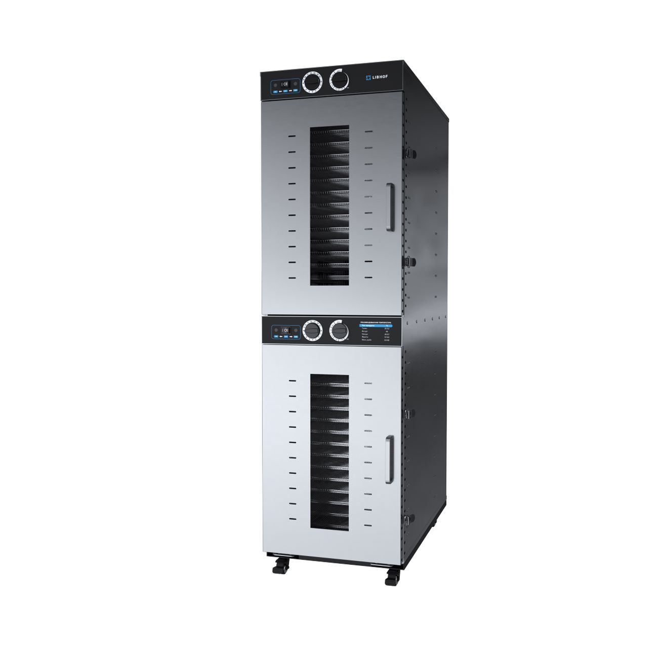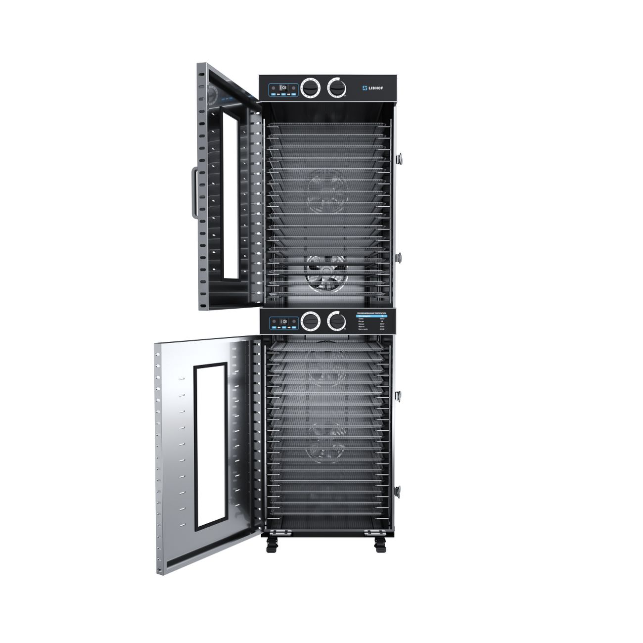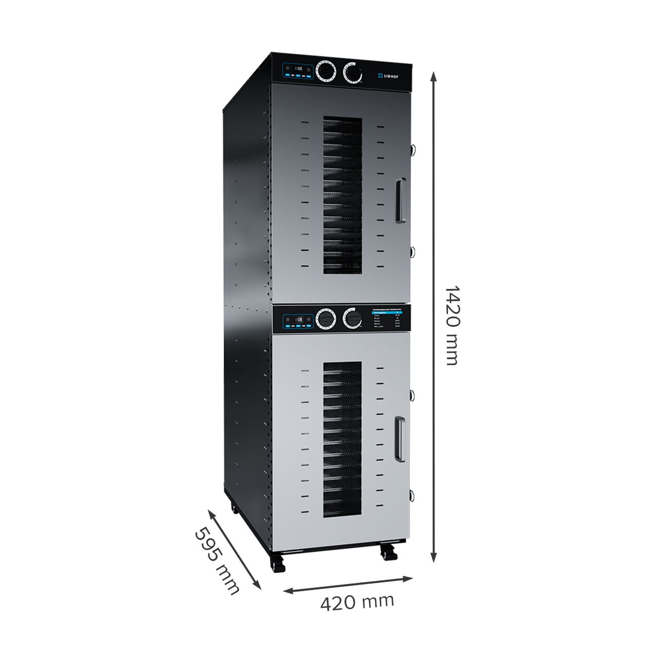 Сушка для фруктов Libhof FDT-32D выполнена в виде двух раздельных камер. Внутри устанавливаются 32 поддона из нержавеющей стали диаметром 39,8 см. Внутренняя высота поддона равна 0,18 см. Дегидратор применяется для сушки фруктов, овощей, ягод, хлеба, орехов, рыбы, мяса, грибов, трав, приготовления пастилы. Максимальная загрузка равна 50 кг. Температура устанавливается и регулируется в диапазоне от 40°C до 90°C. Время сушки регулируется до 15 ч.
